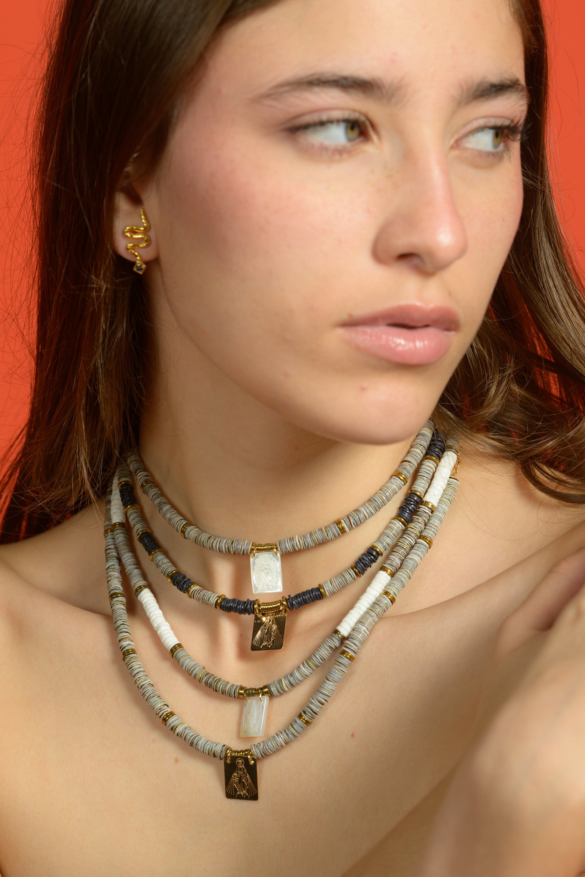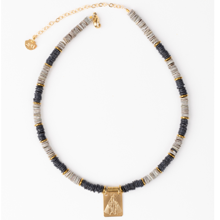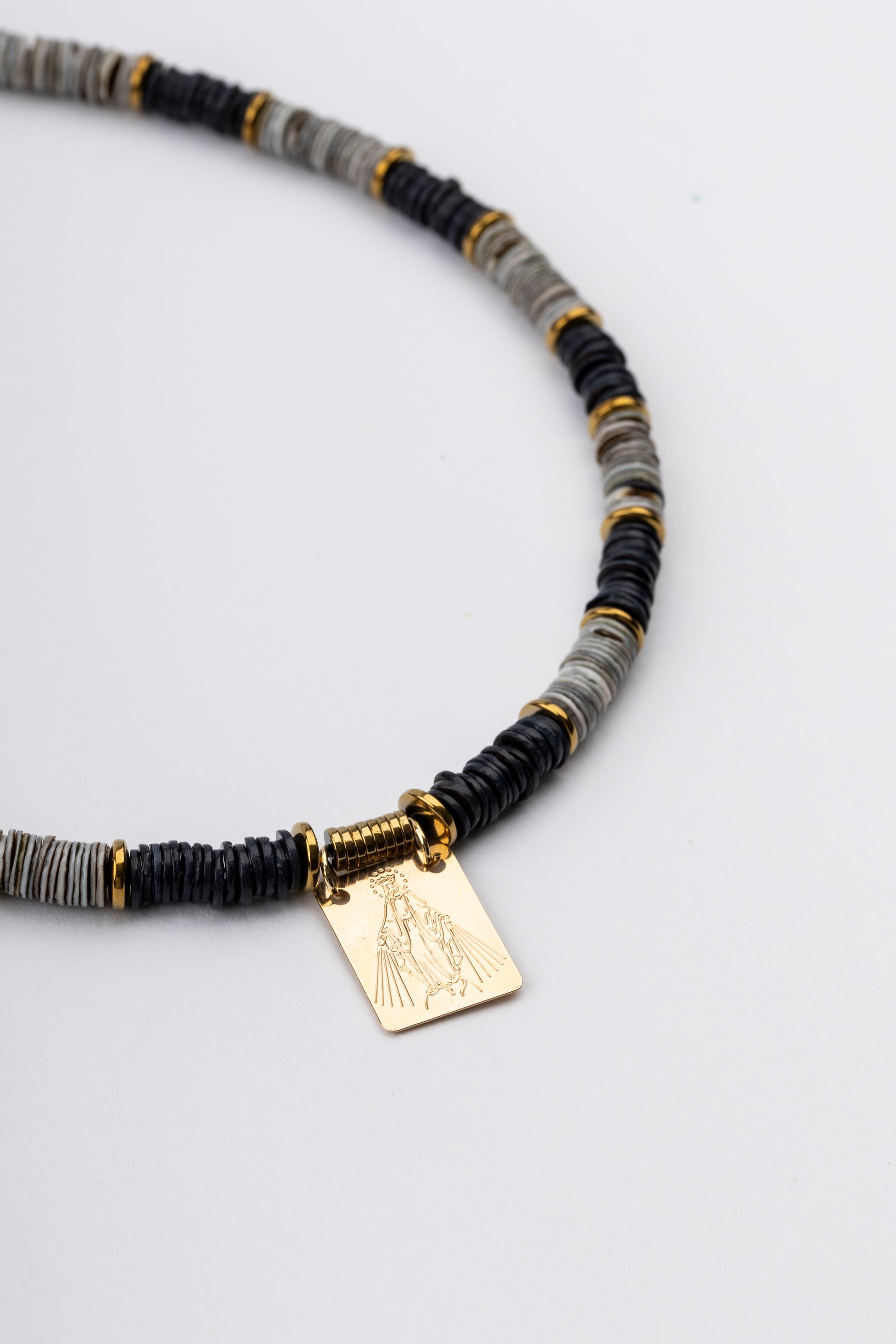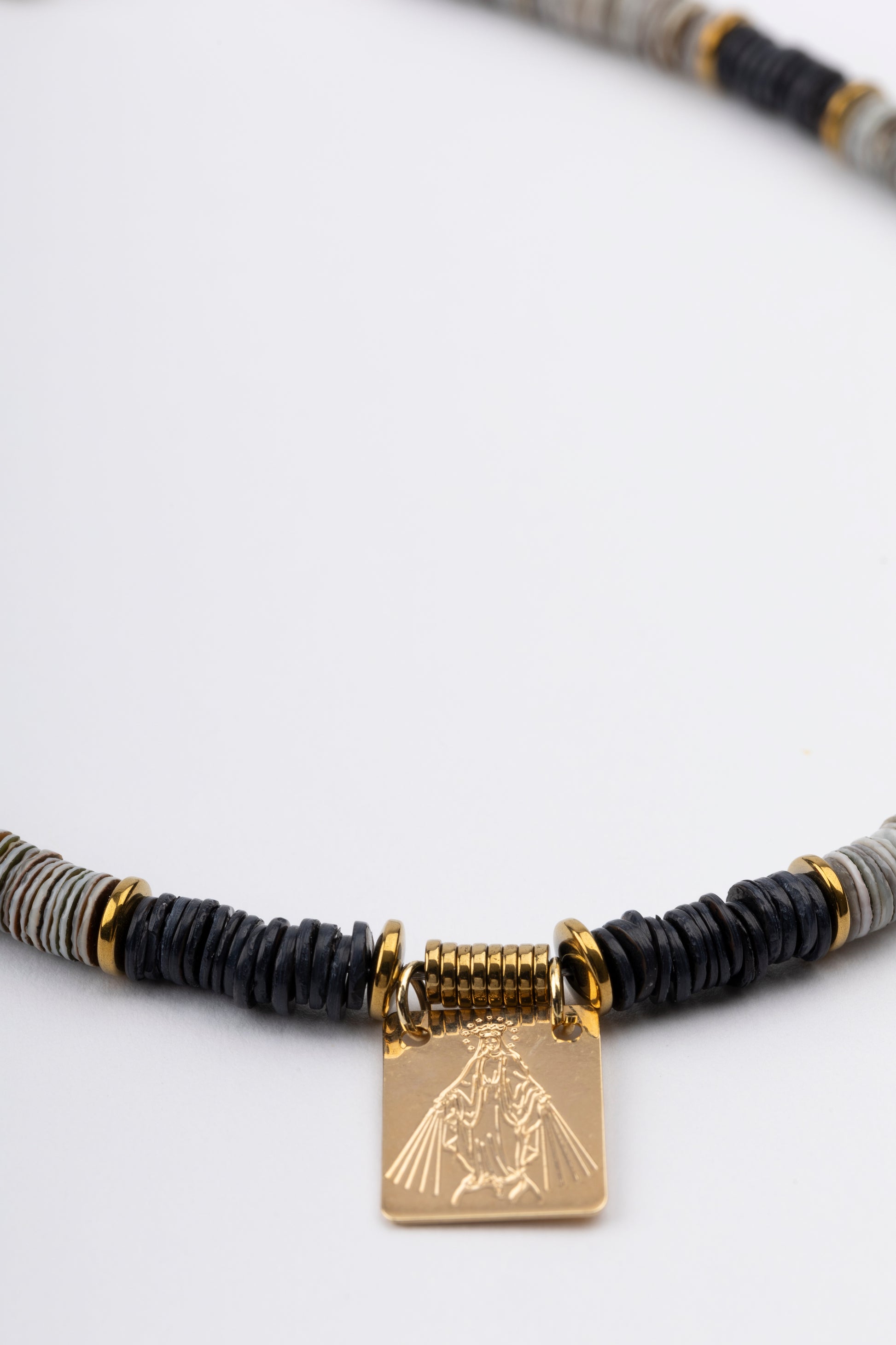 Natural Grey and Cream Sea Shell Puka Necklace with Gold Plated Virgin Scapular, Golden Volcanic-Derived Hematite Rondelles and Adjustable Gold Plated Brass Cable Chain.