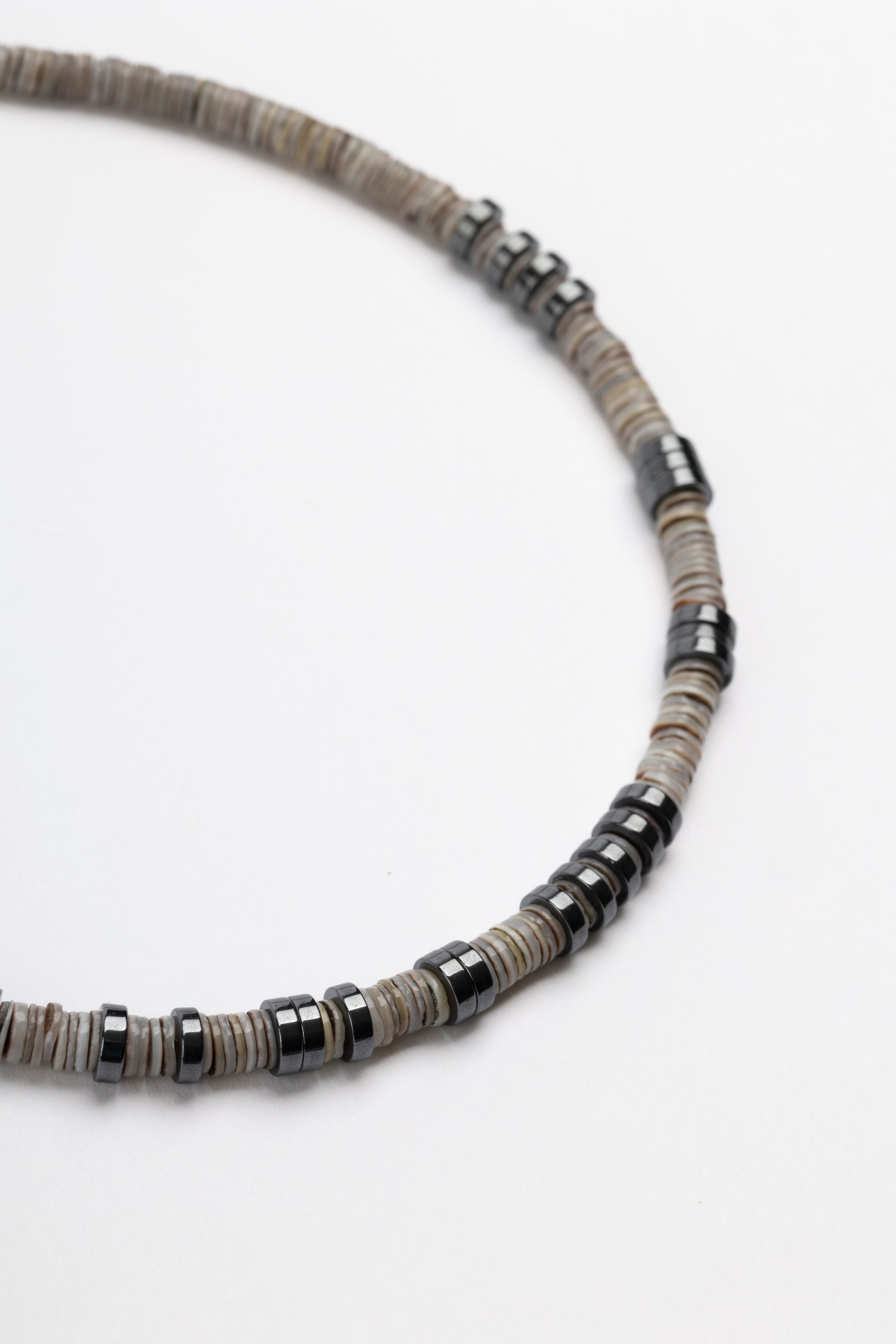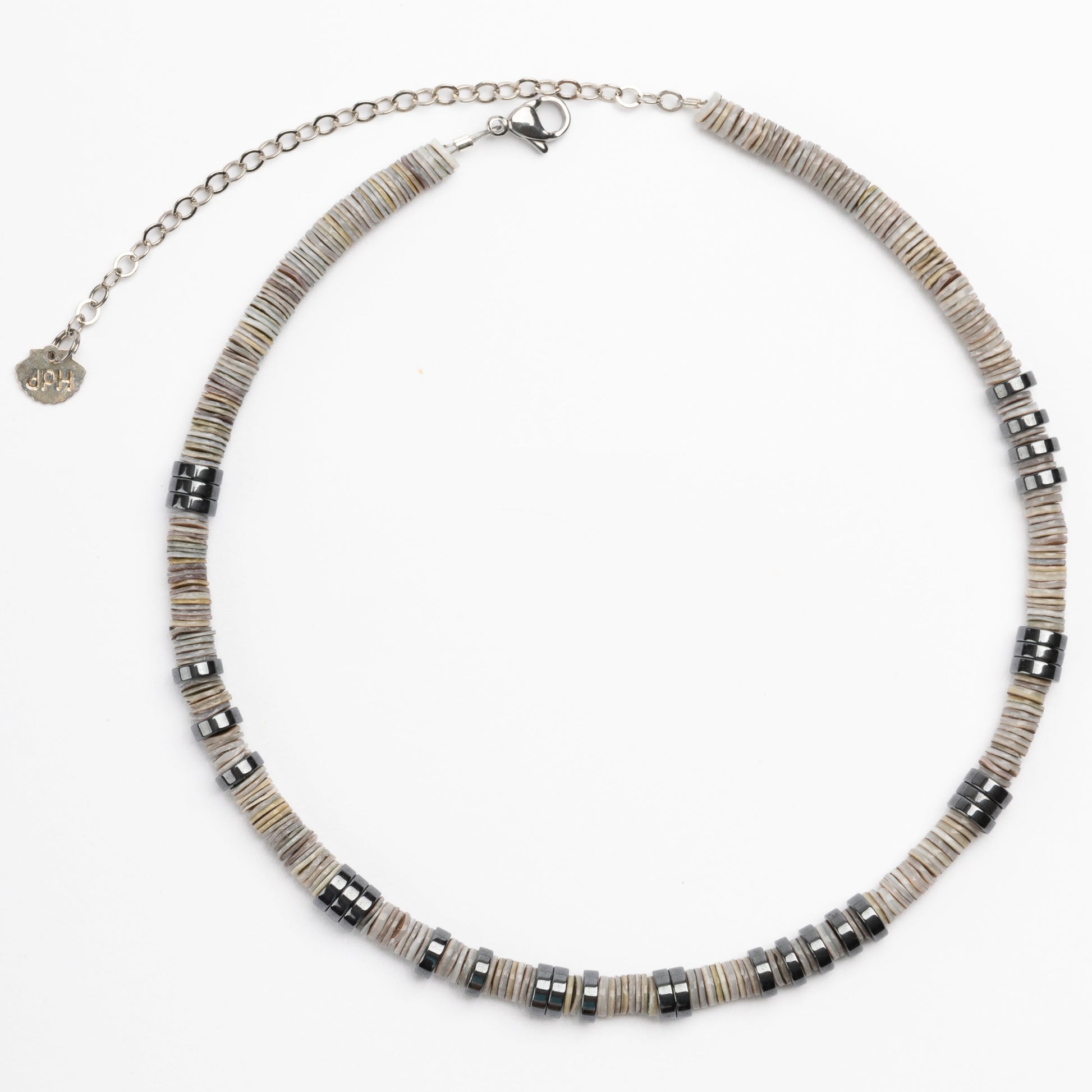 Oyster Shell Puka Necklace with Black Volcanic-Derived Hematite Rondelles and Adjustable Platinum Plated Brass Cable Chain.