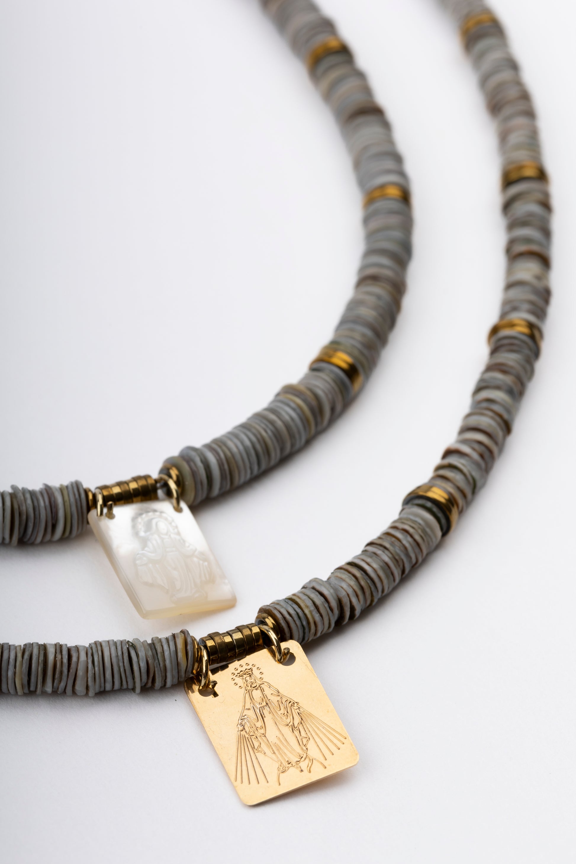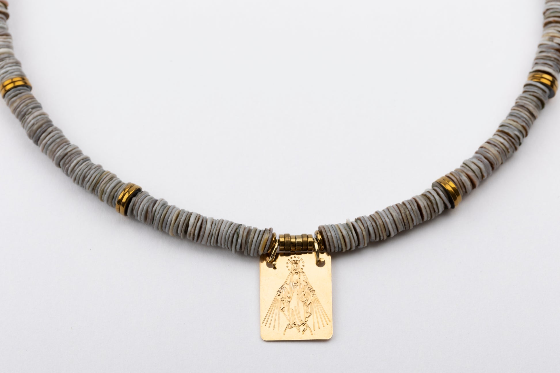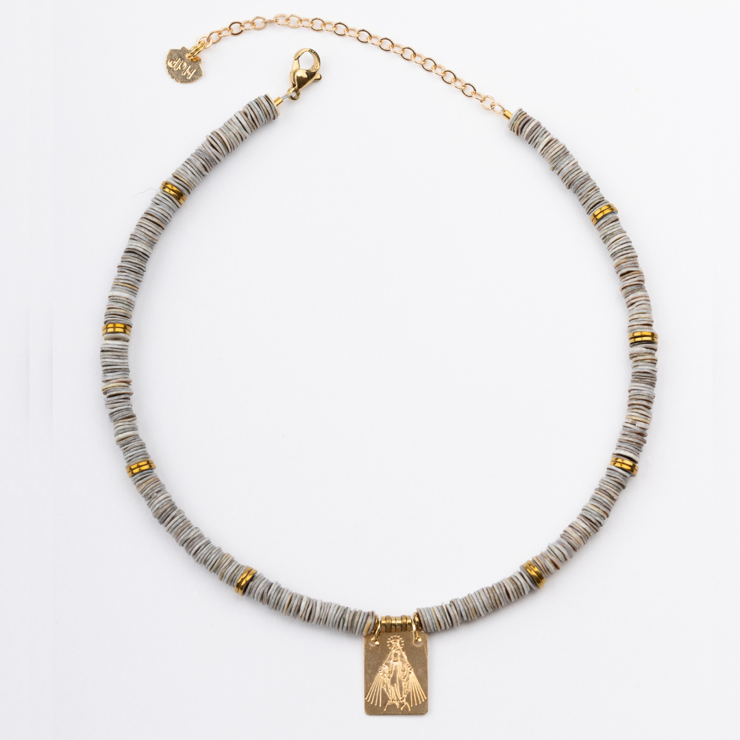 Oyster Sea Shell Puka Necklace with Gold Plated Virgin Scapular, Golden Volcanic-Derived Hematite Rondelles and Adjustable Gold Plated Brass Cable Chain.
