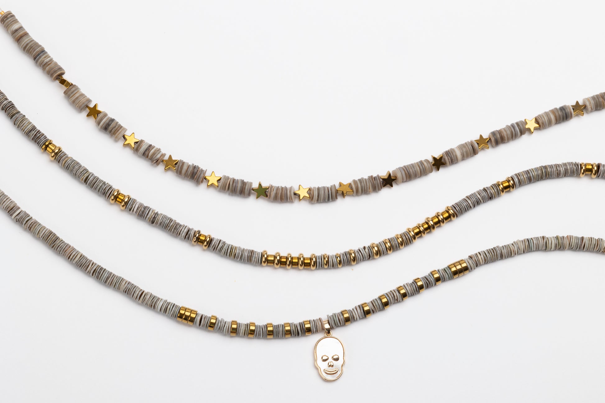 The ANIA Collection features delicate grey shell pukas that capture the calm beauty of the sea.