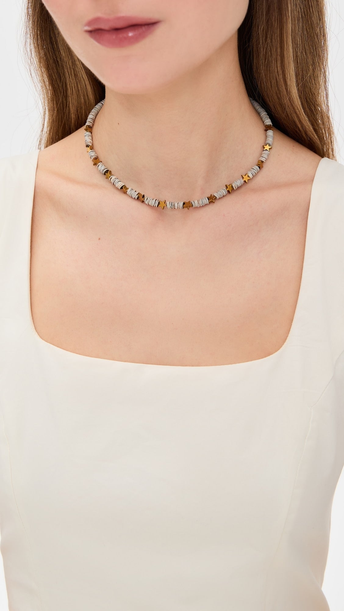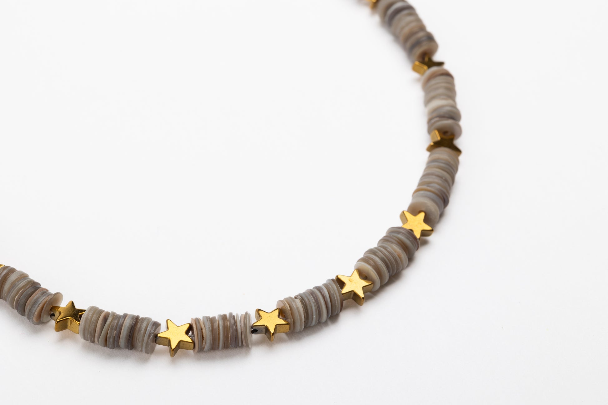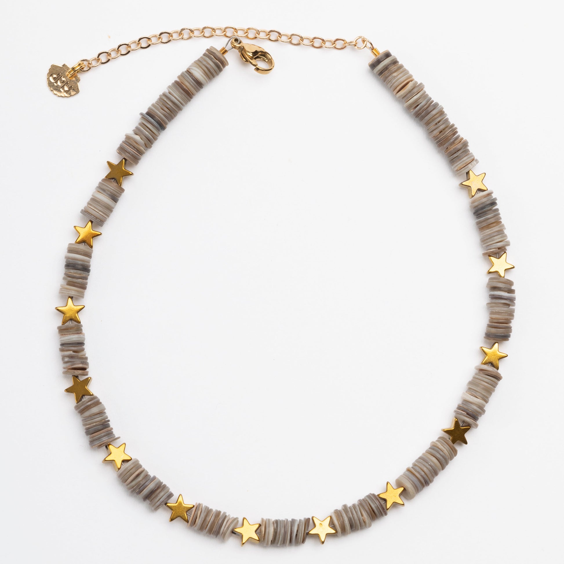 Oyster Shell Puka Necklace with Golden Volcanic-Derived Hematite Stars and Adjustable Gold Plated Brass Cable Chain.