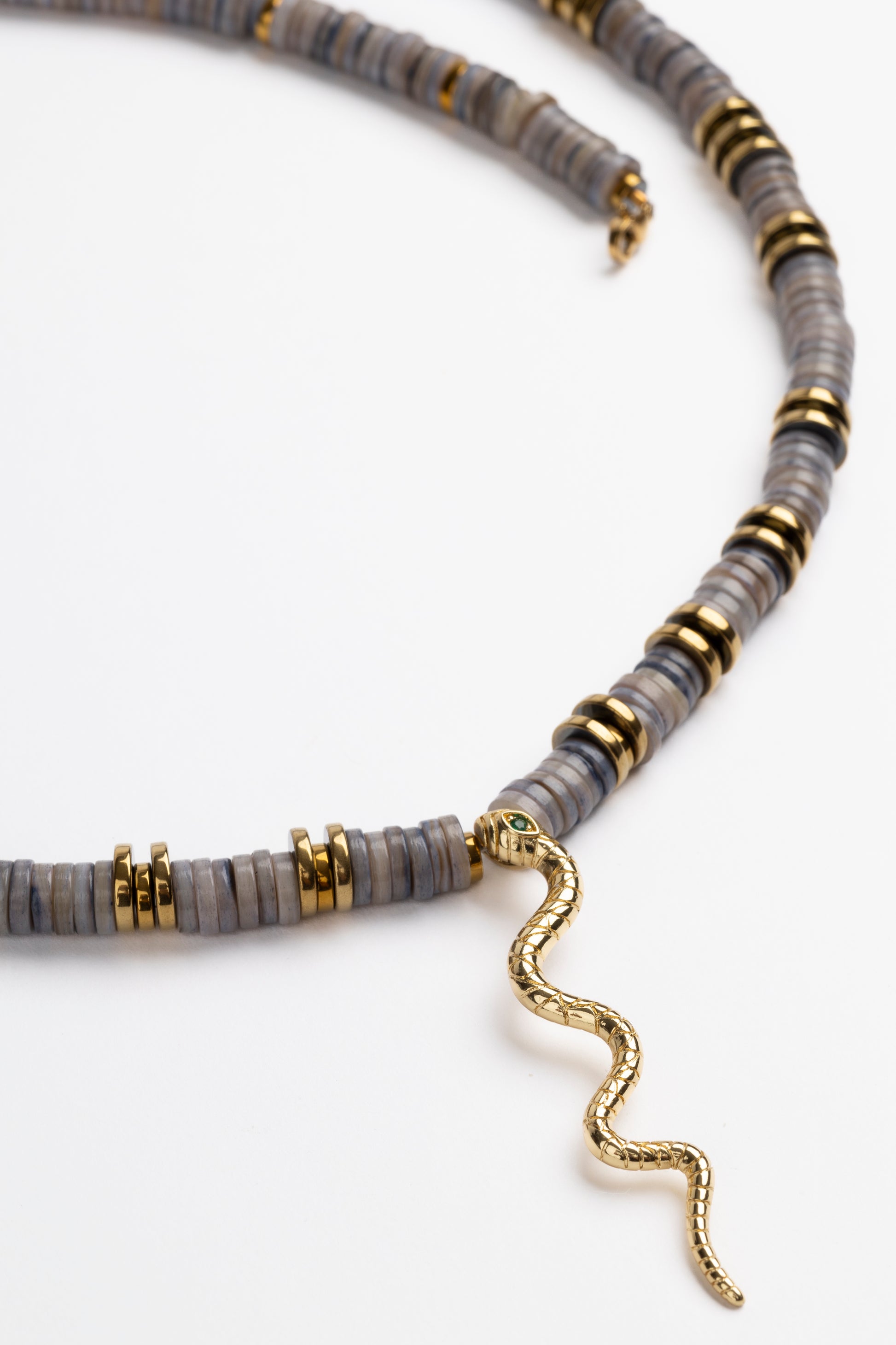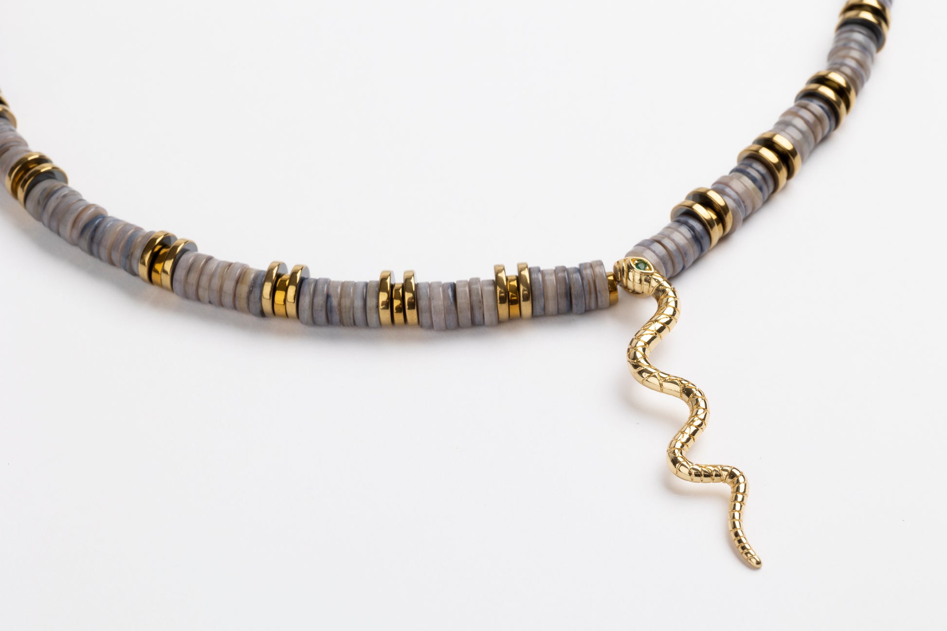 Oyster Shell Long Puka Necklace with Gold Plated Snake, Golden Volcanic-Derived Hematite Rondelles and Adjustable Gold Plated Brass Cable Chain.