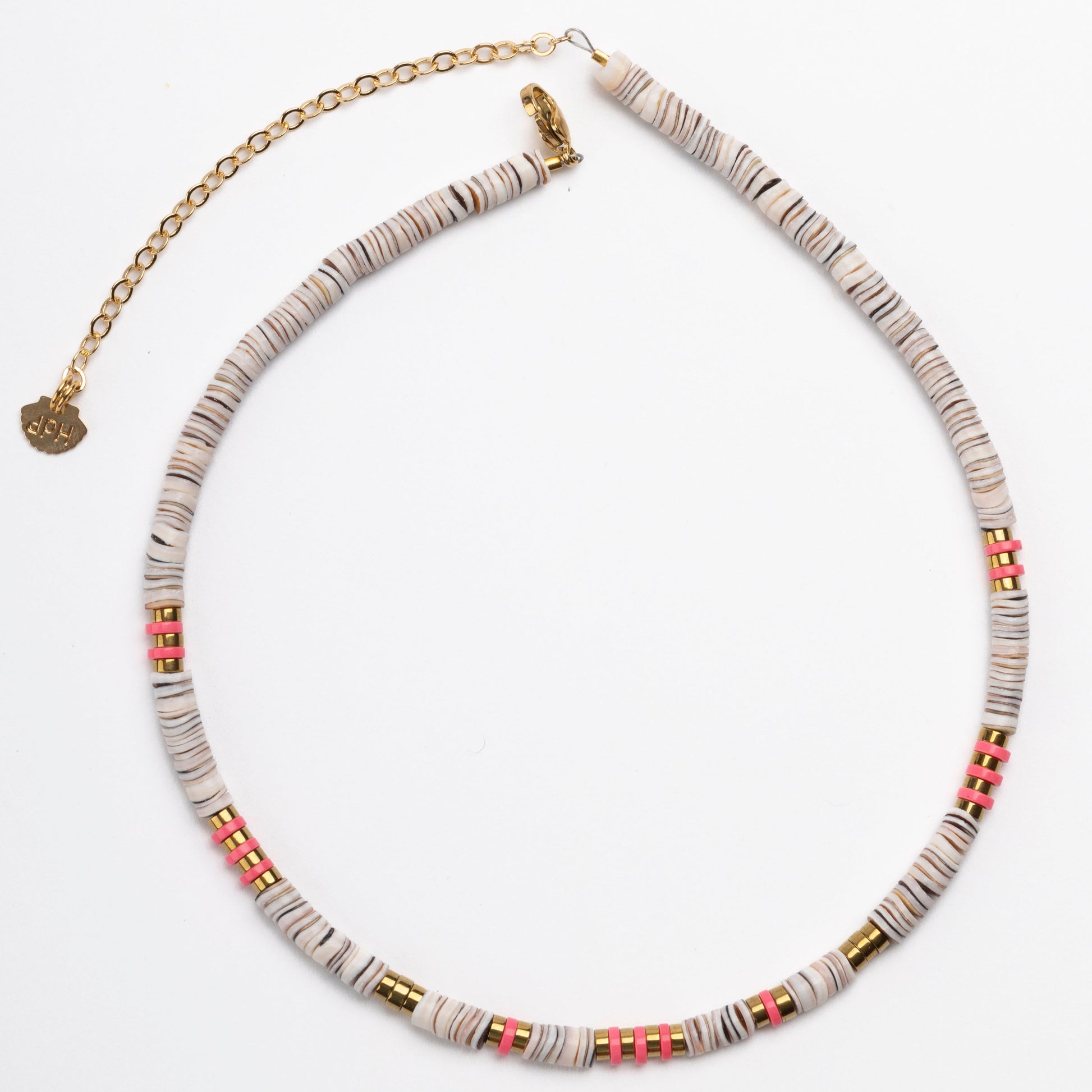 Oyster Shell Puka Necklace with Natural Agate Beads, Golden Volcanic-Derived Hematite Rondelles and Adjustable Gold Plated Brass Cable Chain.