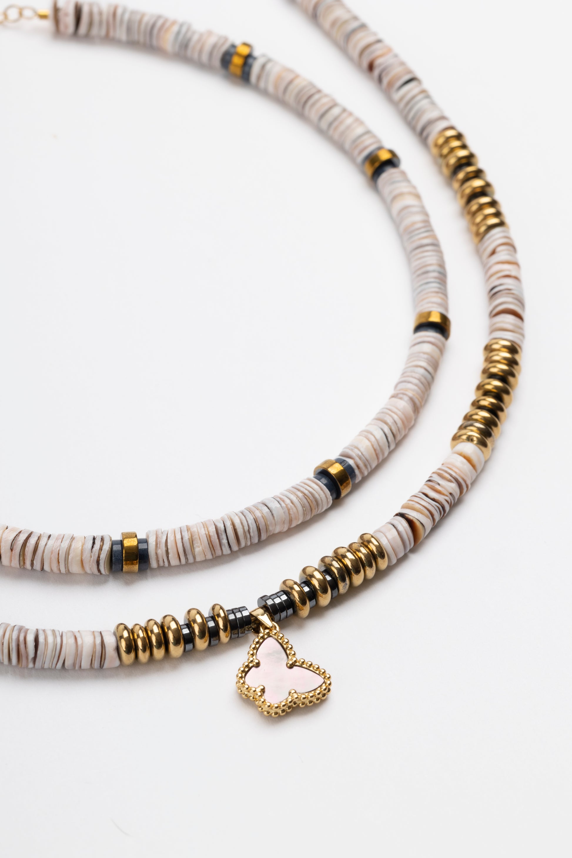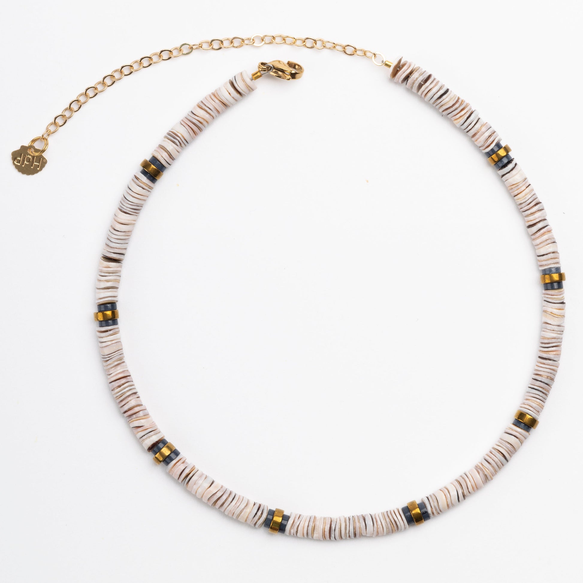 Oyster shell Puka necklace with agate beads, golden volcanic- derived hematite rondelles and adjustable gold plated brass cable chain.
