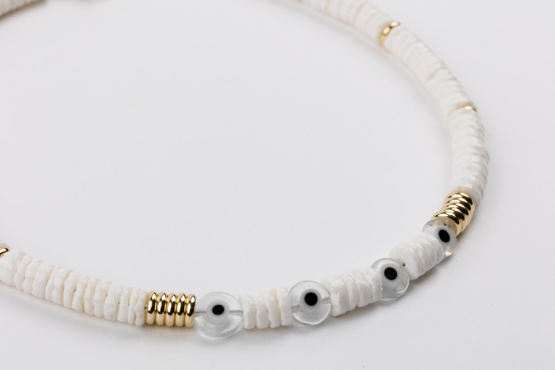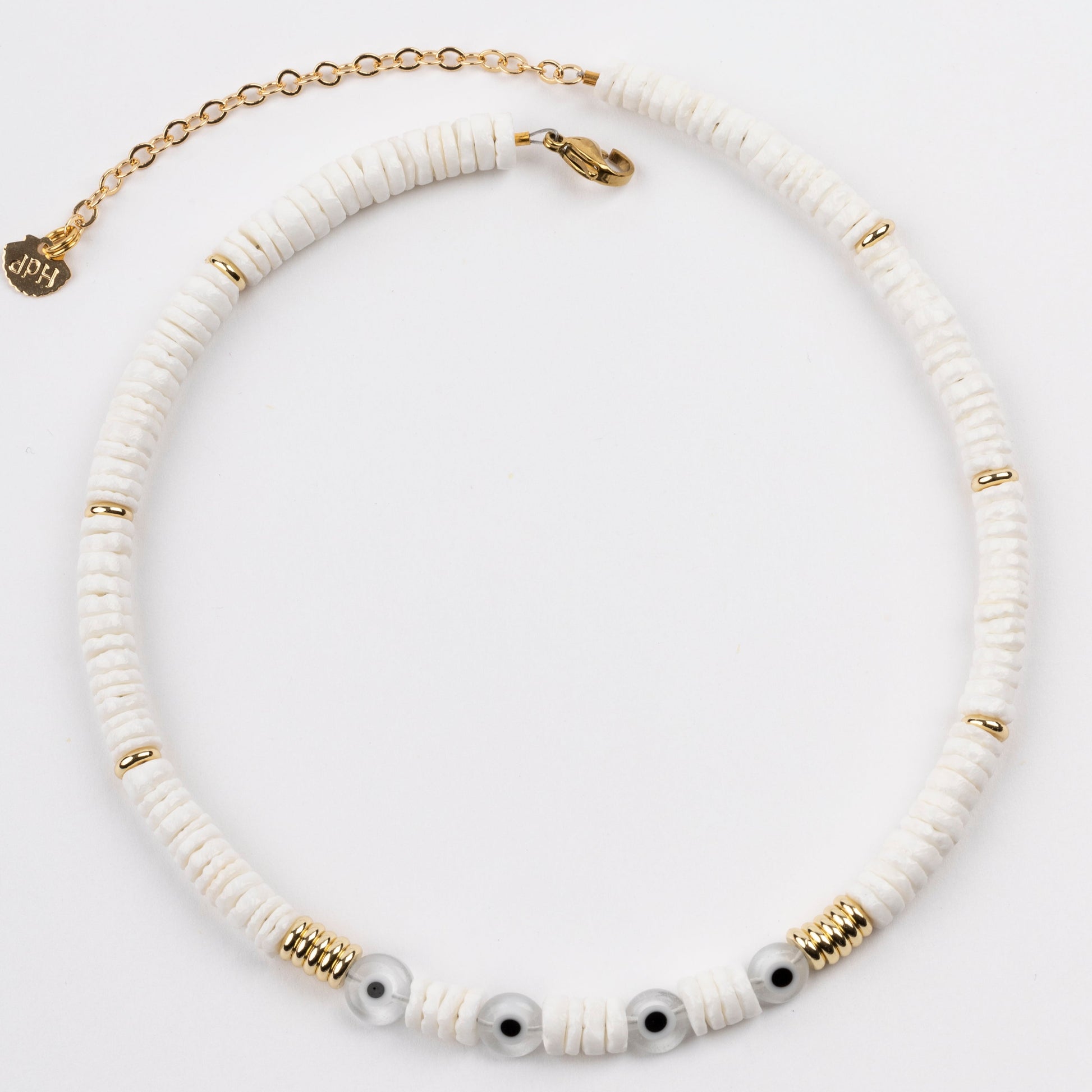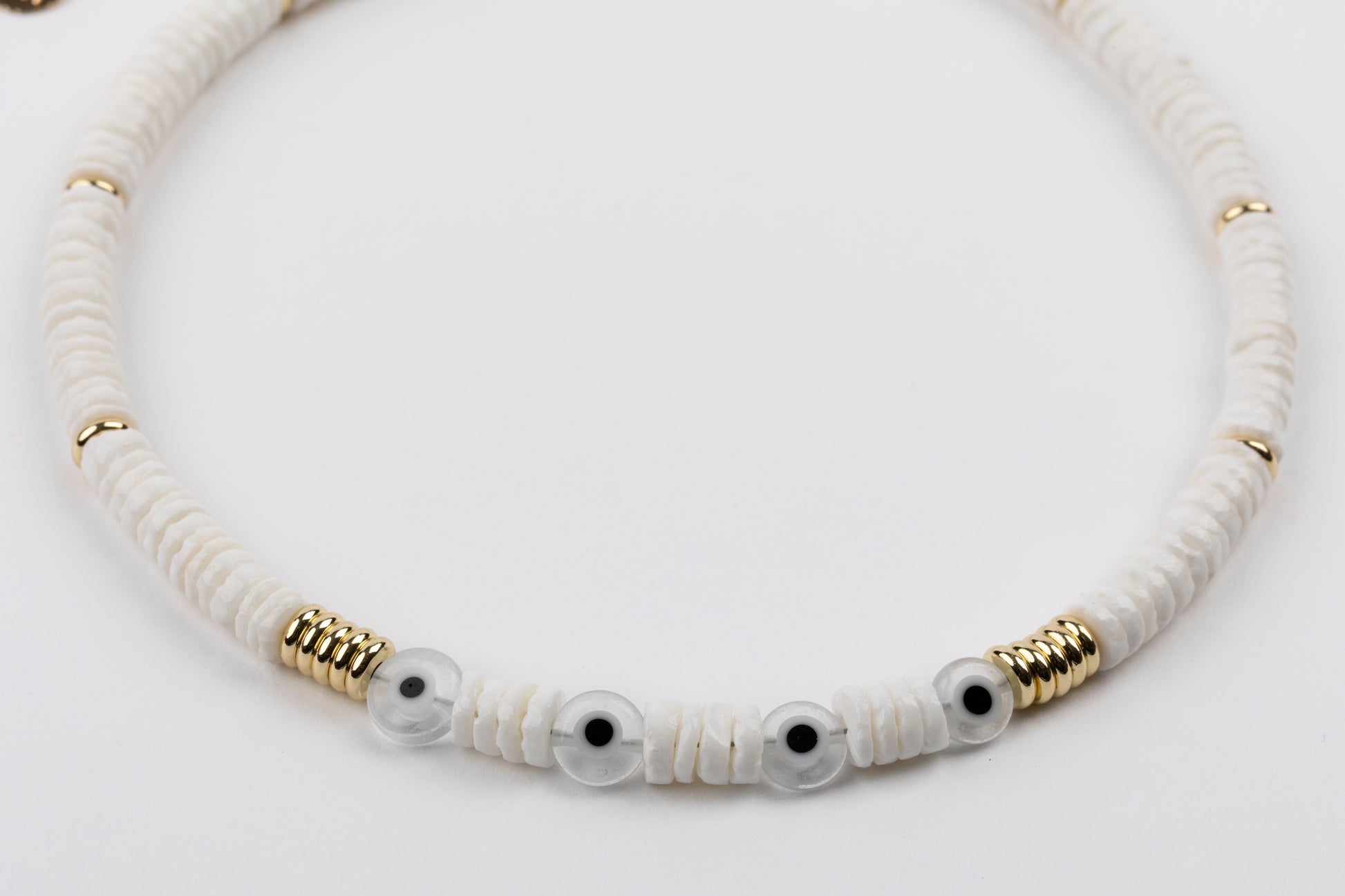 White Sea Shell Puka Necklace with Clear Evil Eye Lampwork Beads, Golden Volcanic-Derived Hematite Rondelles and Adjustable Gold Plated Brass Cable Chain.