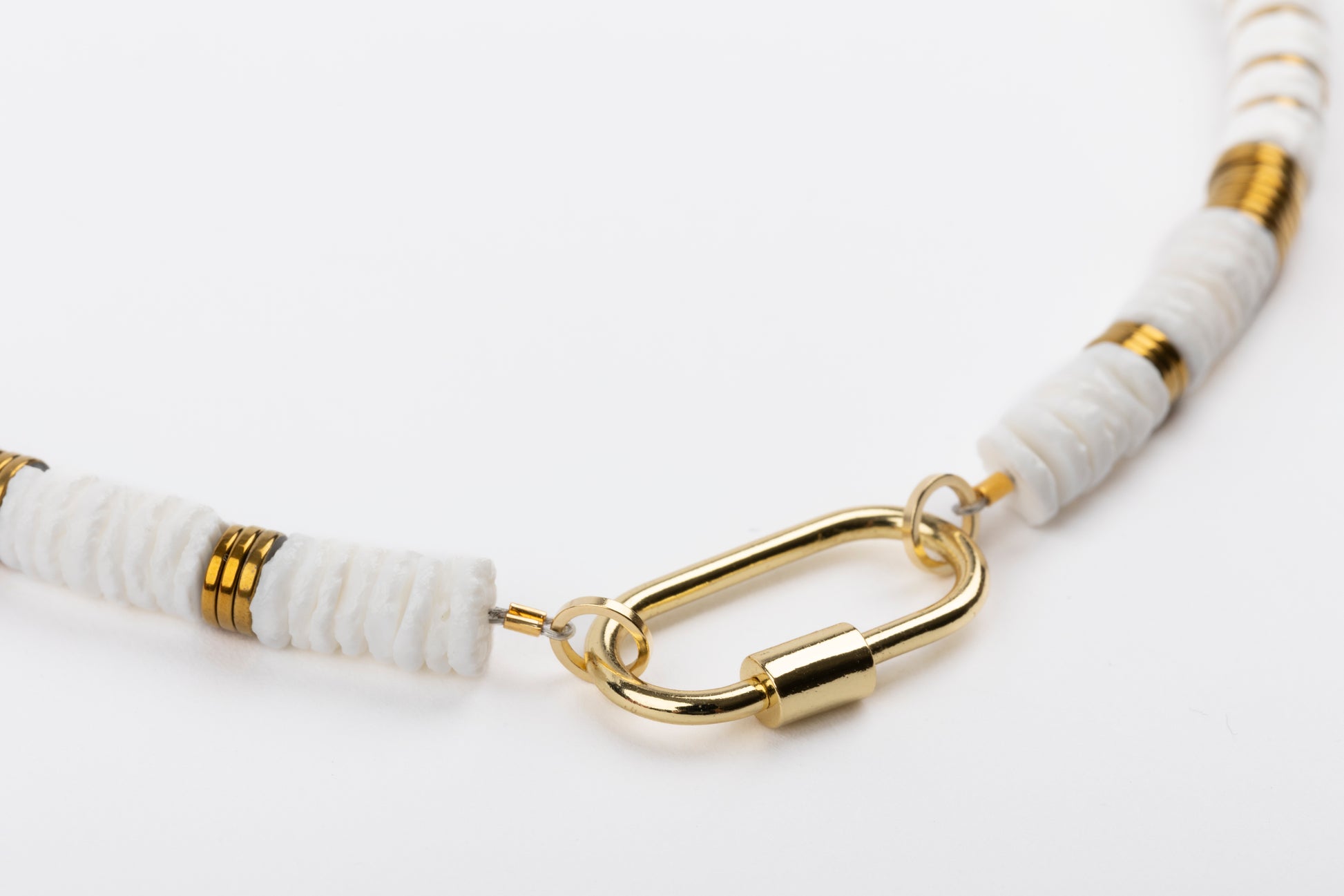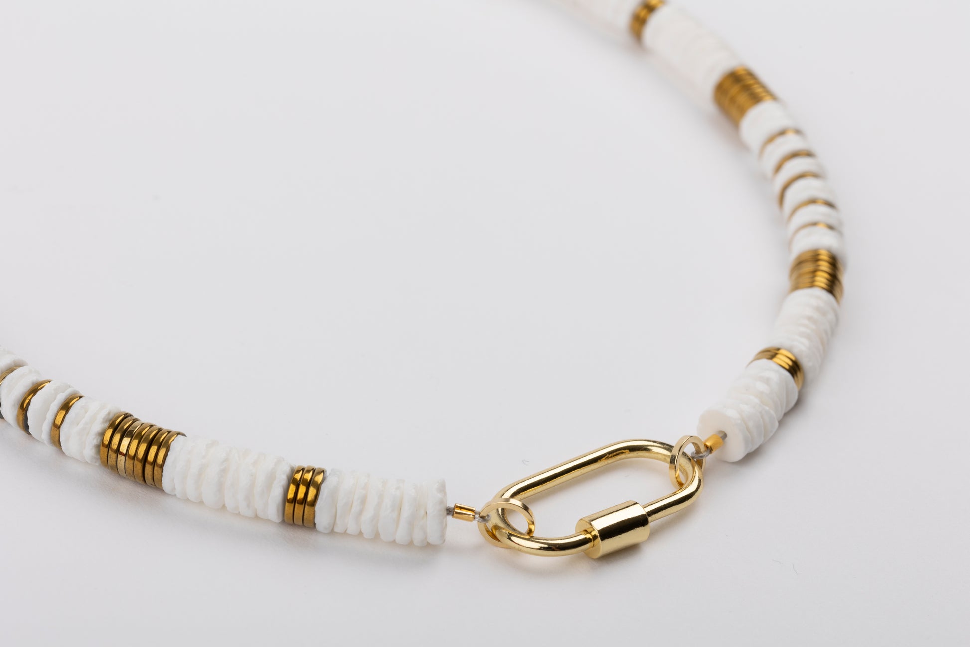 White Sea Shell Puka Necklace with Brass Screw Carabiner Lock Charm, Golden Volcanic-Derived Hematite Rondelles and Adjustable Gold Plated Brass Cable Chain.