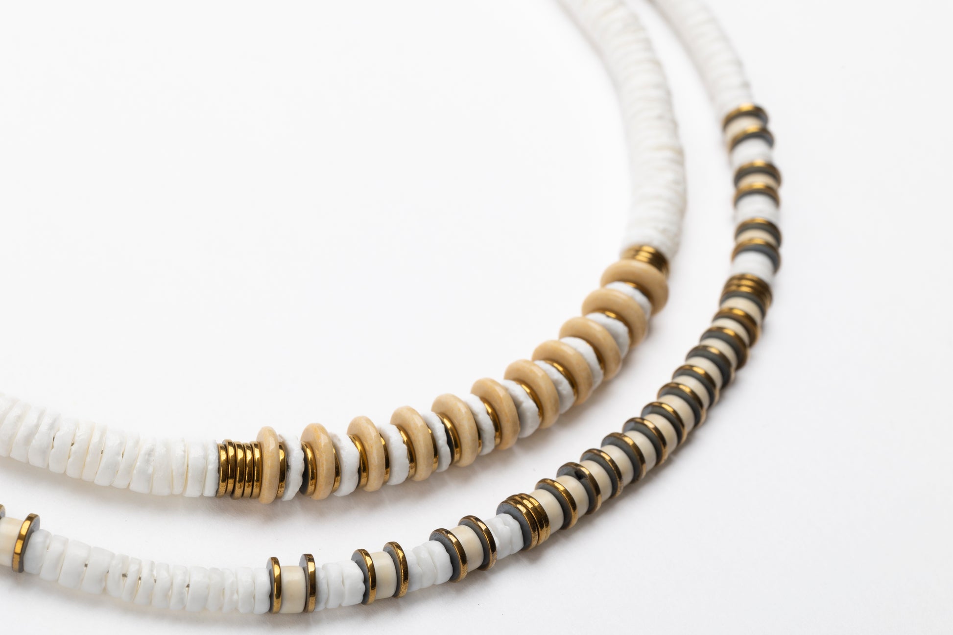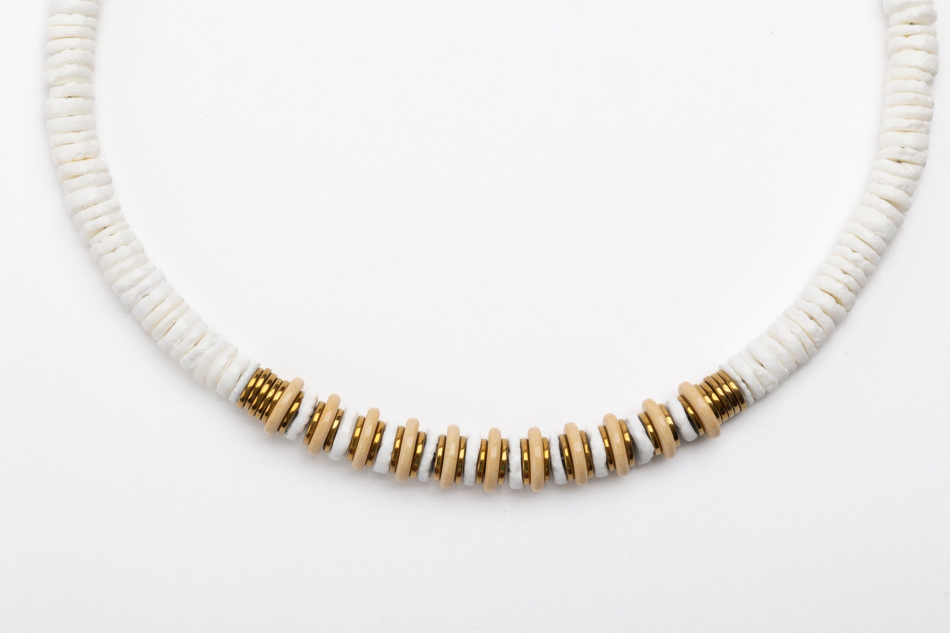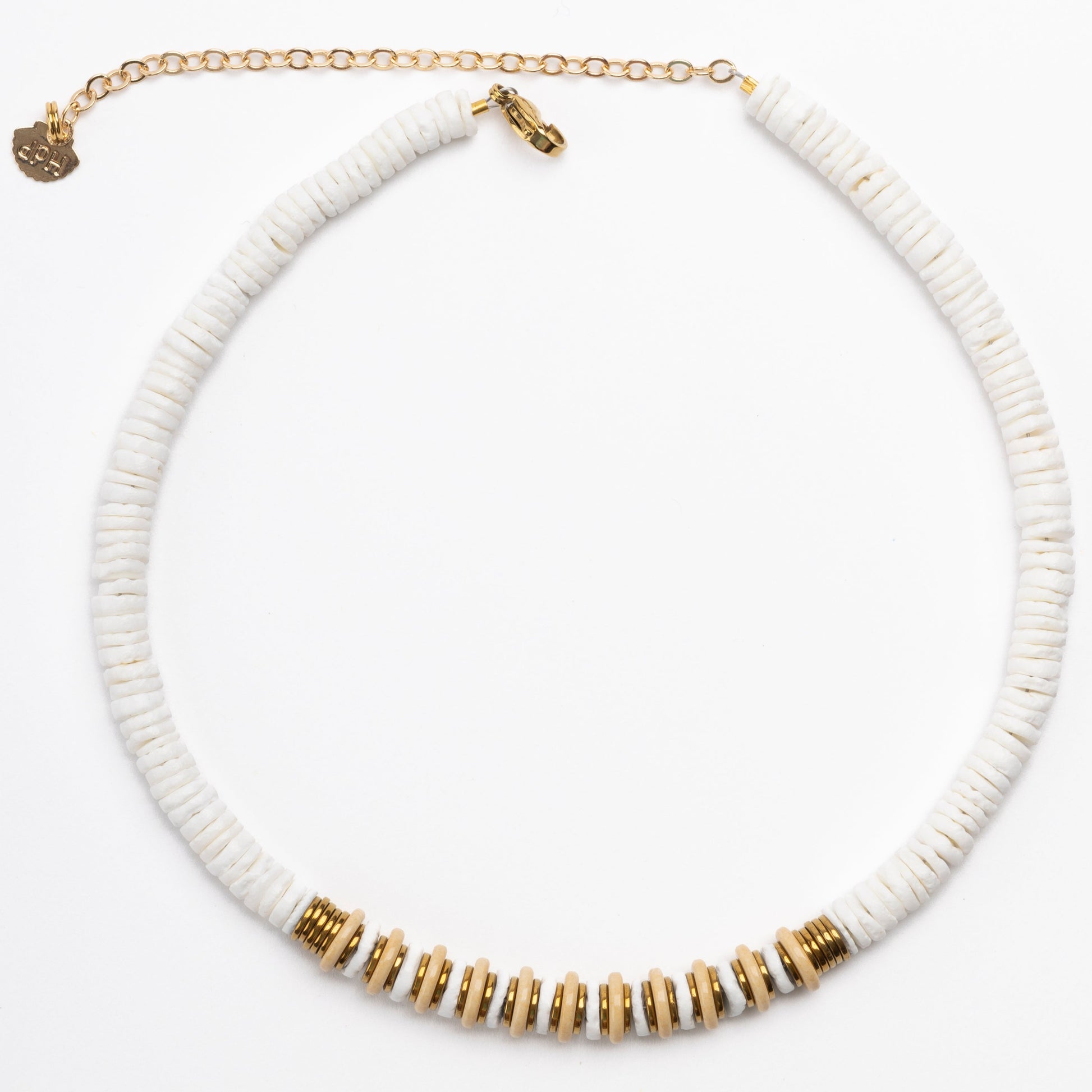 White Sea Shell Puka Necklace with Natural Agate Beads, Golden Volcanic-Derived Hematite Rondelles and Adjustable Gold Plated Brass Cable Chain.