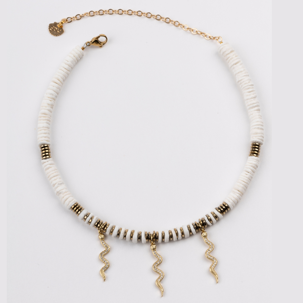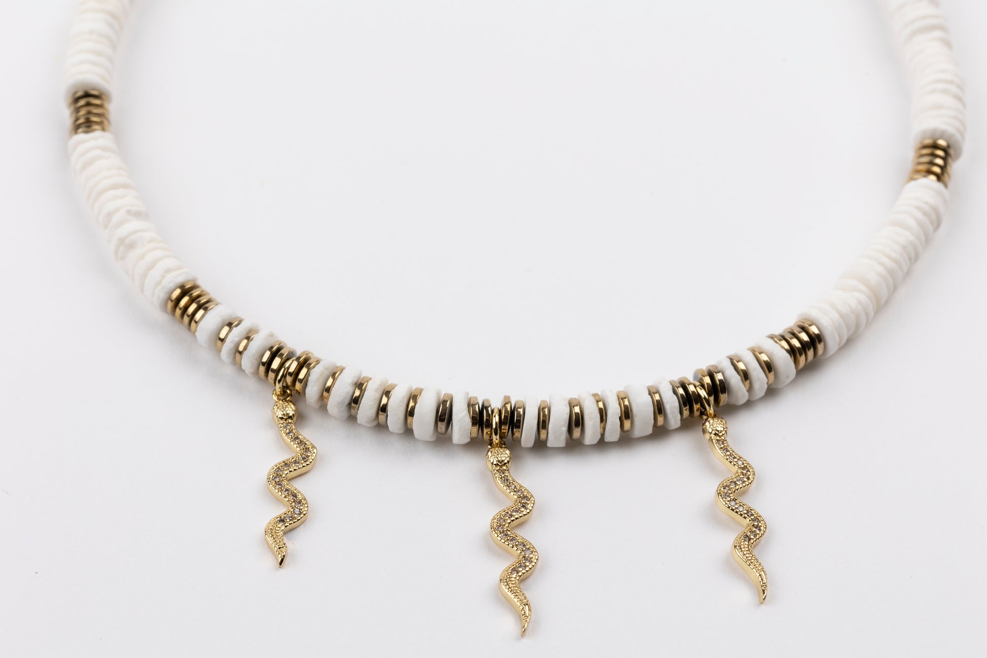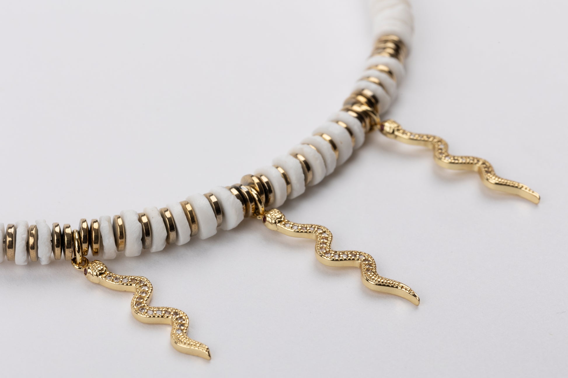 White Sea Shell Puka Necklace with Micro Pave Cubic Zirconia Snakes, Golden Volcanic-Derived Hematite Rondelles and Adjustable Gold Plated Brass Cable Chain.