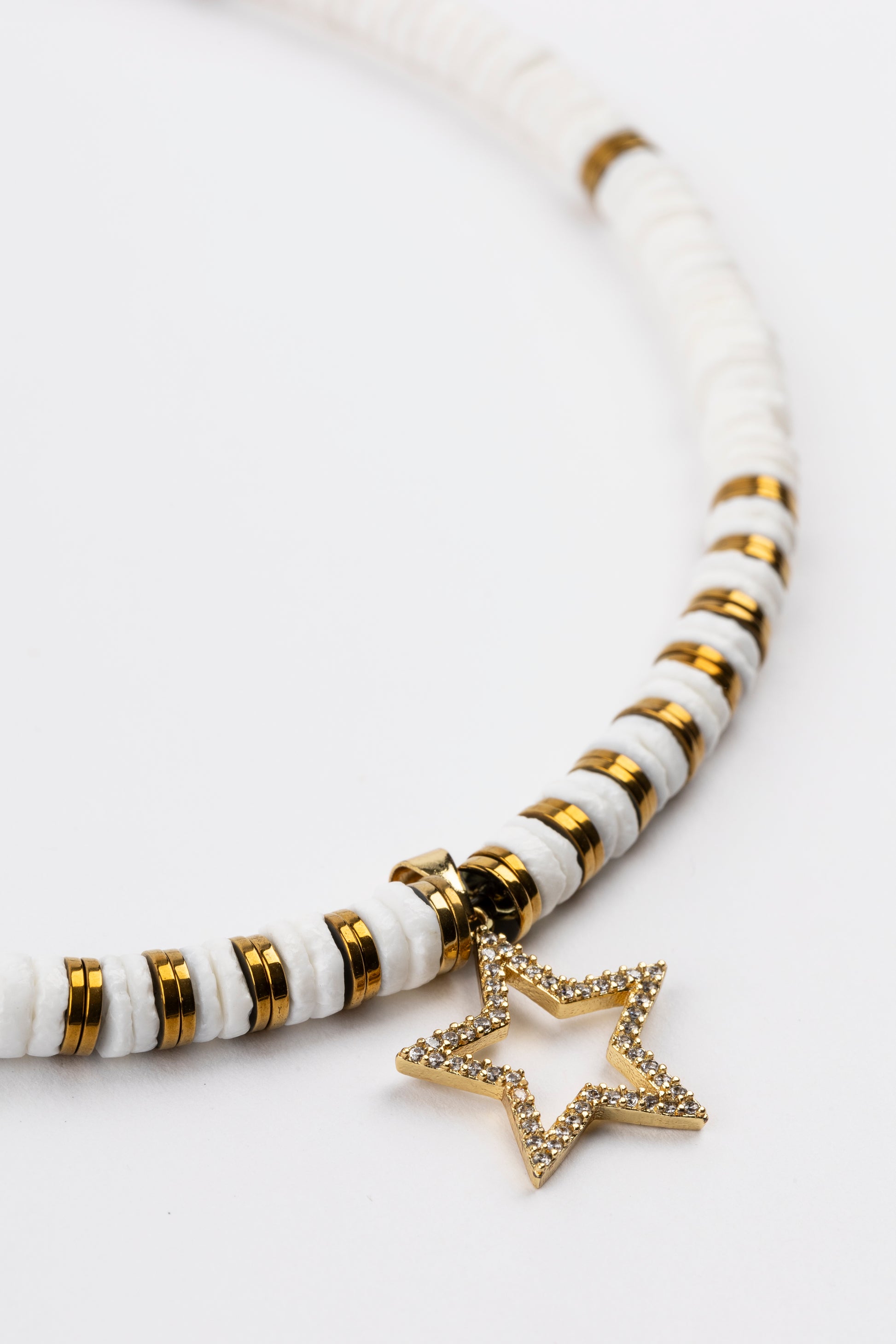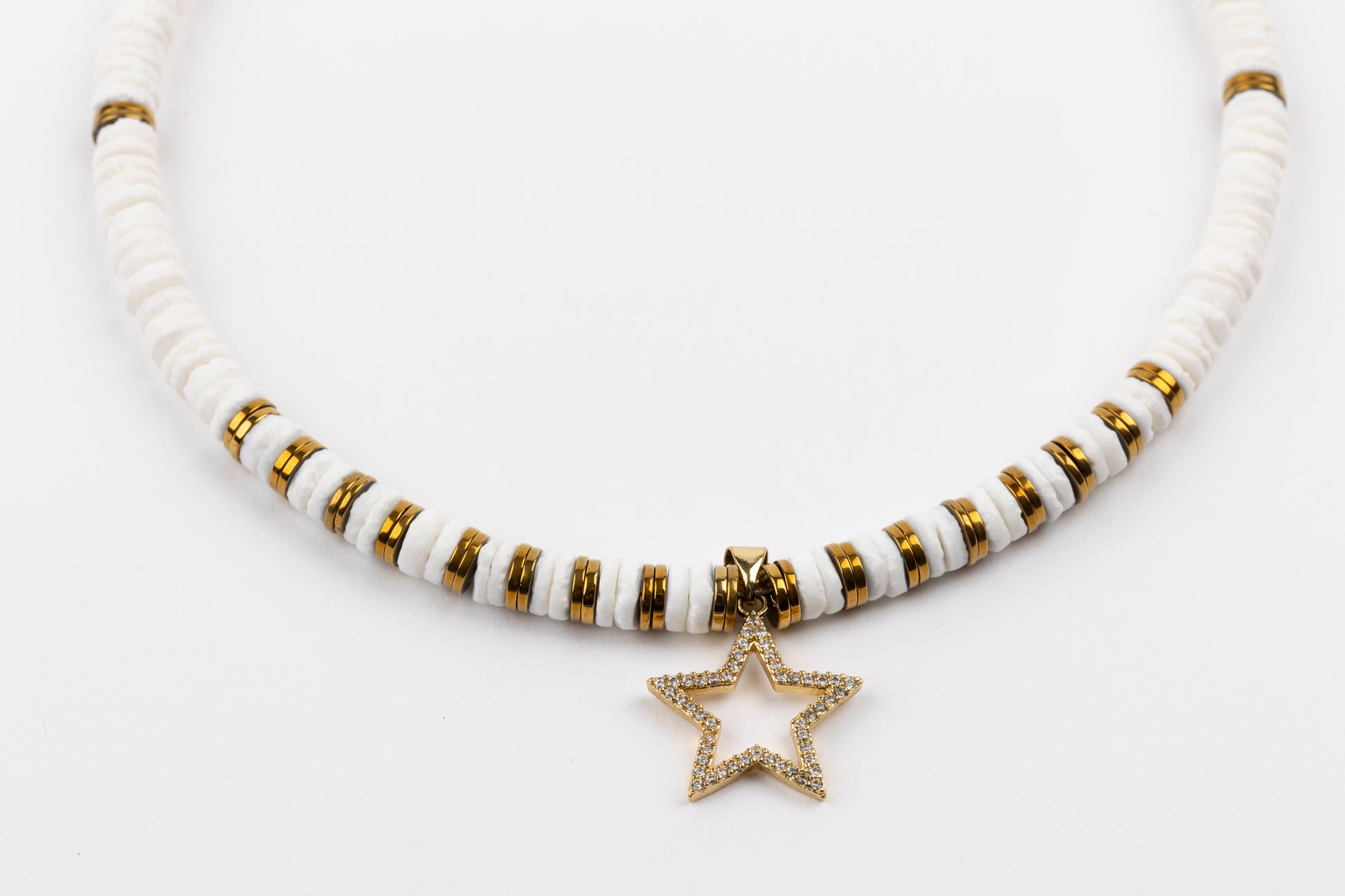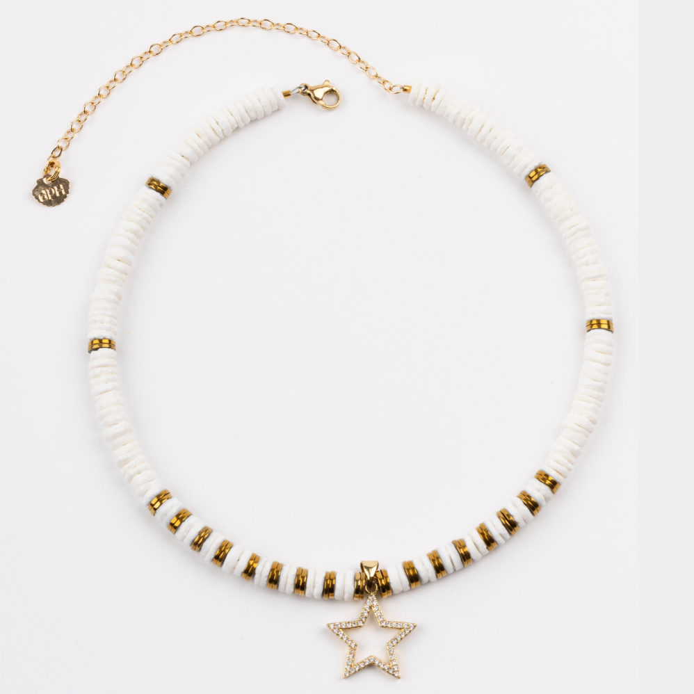 White Sea Shell Puka Necklace with Micro Pave Cubic Zirconia Star, Golden Volcanic-Derived Hematite Rondelles and Adjustable Gold Plated Brass Cable Chain.