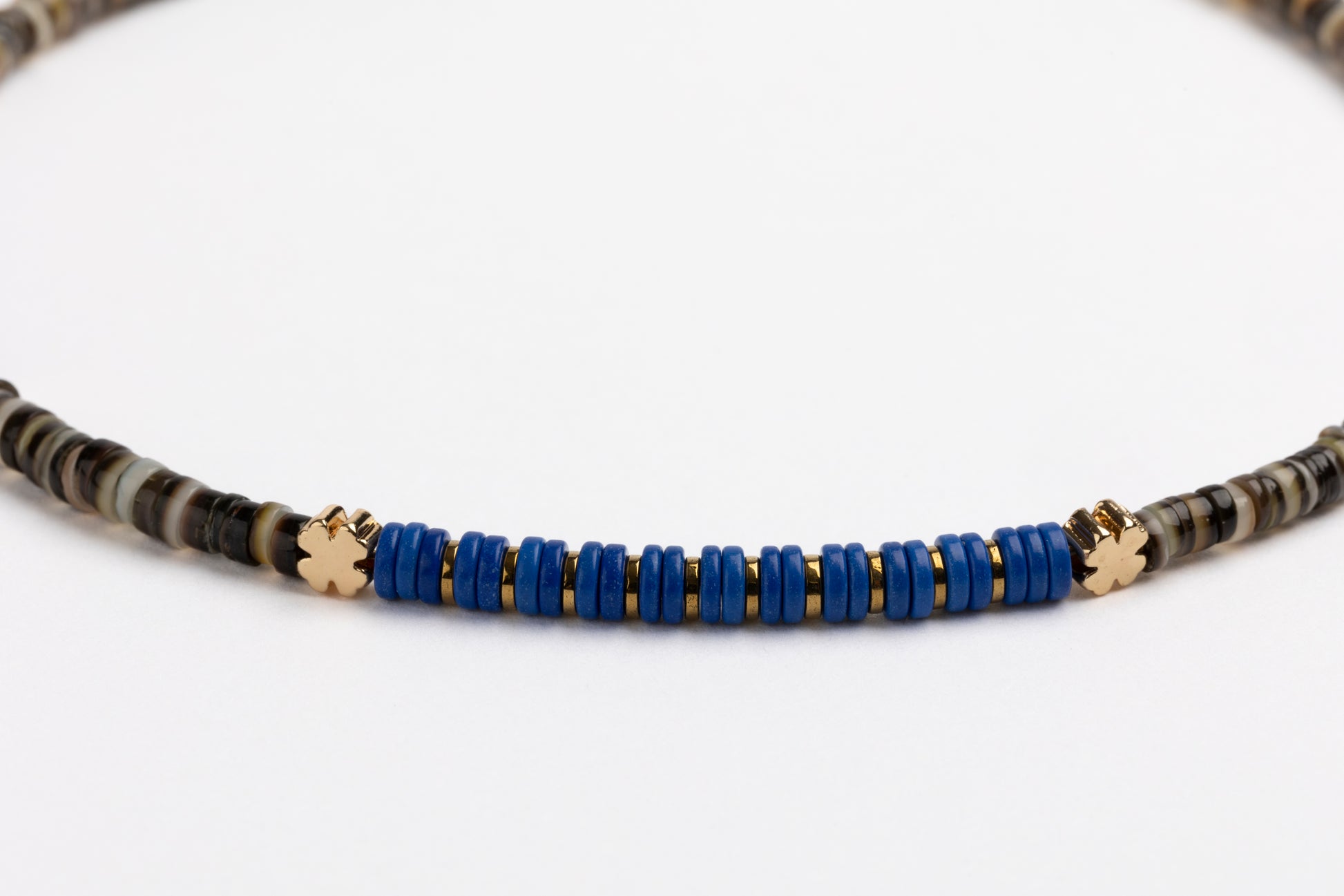 This piece is made with blue pukas, hematite rondelles and gold-plated snakes with cubic zirconia. Goes great with the BOA SORTE collection.