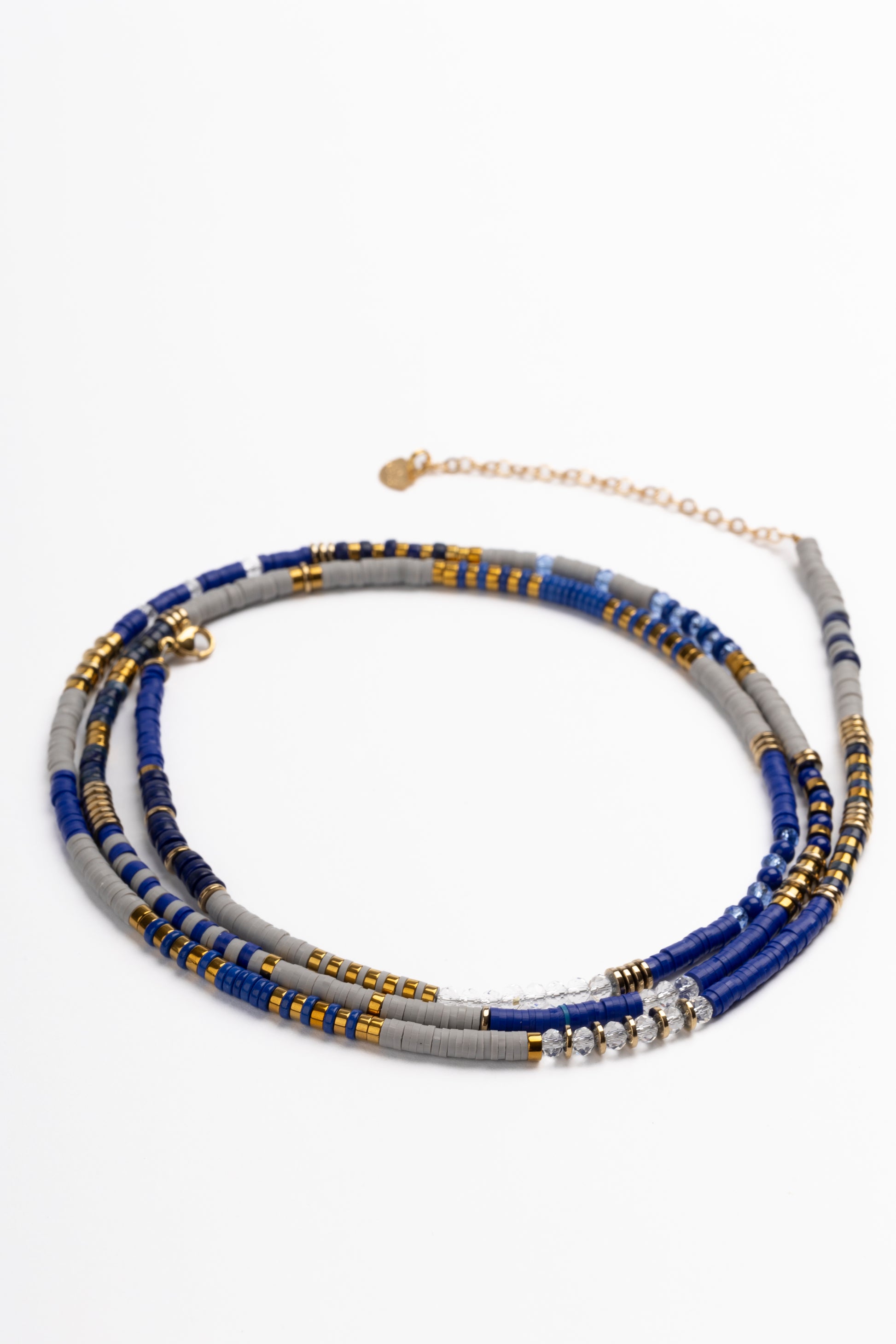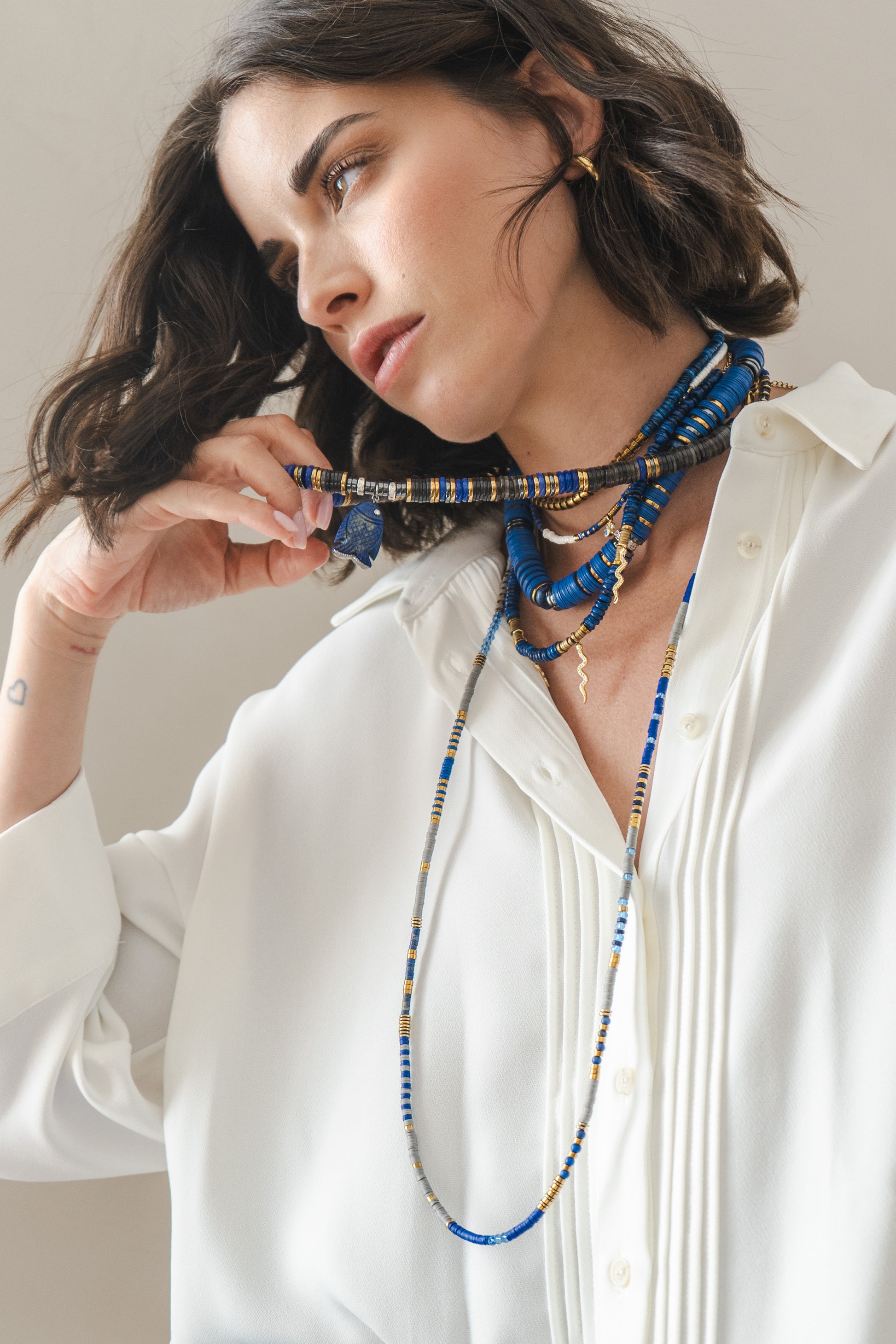 Blue Varied Agate, Crystal, Dyed Shell and Polymer Beads Necklace with Golden Volcanic-Derived Hematite Rondelles and Adjustable Gold Plated Brass Cable Chain.