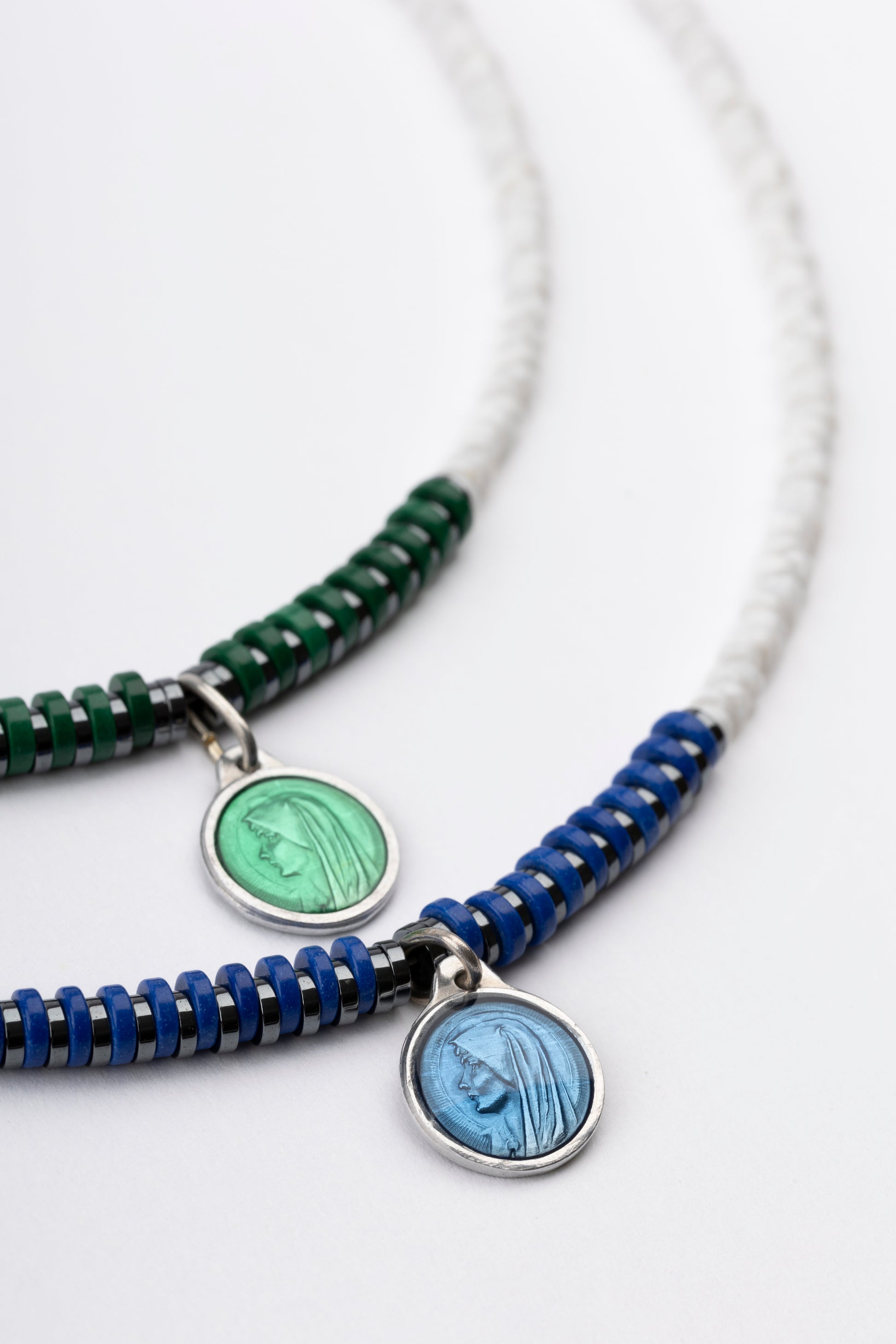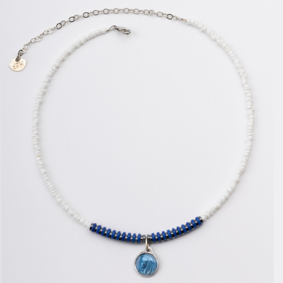 White Sea Shell Puka Necklace with Aluminum Epoxy Enamel Virgin Medal, Natural Blue Agate Beads, Black Volcanic-Derived Hematite Rondelles and Adjustable Platinum Plated Brass Cable Chain.