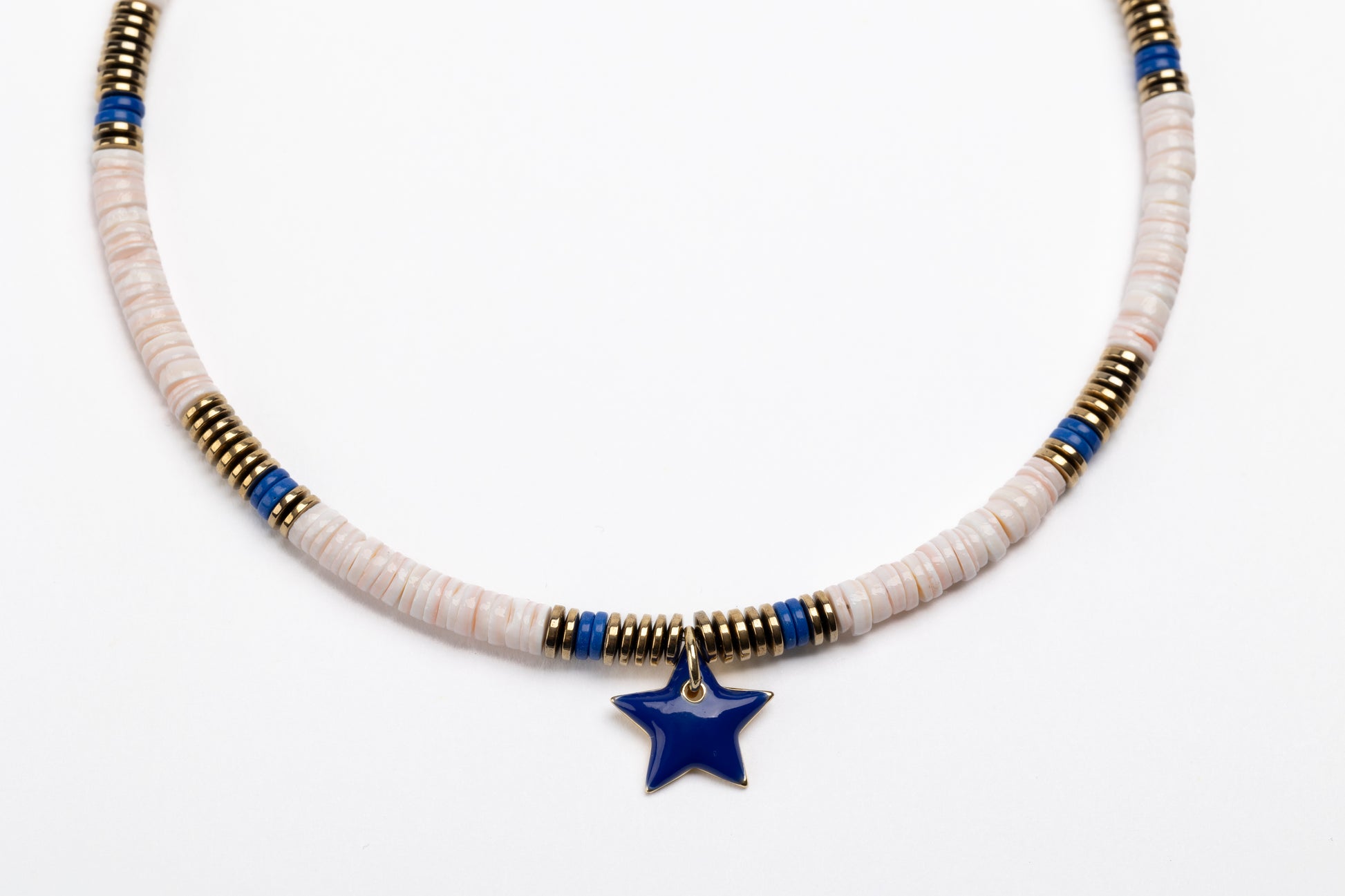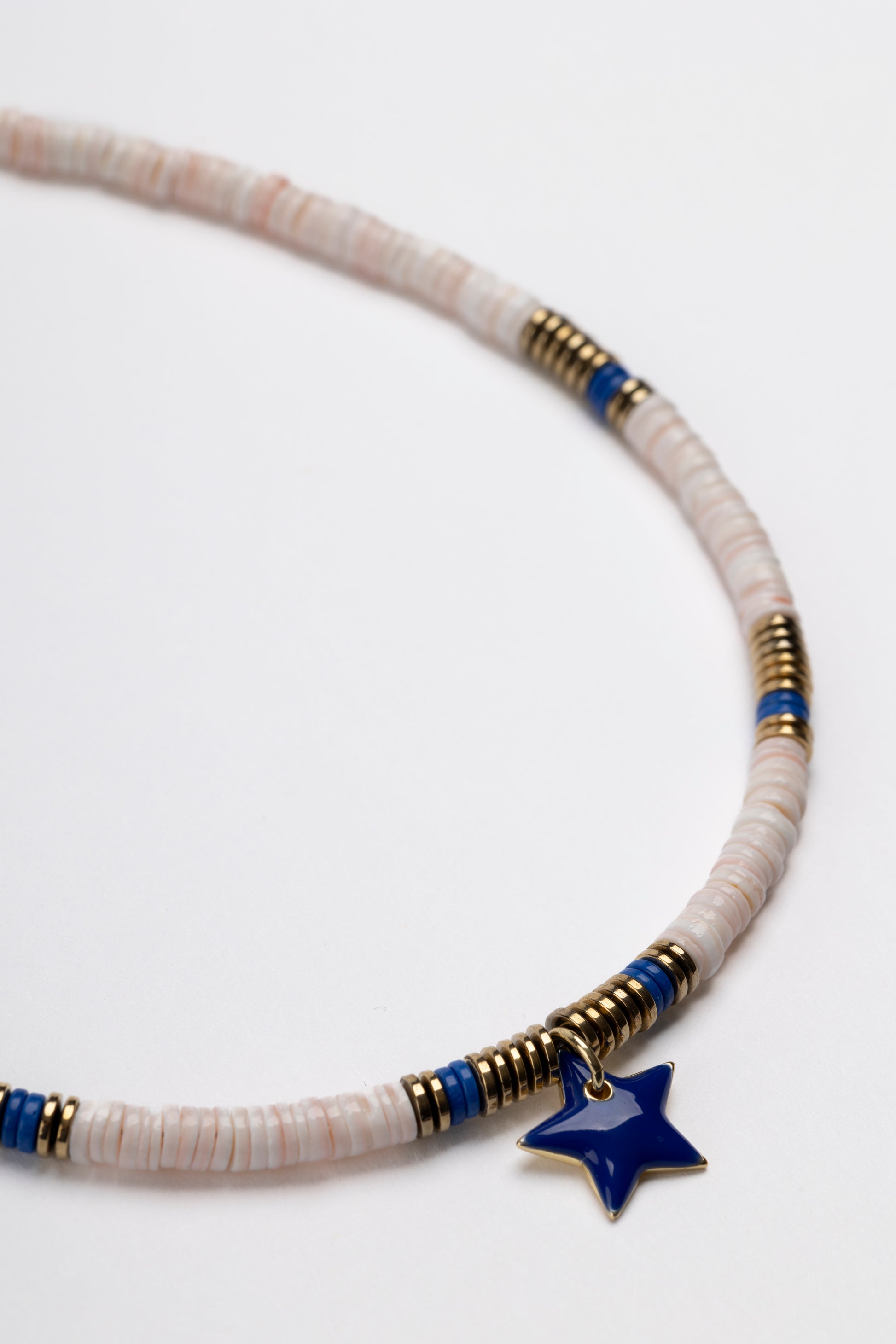 Blush Sea Shell Puka Necklace with Blue Enamel Star, Golden Volcanic-Derived Hematite Rondelles and Adjustable Gold Plated Brass Cable Chain.