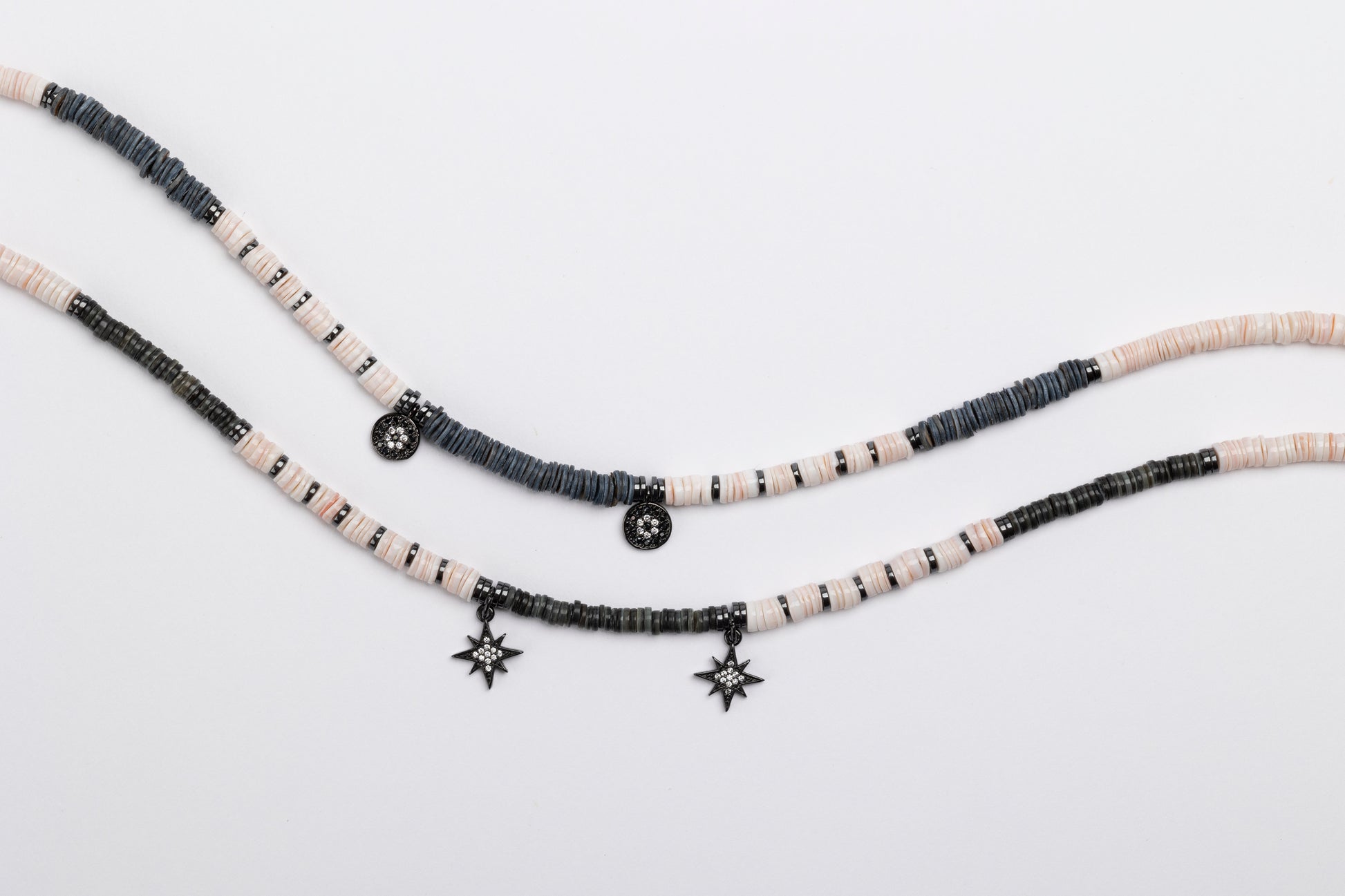 Blush/Grey Sea Shell Puka Necklace with Micro Pave Cubic Zirconia Evil Eyes, Black Volcanic-Derived Hematite Rondelles and Adjustable Platinum Plated Brass Cable Chain.