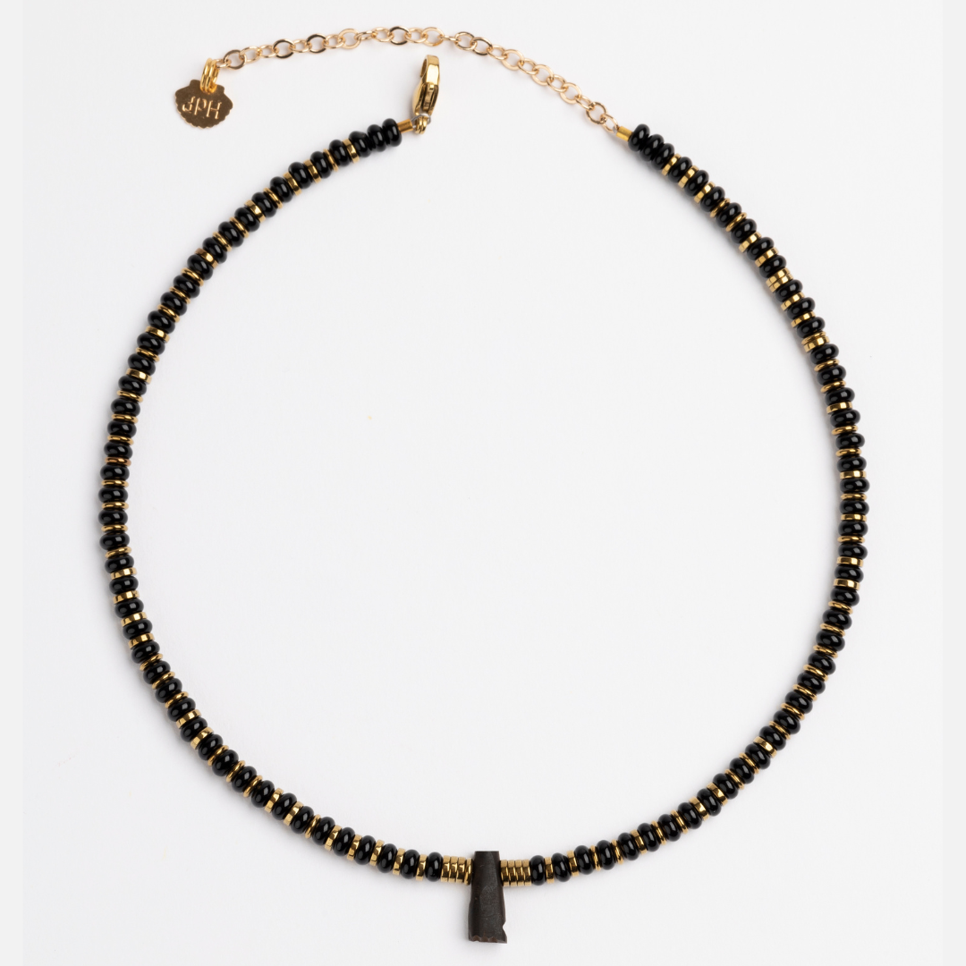 Black Coconut Bead Puka Necklace with Azabache hand, Golden Volcanic-Derived Hematite Rondelles and Adjustable Gold Plated Brass Cable Chain.