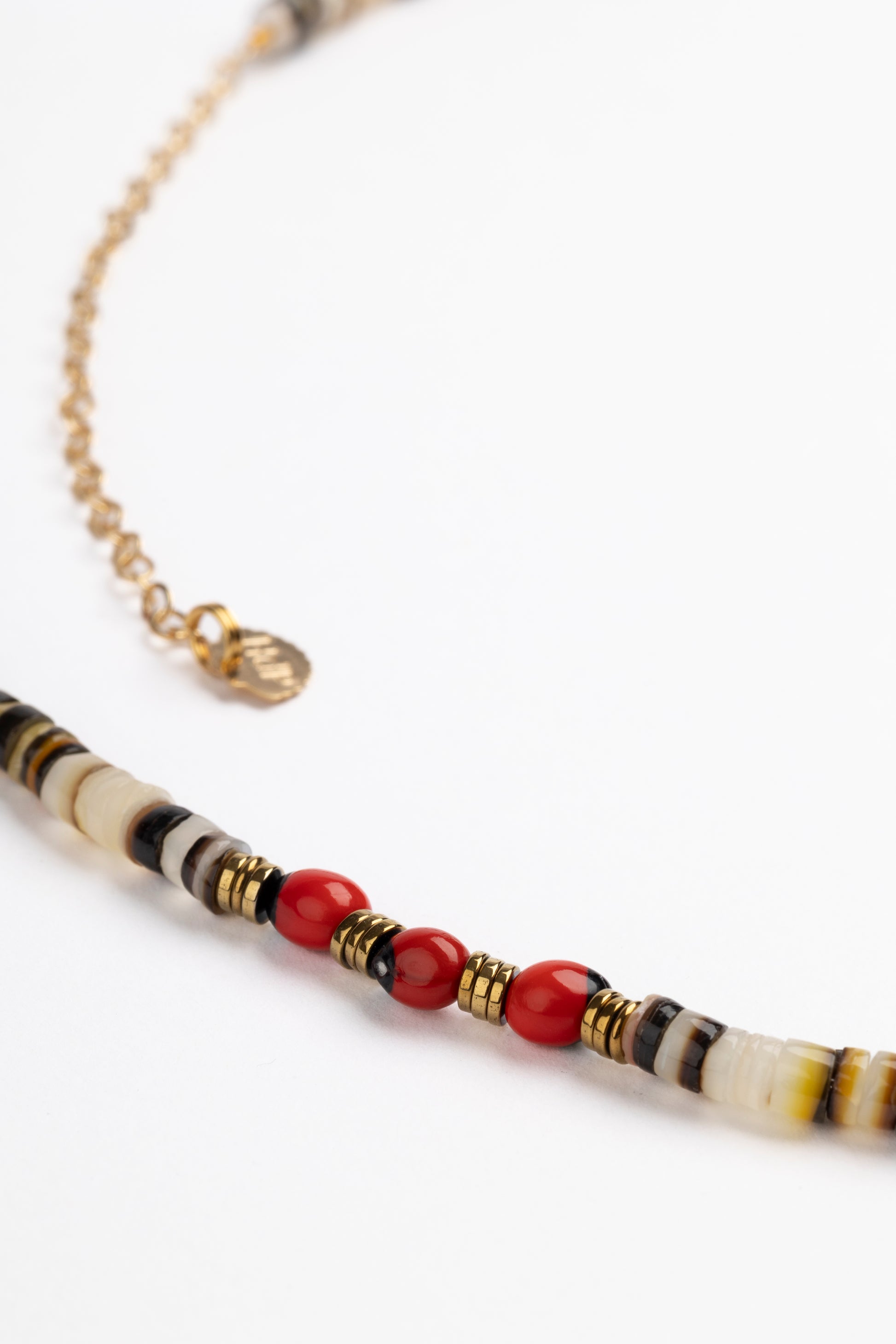 Natural Brown Long Shell Puka Necklace with Peony Seeds, Golden Volcanic-Derived Hematite Rondelles and Adjustable Gold Plated Brass Cable Chain.