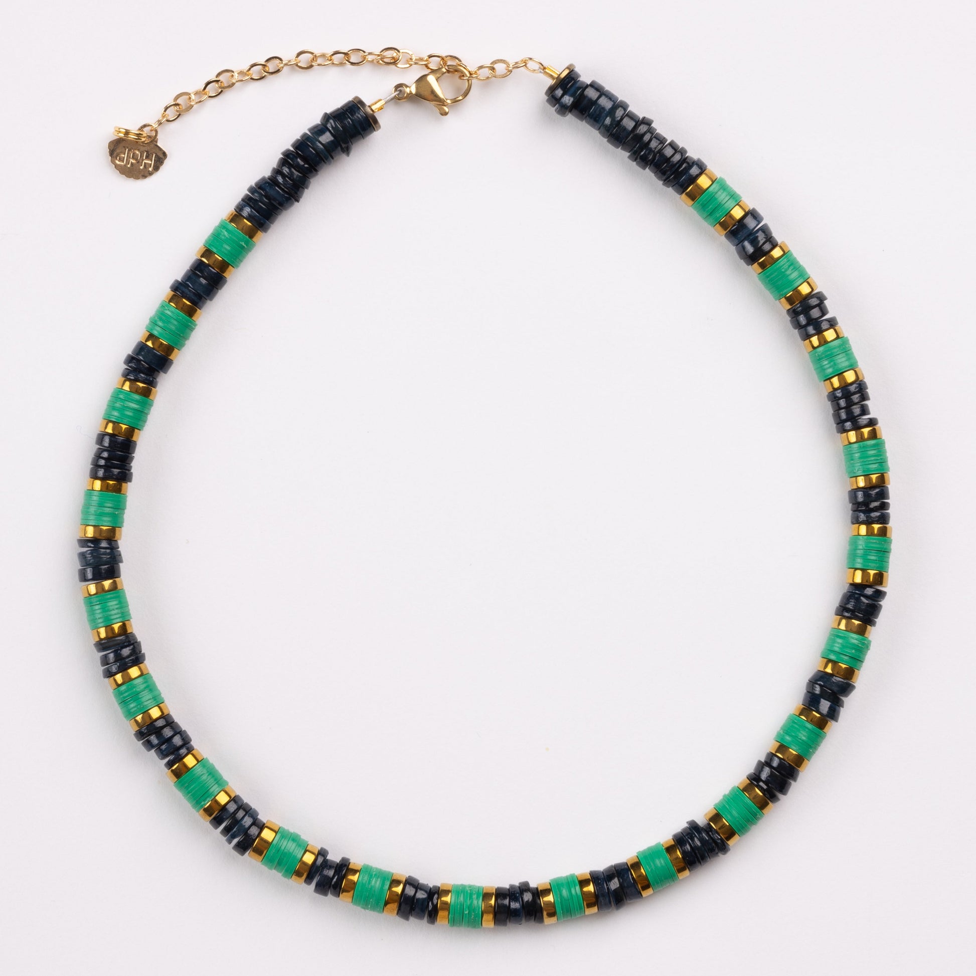 Dark Grey Sea Shell Bead 6mm Necklace with Green African Beads, Golden Volcanic-Derived Hematite Rondelles and Adjustable Gold Plated Brass Cable Chain.