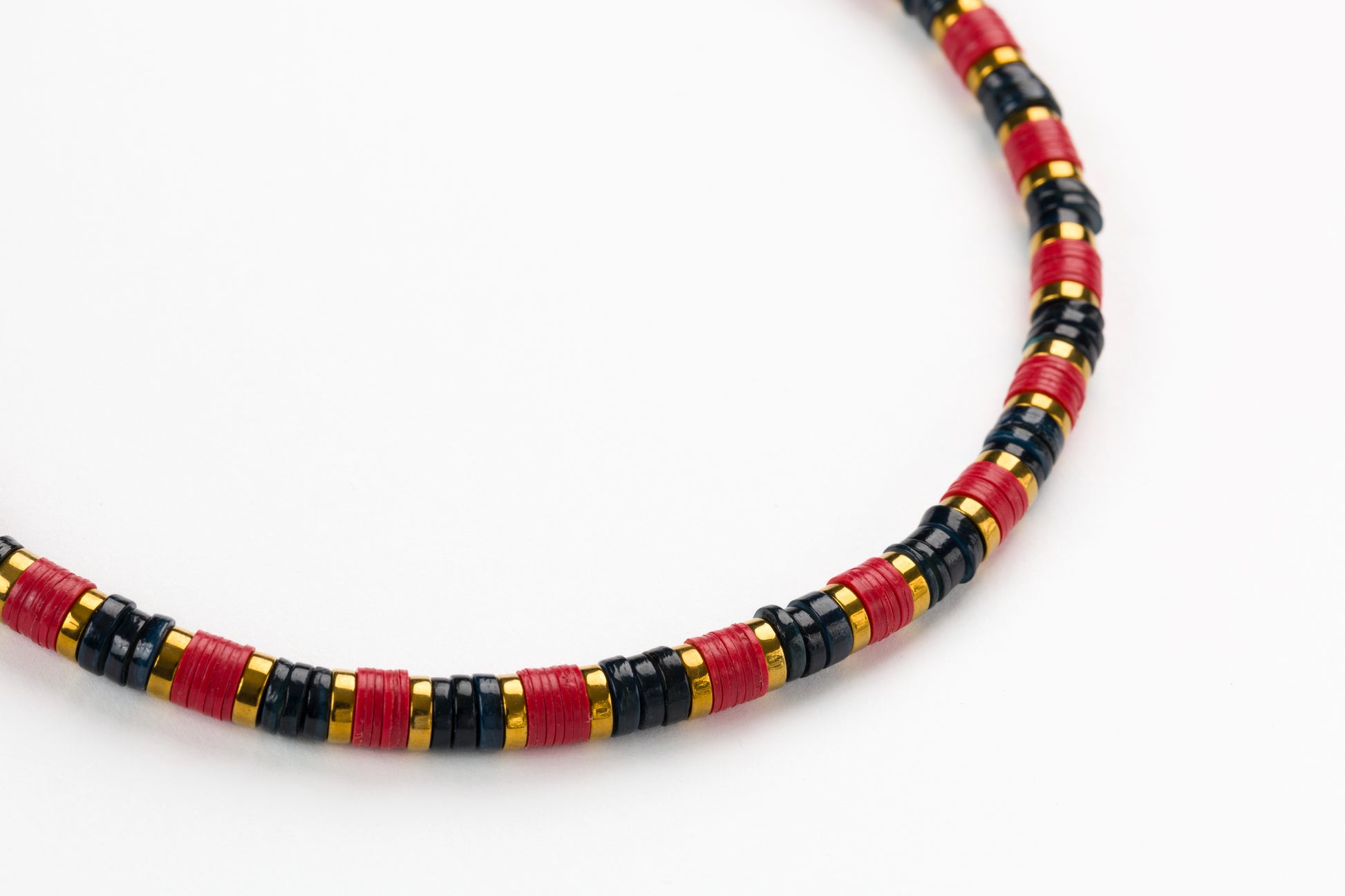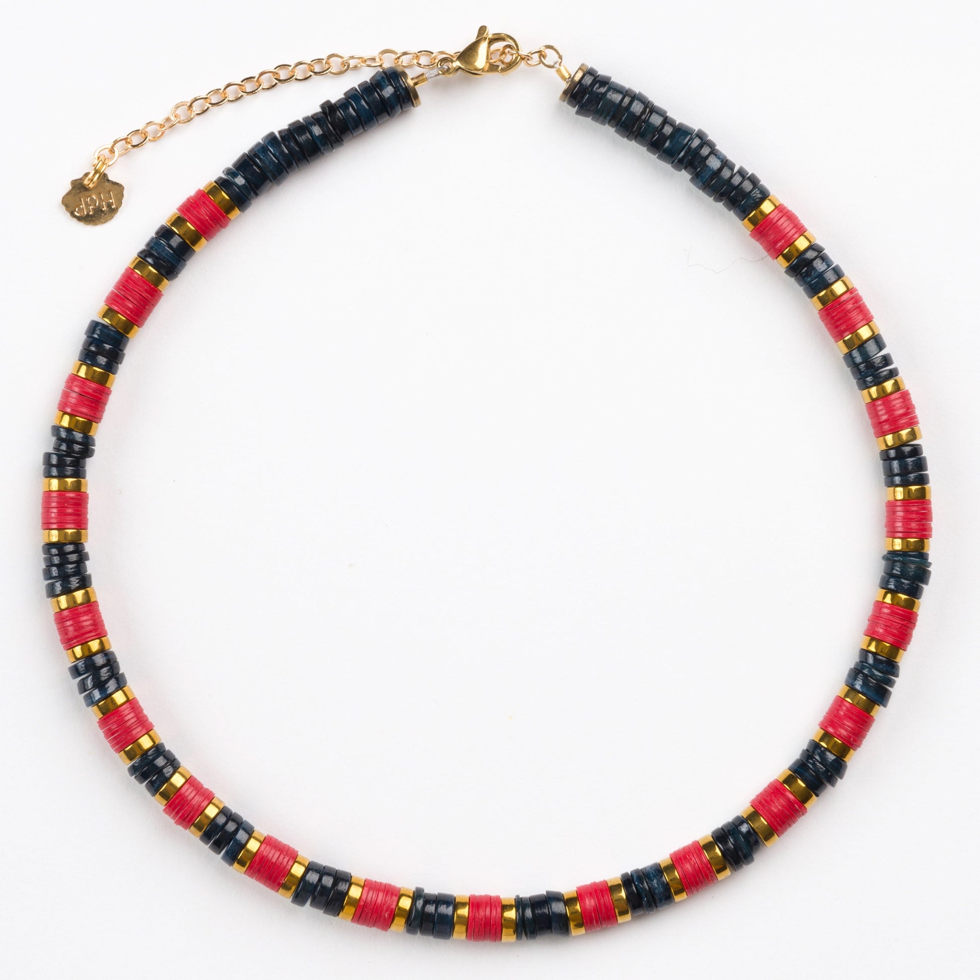 Dark Grey Sea Shell Bead 6mm Necklace with Red African Beads, Golden Volcanic-Derived Hematite Rondelles and Adjustable Gold Plated Brass Cable Chain.