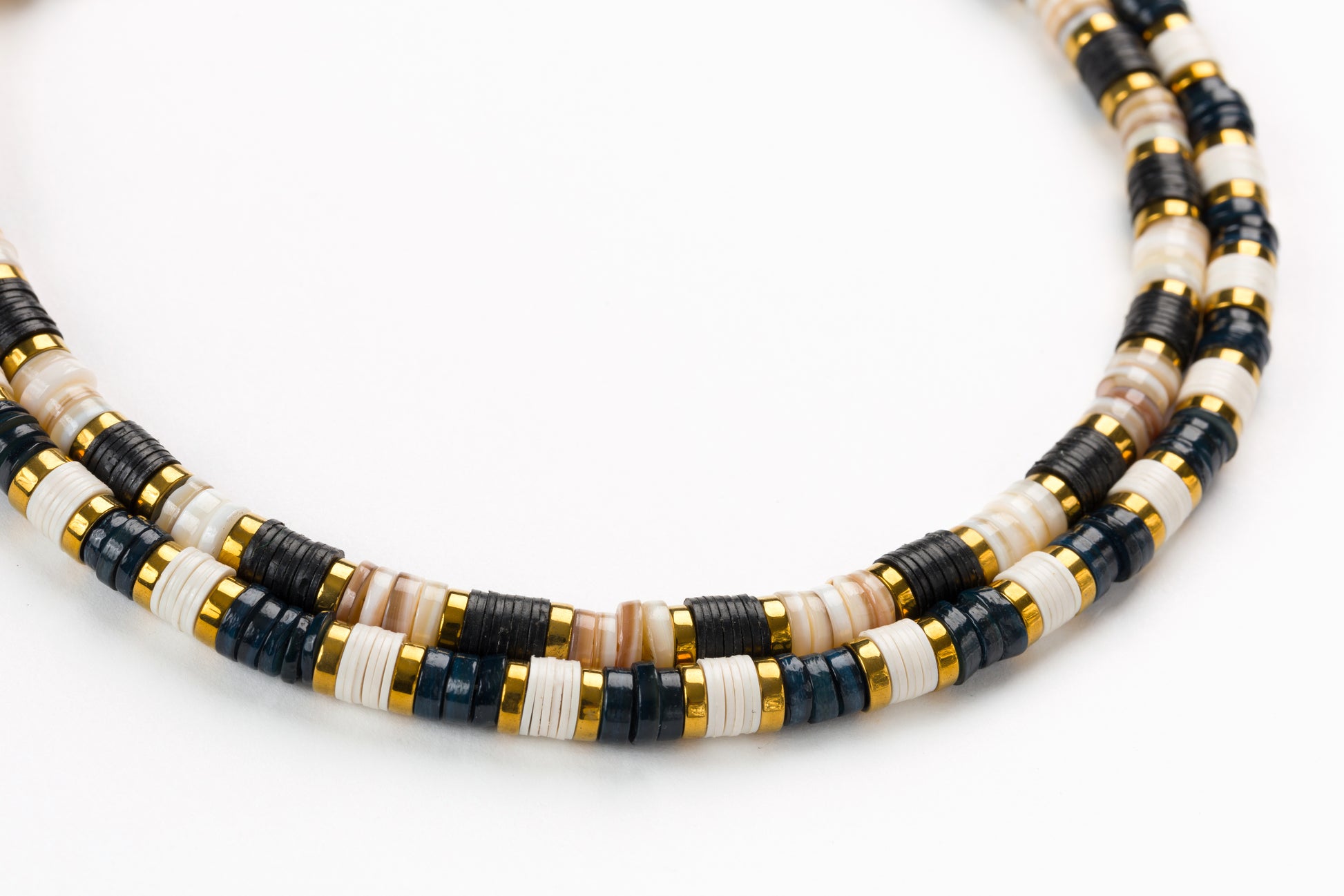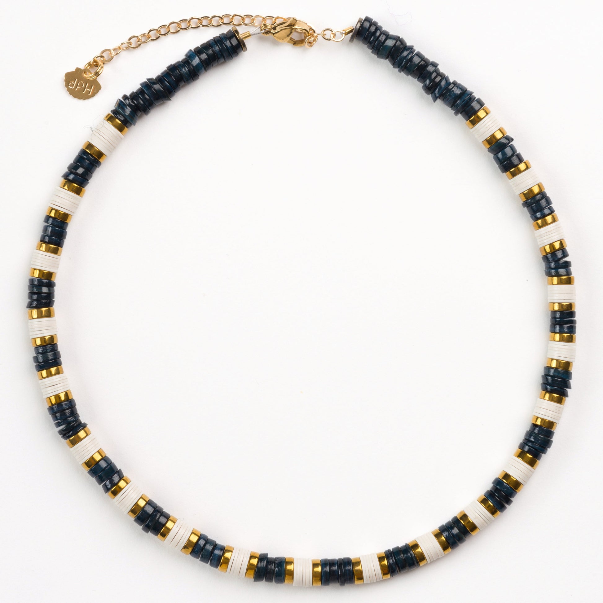 Dark Grey Sea Shell Bead 6mm Necklace with White African Beads, Golden Volcanic-Derived Hematite Rondelles and Adjustable Gold Plated Brass Cable Chain.