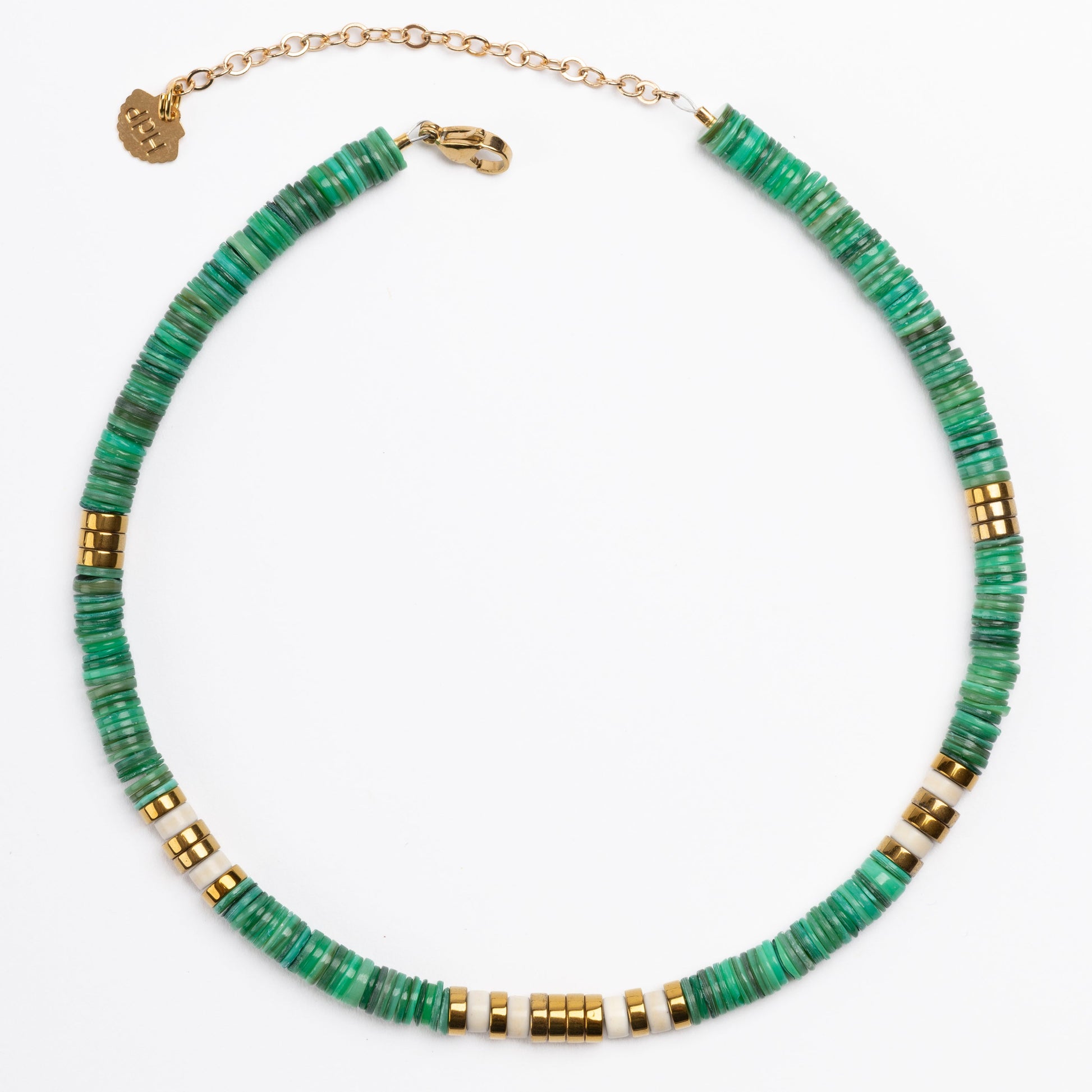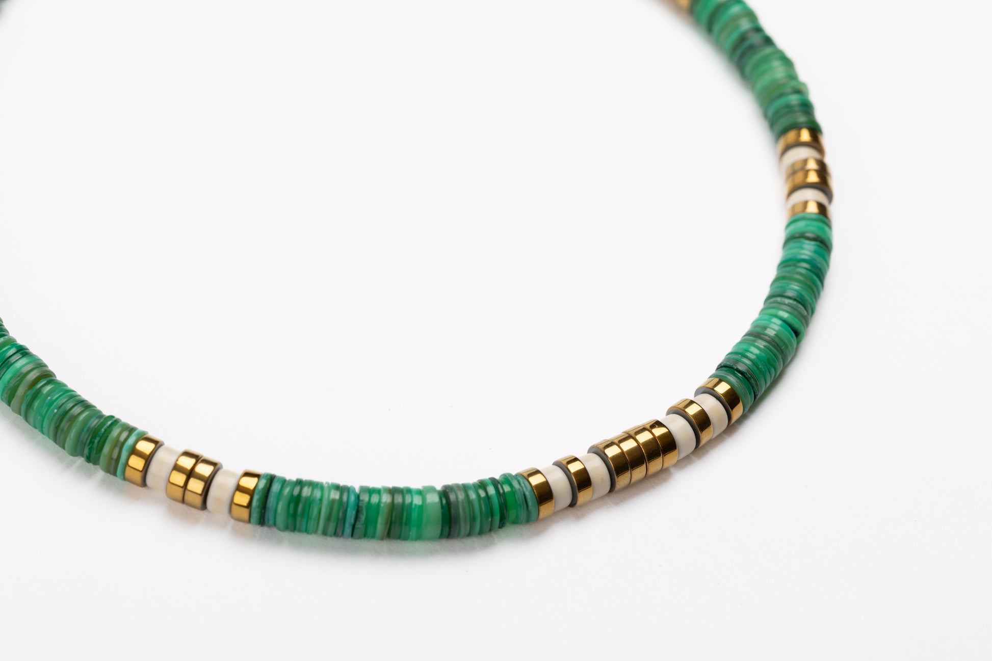 Green Dyed Shell Puka Necklace with Golden Volcanic-Derived Hematite Rondelles and Adjustable Gold Plated Brass Cable Chain.