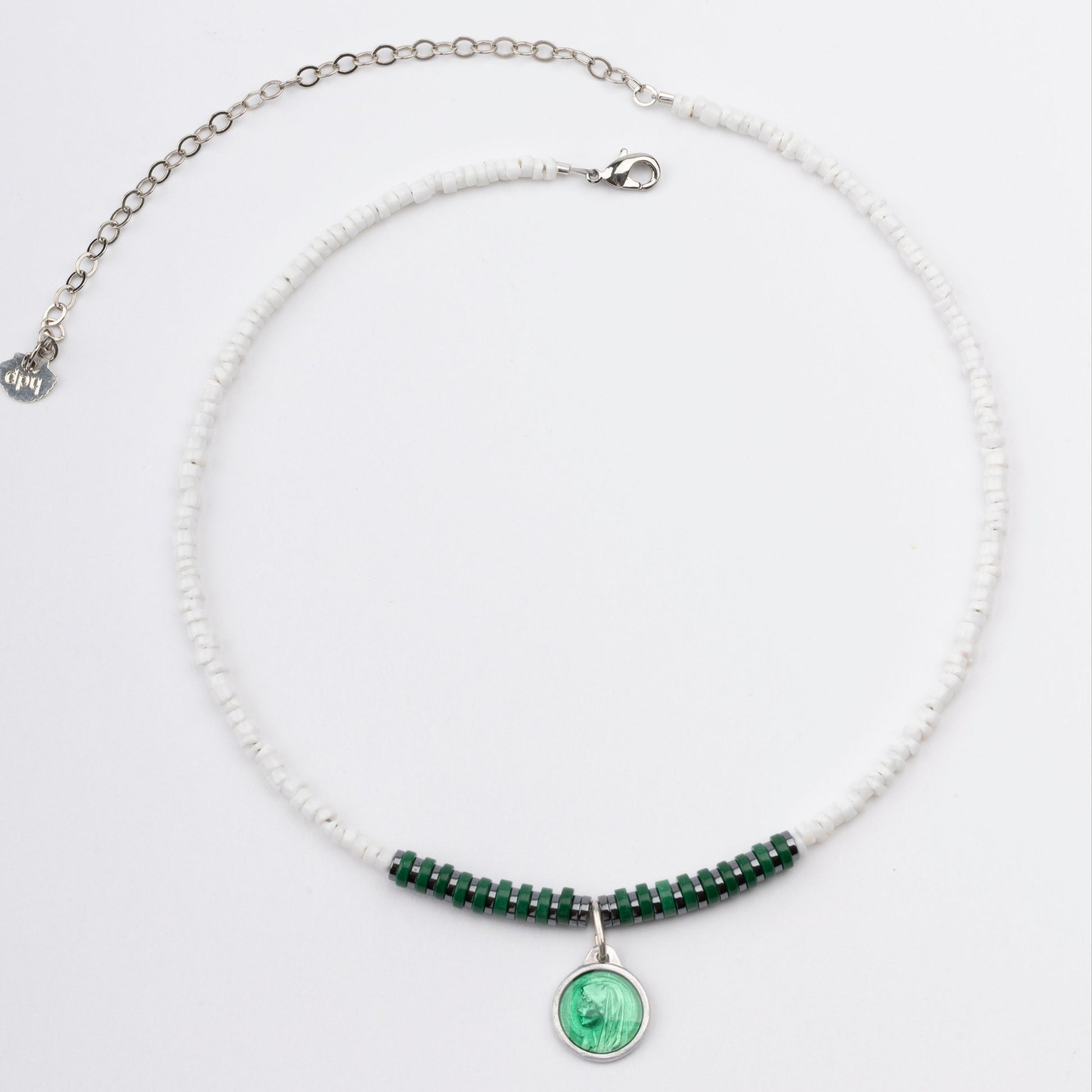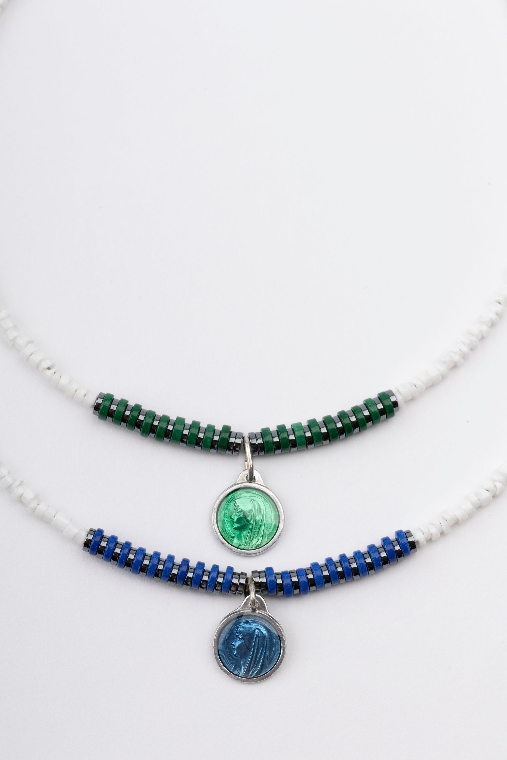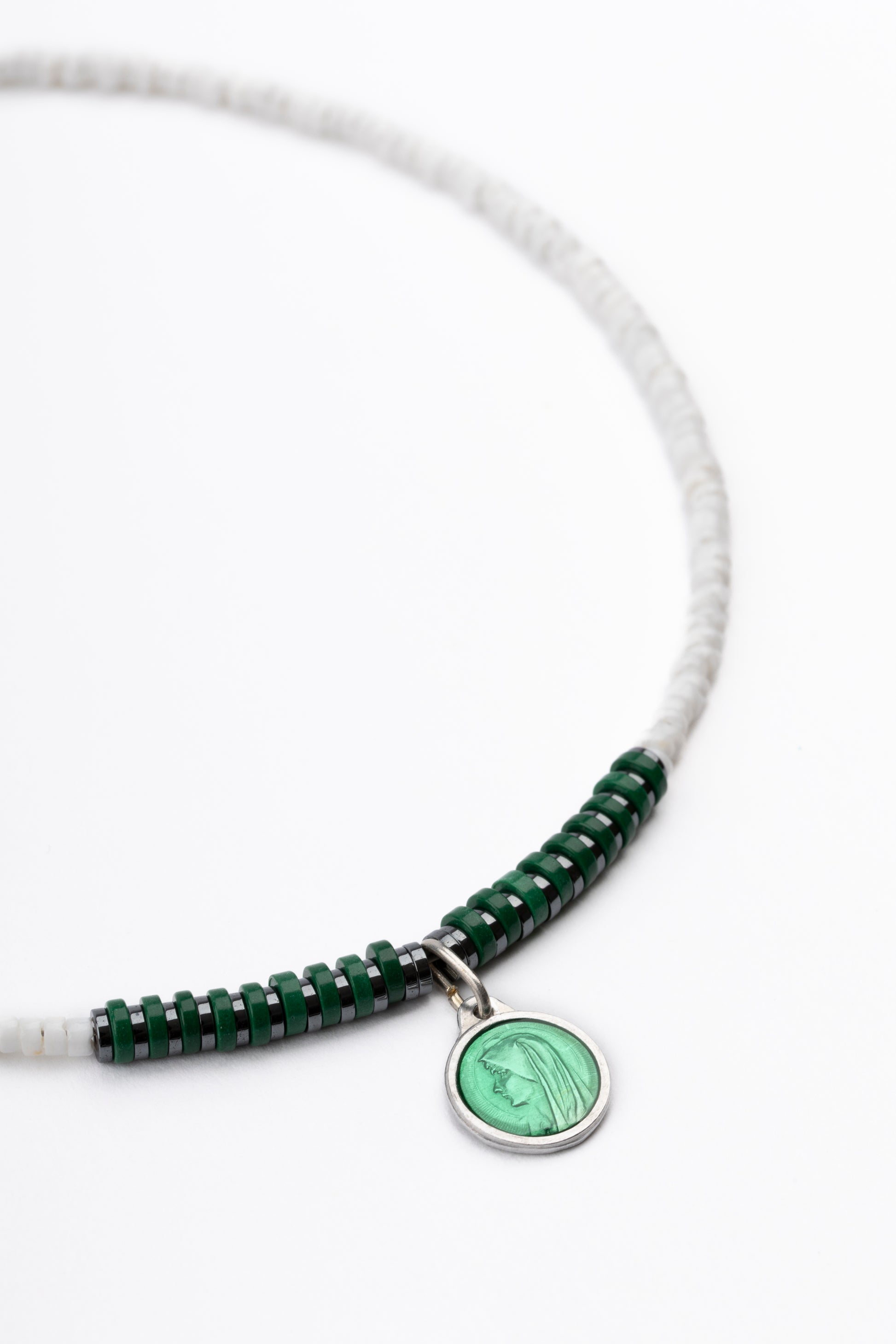 White Sea Shell Puka Necklace with Aluminum Epoxy Enamel Virgin Medal, Synthetic Turquoise Beads, Black Volcanic-Derived Hematite Rondelles and Adjustable Platinum Plated Brass Cable Chain.