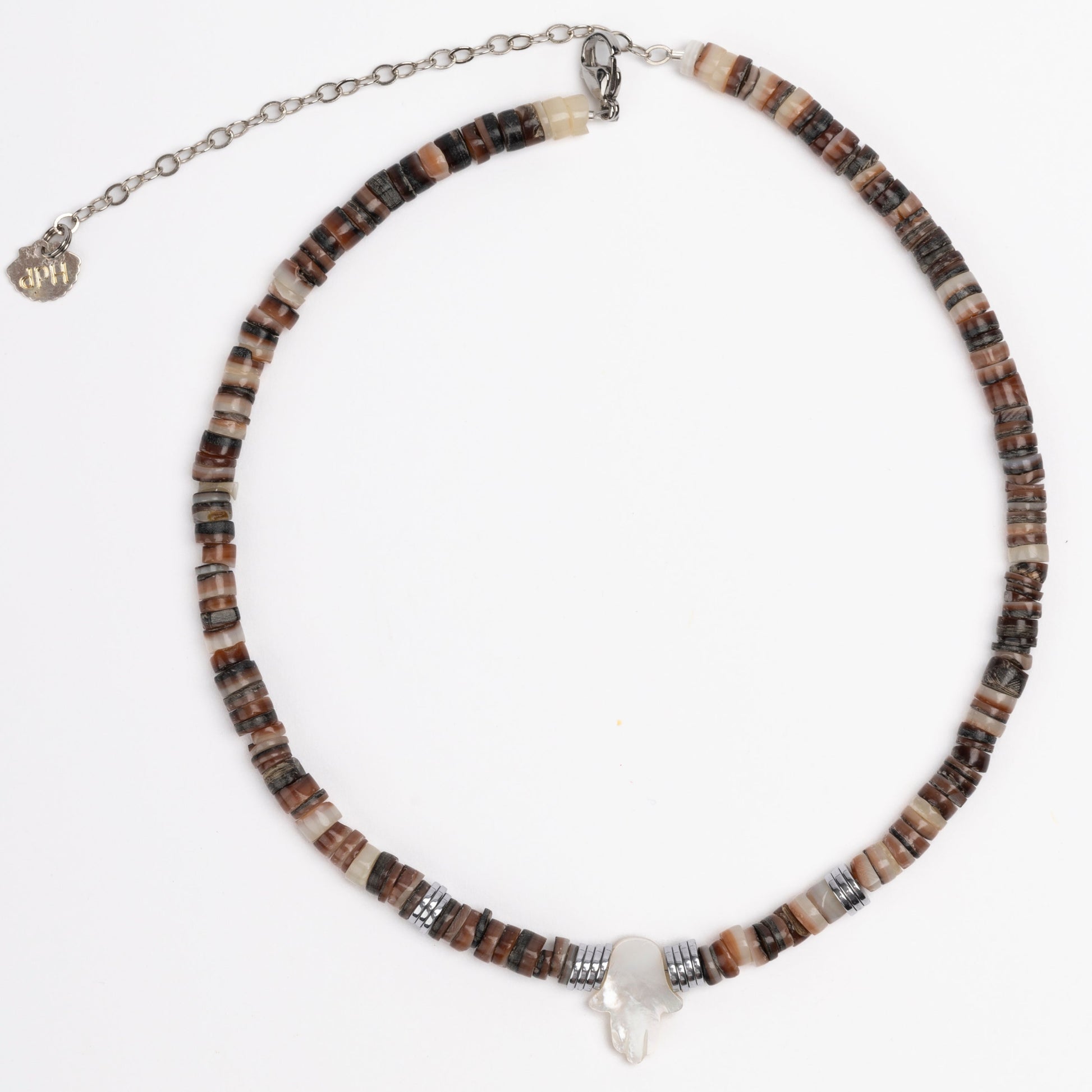Brown 6mm Sea Shell Bead Puka Necklace with Mother of Pearl Hamsa Hand, Volcanic-Derived Hematite Rondelles and Adjustable Platinum Plated Brass Cable Chain.