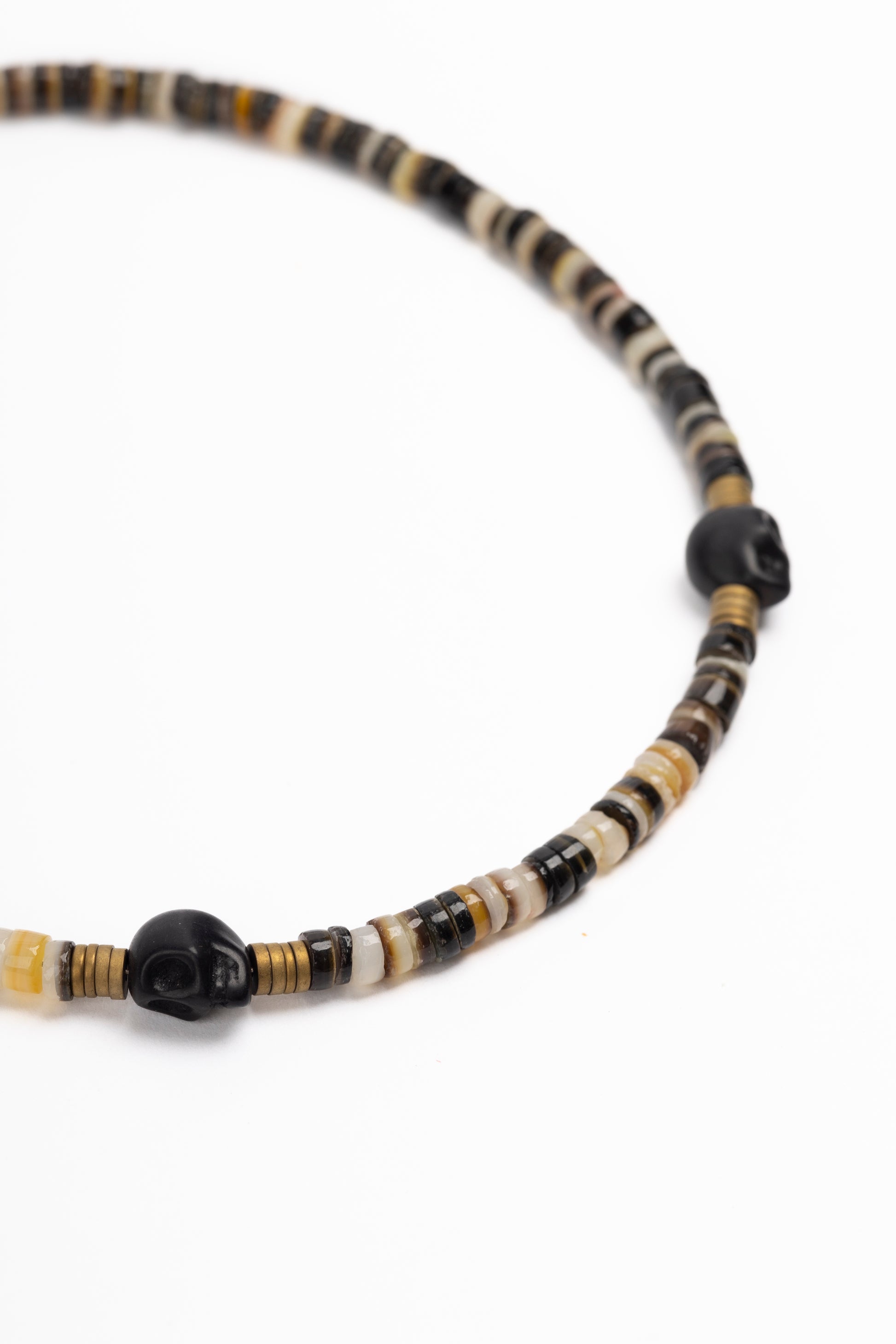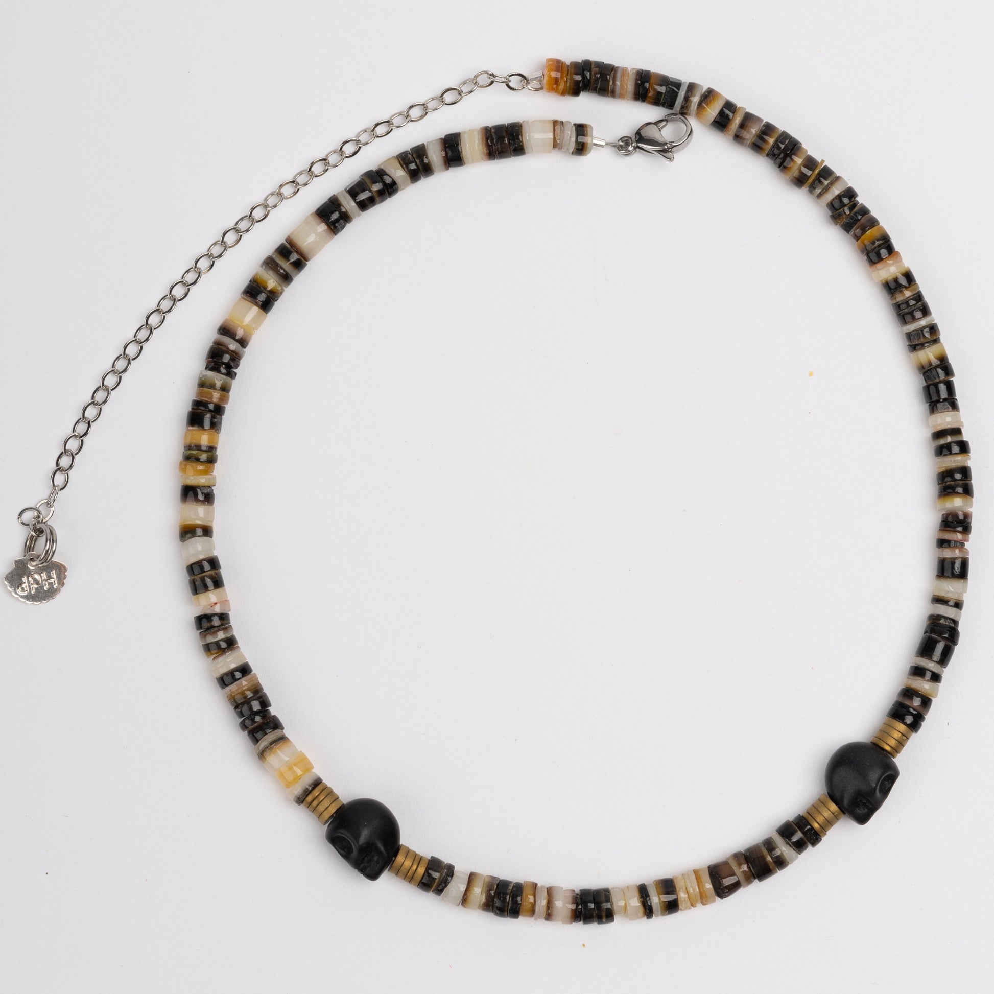 Oyster Shell 5mm Puka Necklace with Black Skulls, Golden Volcanic-Derived Hematite Rondelles and Adjustable Platinum Plated Brass Cable Chain.