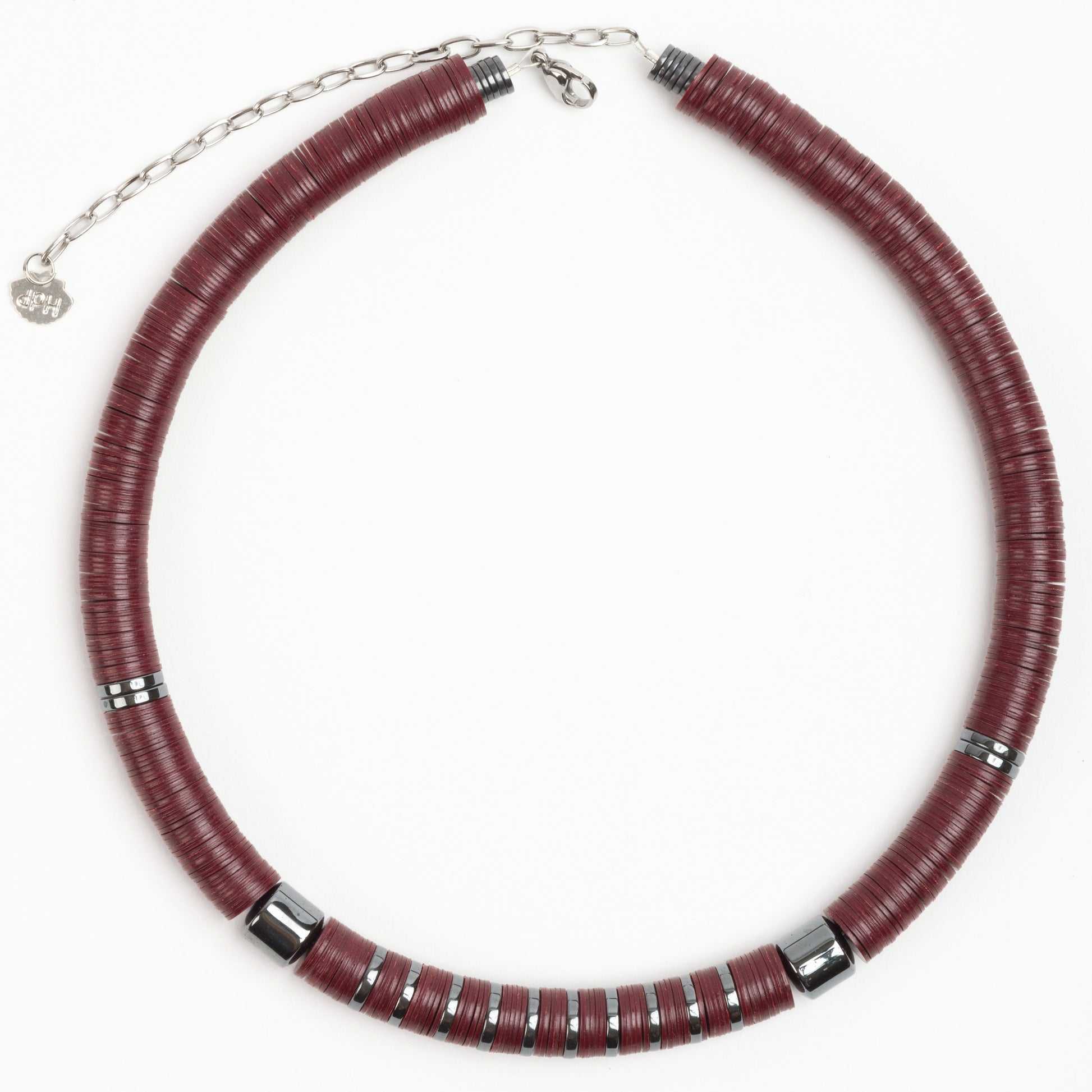 Burgundy 10mm African Bead Necklace with Black Golden Volcanic-Derived Hematite Beads & Rondelles and Adjustable Platinum Plated Brass Cable Chain.