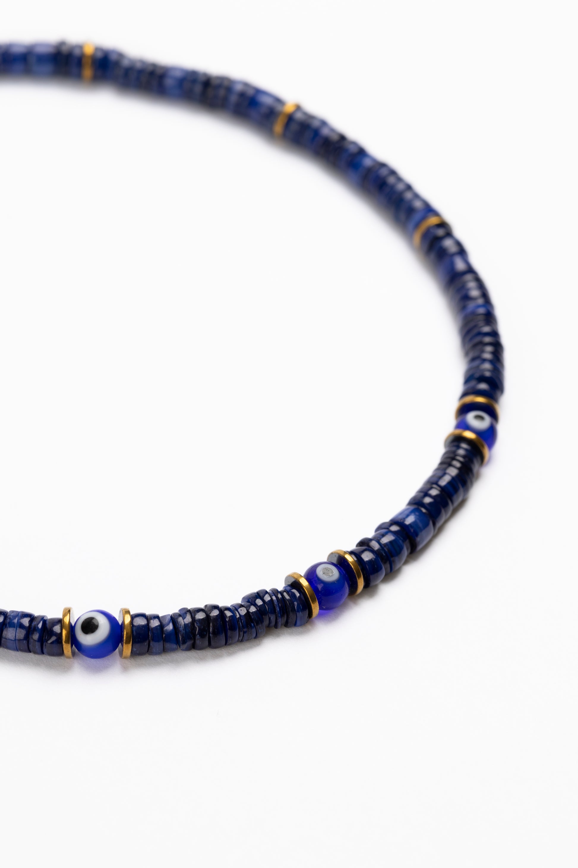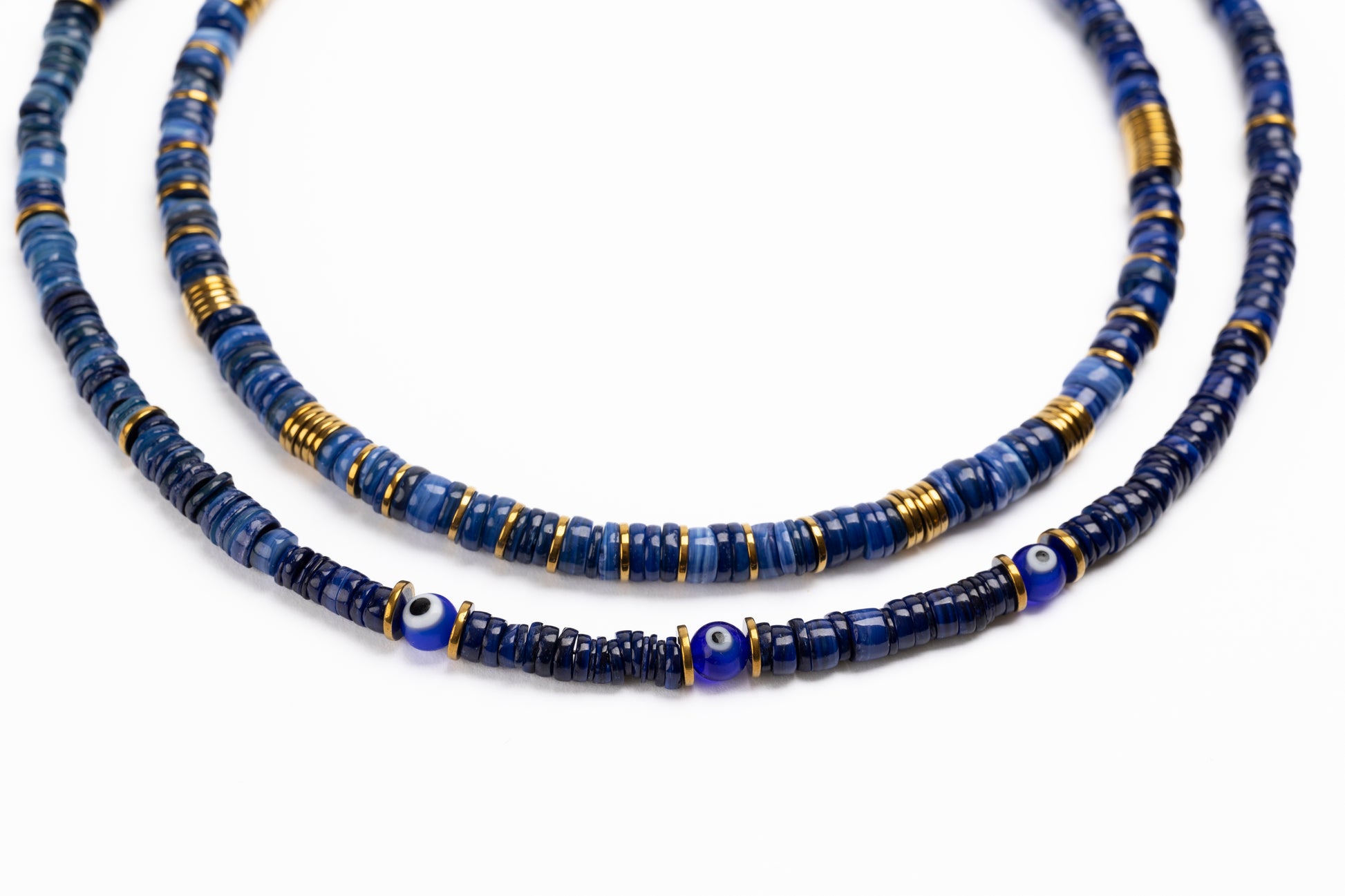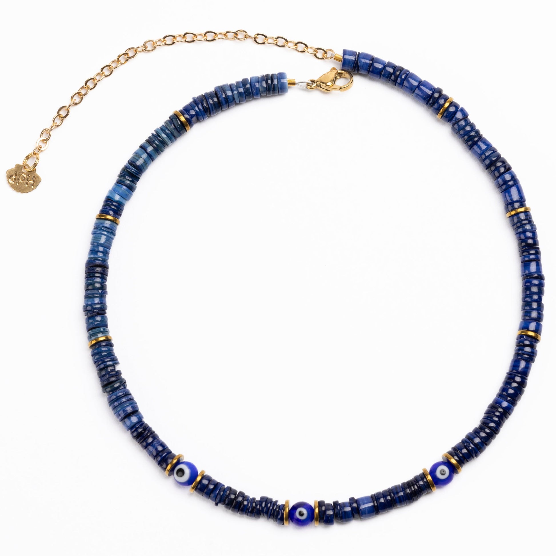 Blue Dyed Shell Puka Necklace with Evil Eye Lalpwork Beads, Golden Volcanic-Derived Hematite Rondelles and Adjustable Gold Plated Brass Cable Chain.