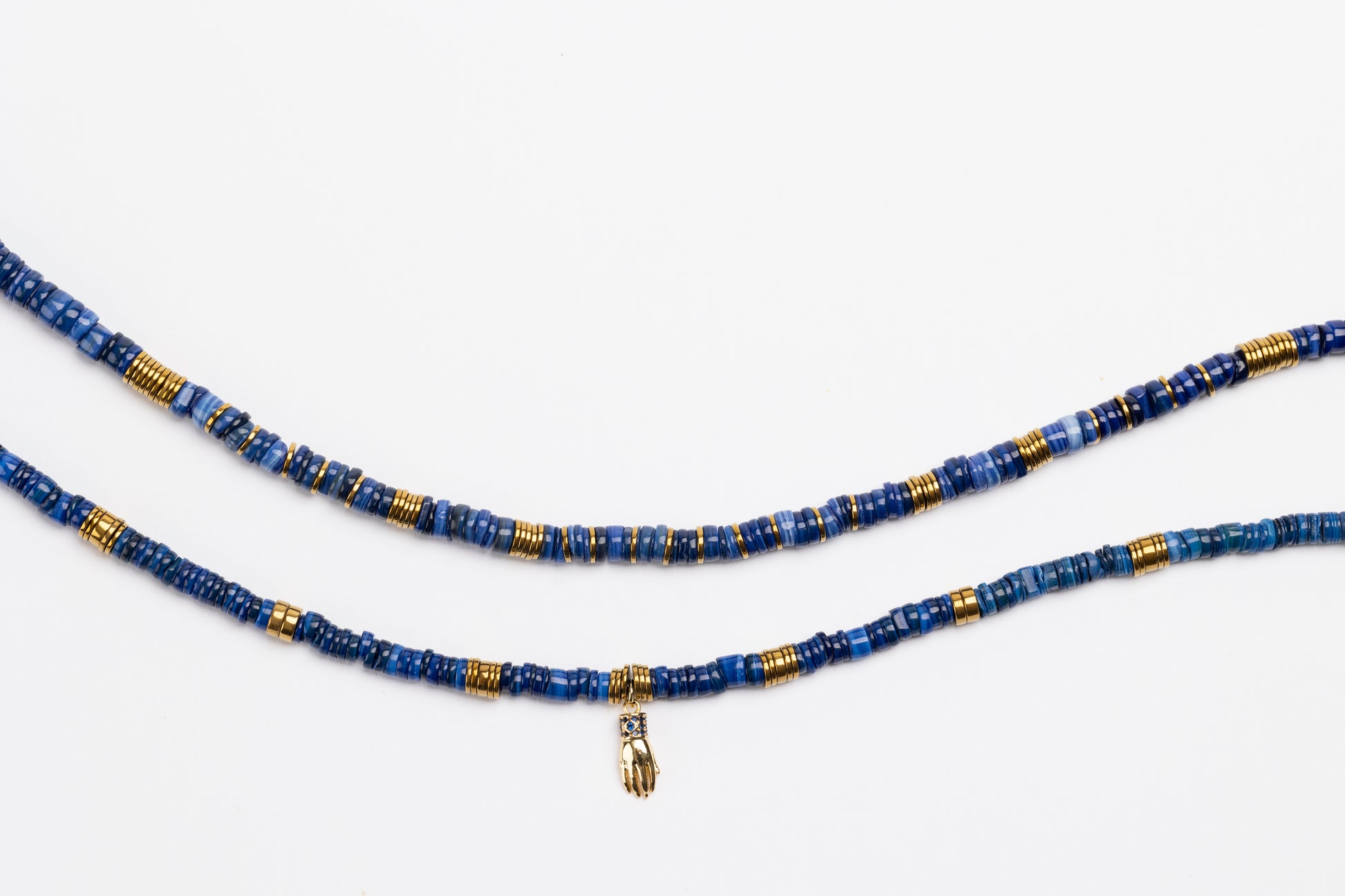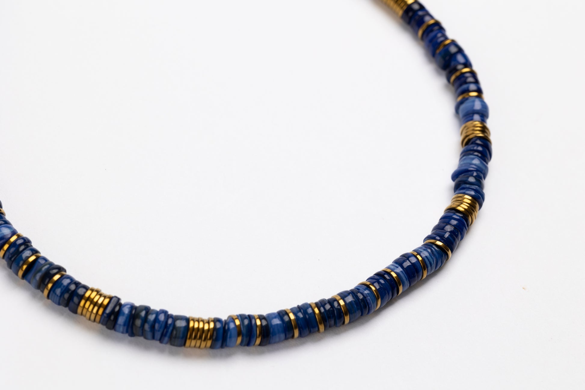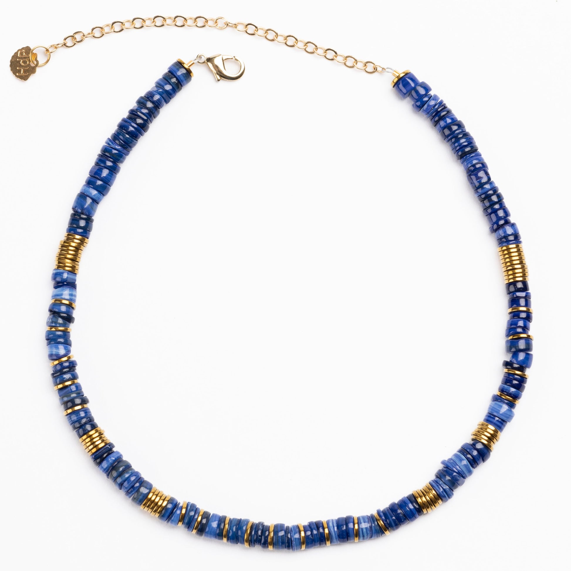 Blue Dyed Shell Puka Necklace with Golden Volcanic-Derived Hematite Rondelles and Adjustable Gold Plated Brass Cable Chain.