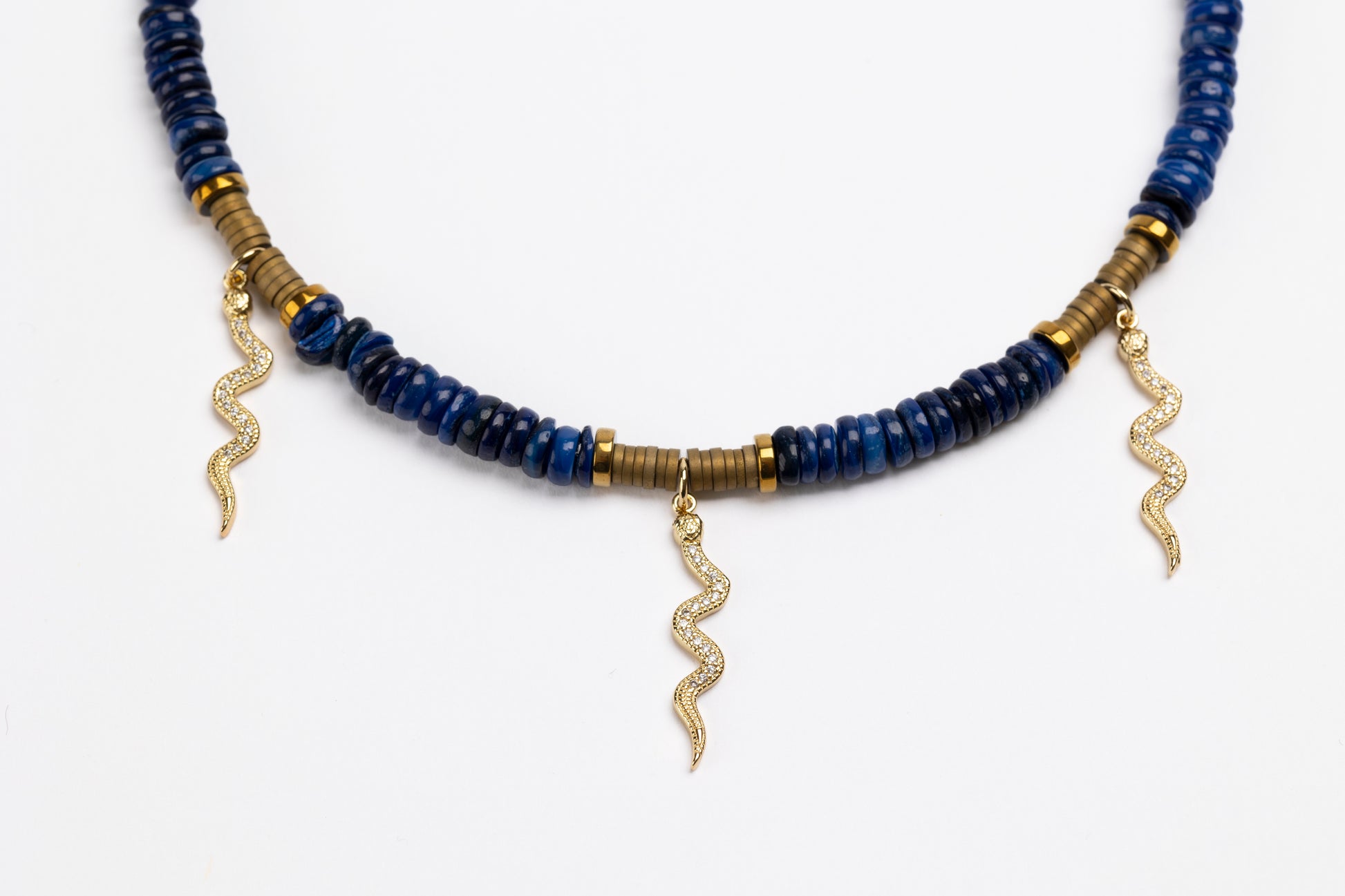 Blue Dyed Shell Puka Necklace with Micro Pave Cubic Zirconia Snakes, Golden Volcanic-Derived Hematite Rondelles and Adjustable Gold Plated Brass Cable Chain.