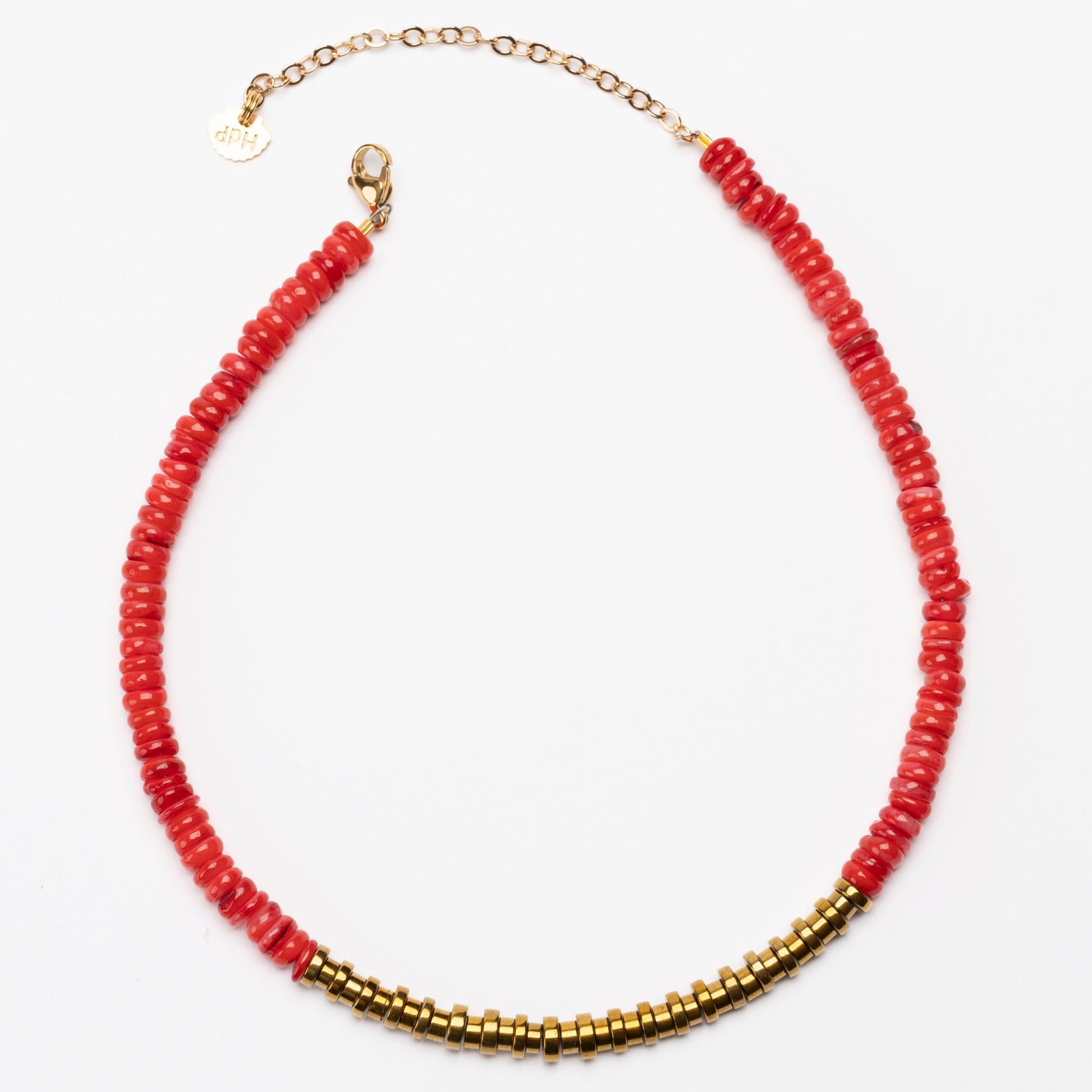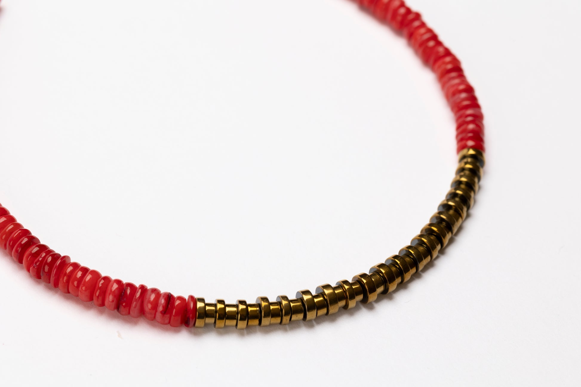 Red Dyed Shell Puka Necklace with Golden Volcanic-Derived Hematite Rondelles and Adjustable Gold Plated Brass Cable Chain.