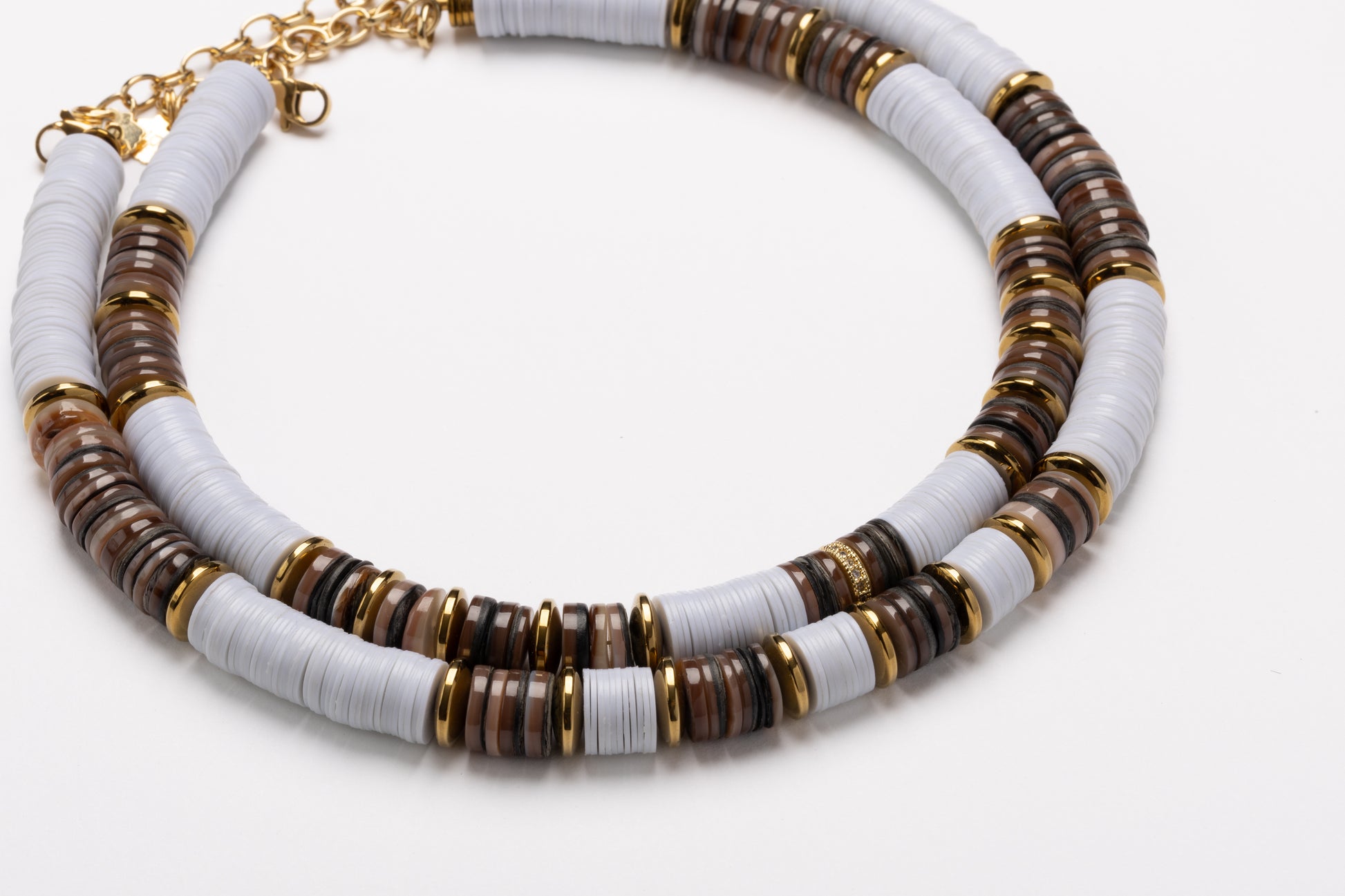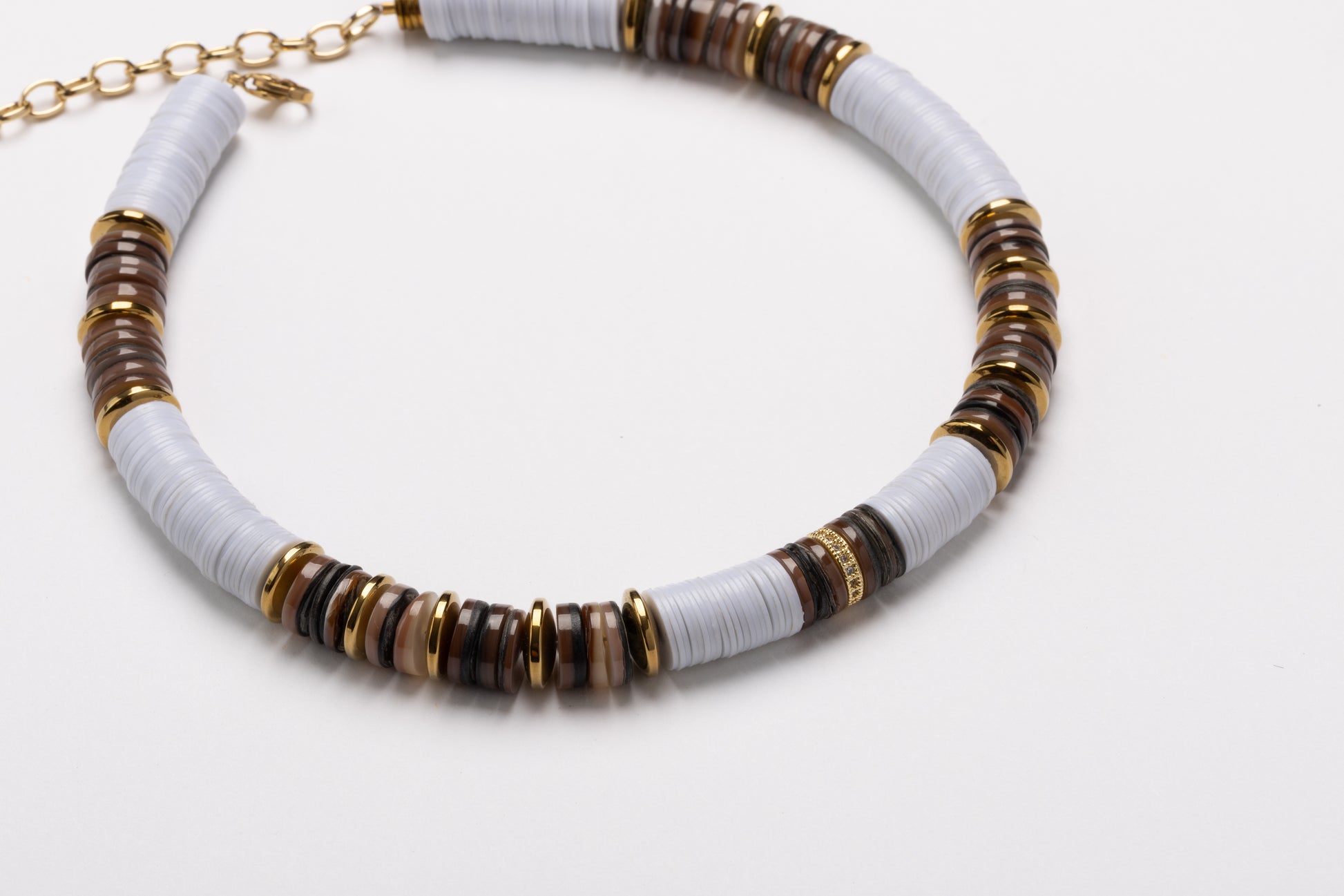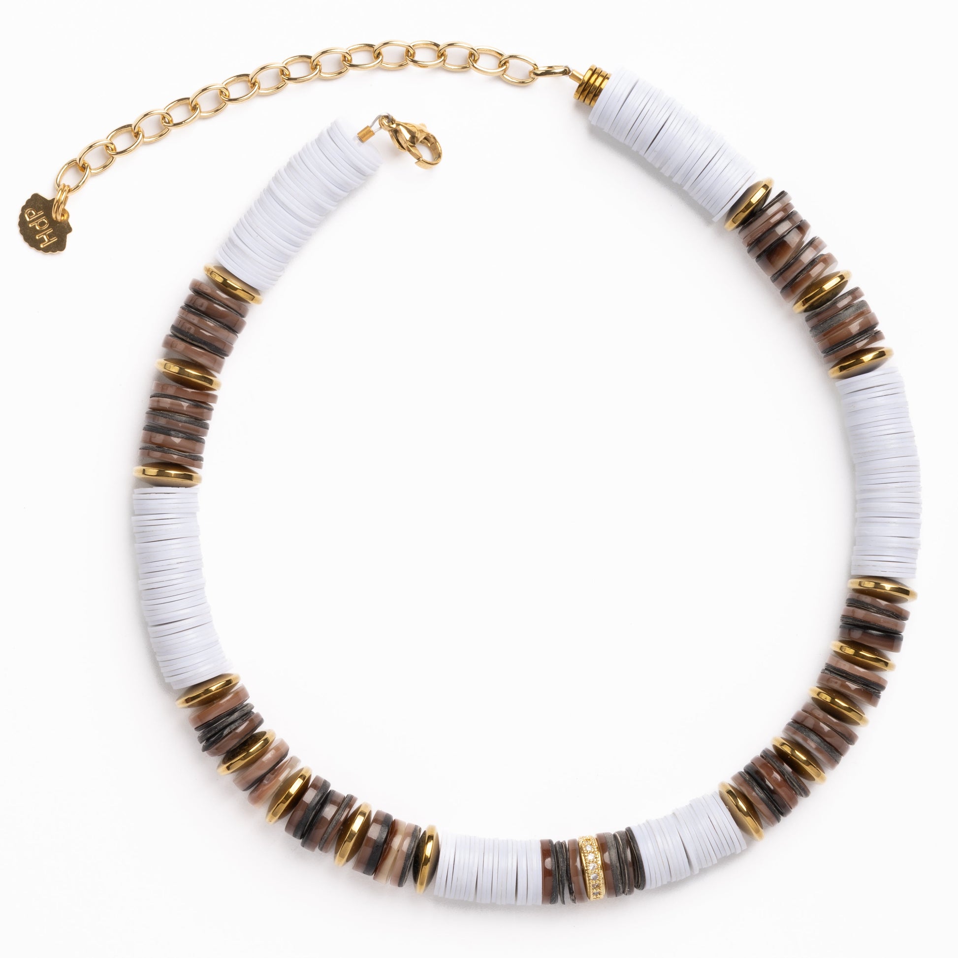 Jaipur 10mm Brown Sea Shell Necklace with White African Beaads, Micro Pave Cubic Zirconia Rondelles and Gold Volcanic-Derived Hematite Rondelles and Adjustable Gold Plated Brass Cable Chain.