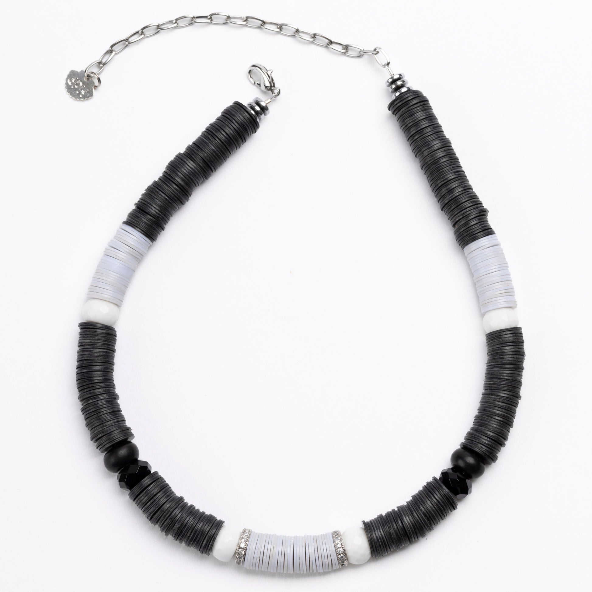 Black/White 10mm African Bead Necklace with Micro Pave Cubic Zirconia and Adjustable Platinum Plated Brass Cable Chain.