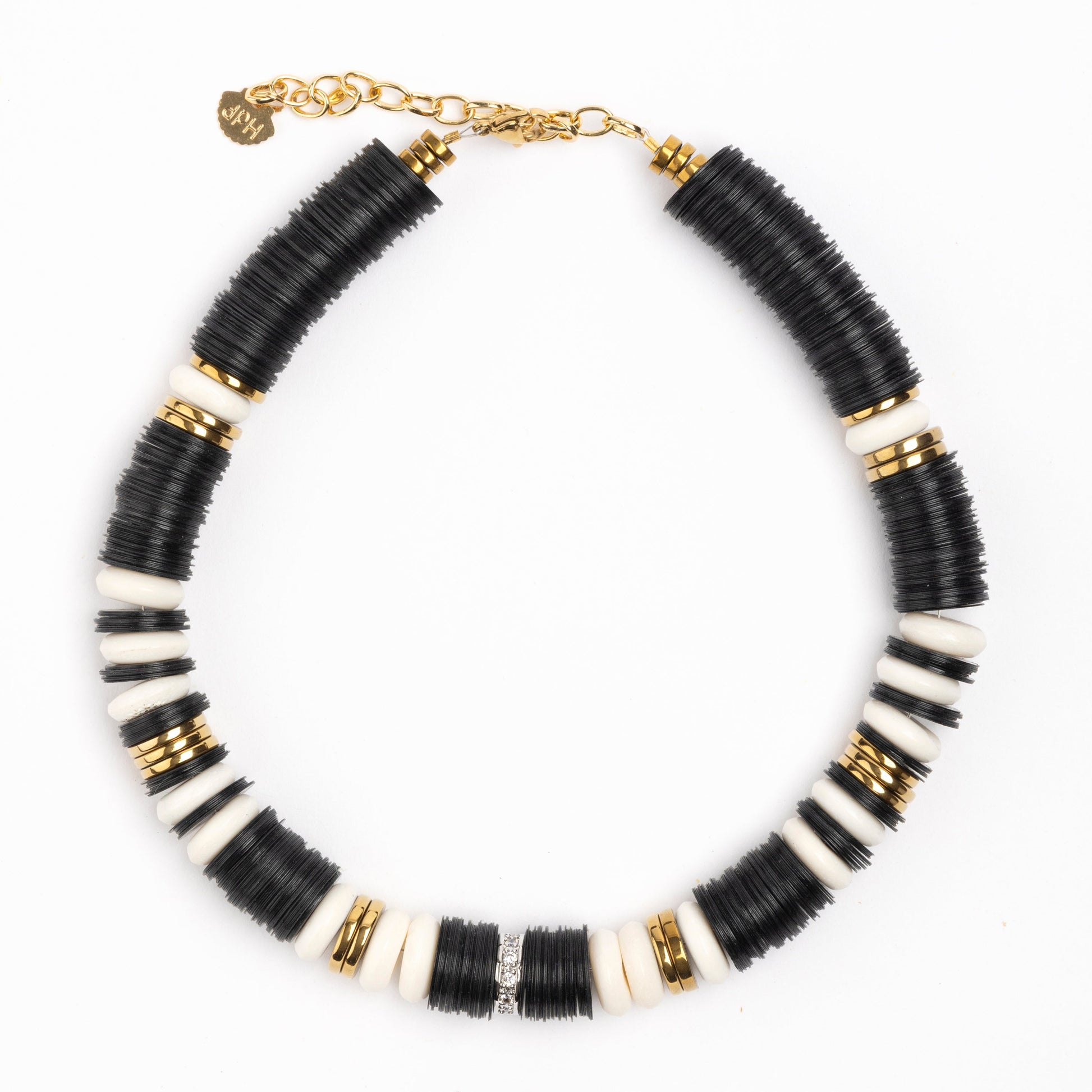 Black/Cream 14mm African Bead Necklace with Bone Beads, Micro Pave Cubic Zirconia and Golden Volcanic-Derived Hematite Rondelles and Adjustable Gold Plated Brass Cable Chain.