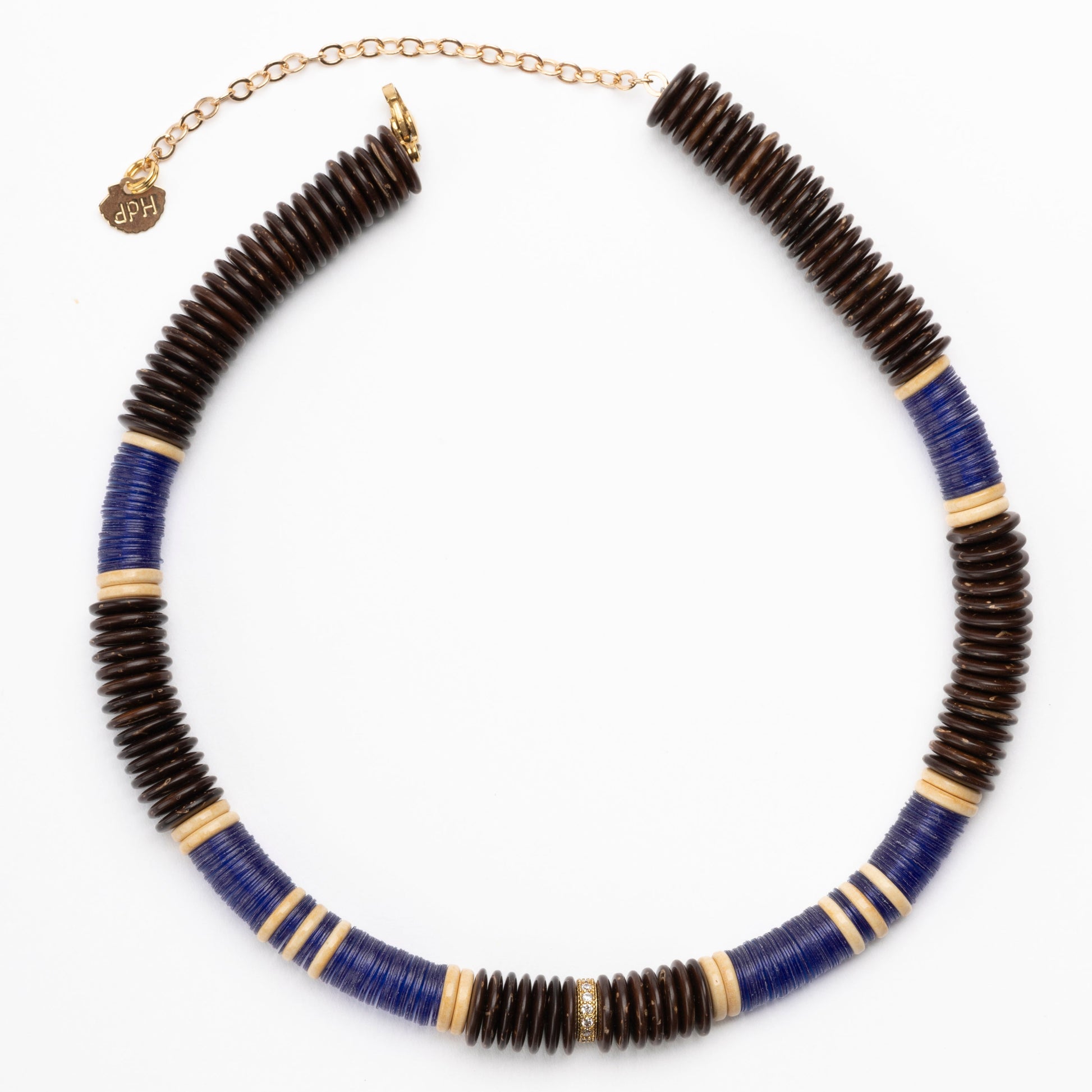 Brown 8mm Coconut Bead Necklace with Blue African beads, Dijon Agate Beads, Micro Pave Cubic Zirconia and Golden Volcanic-Derived Hematite Rondelles and Adjustable Gold Plated Brass Cable Chain.