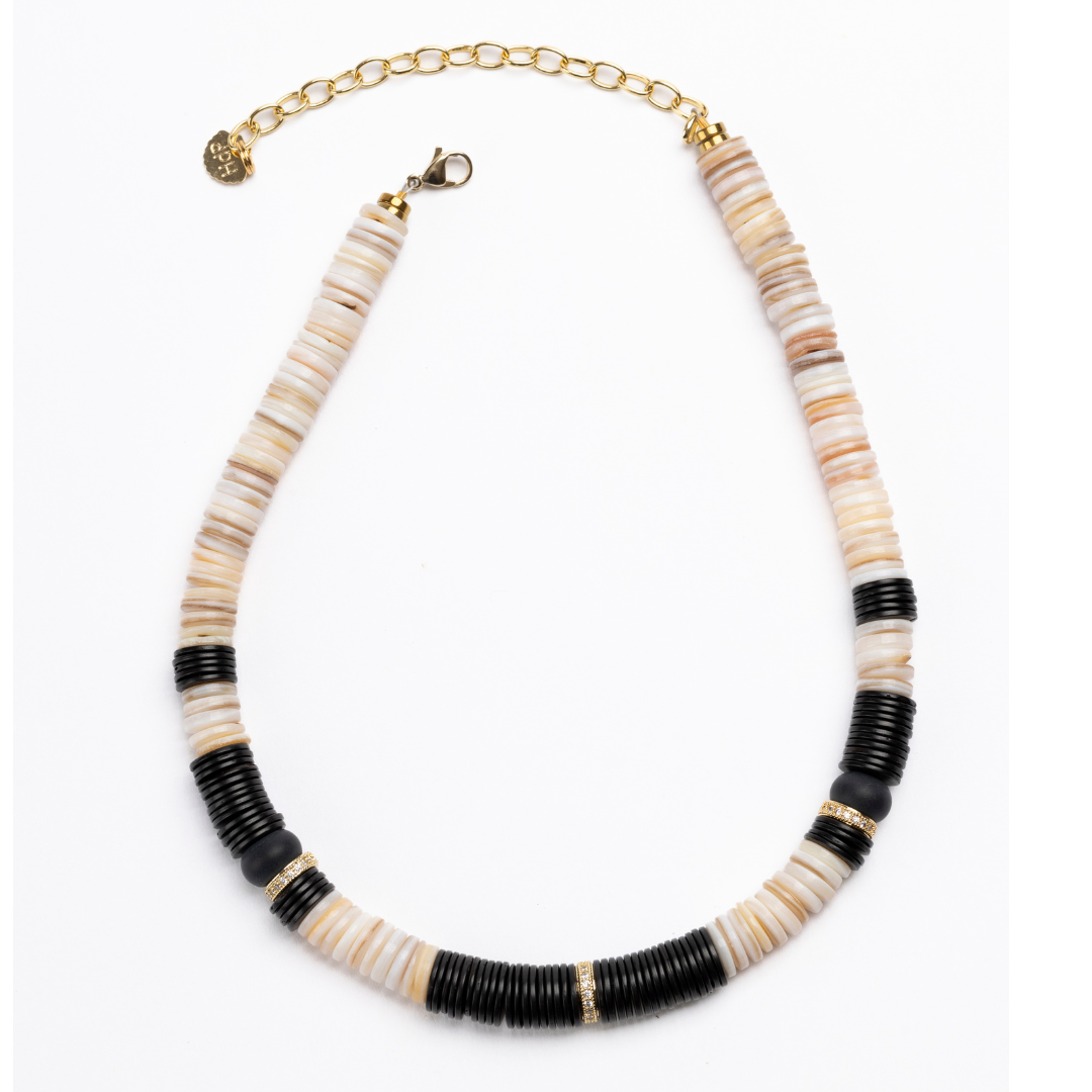 Cream Sea Shell Bead 10mm Necklace with Black Coconut Beads, Micro Pave Cubic Zirconia Rondelles and Adjustable Gold Plated Brass Cable Chain.