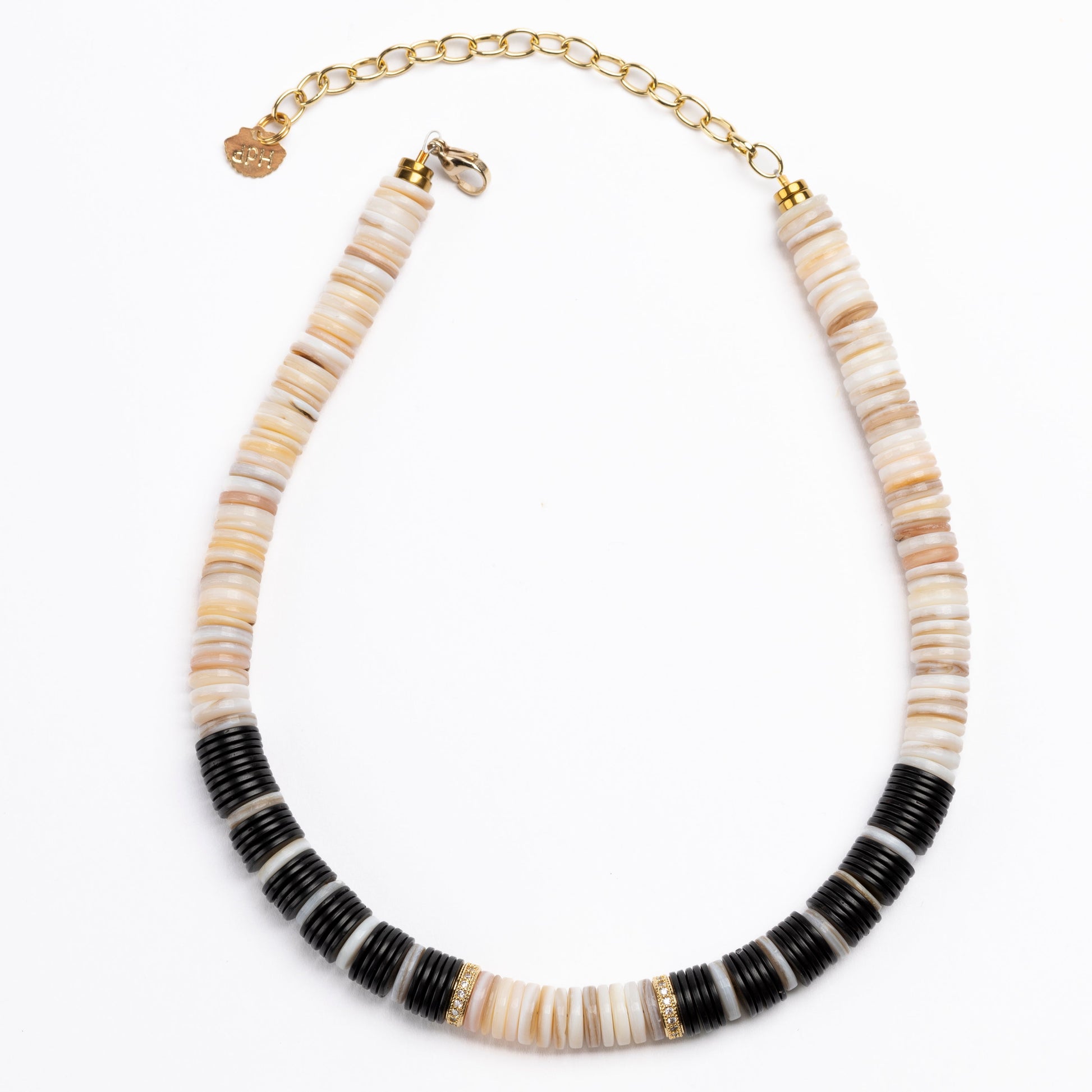 Cream Sea Shell Bead 10mm Necklace with Black Coconut Beads, Micro Pave Cubic Zirconia Rondelles and Adjustable Gold Plated Brass Cable Chain.