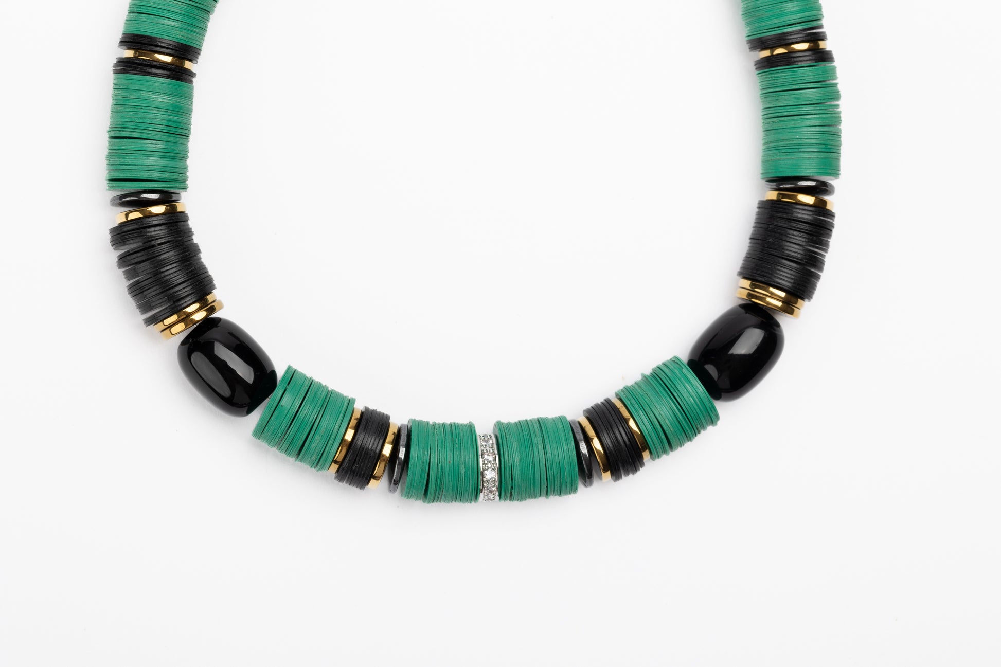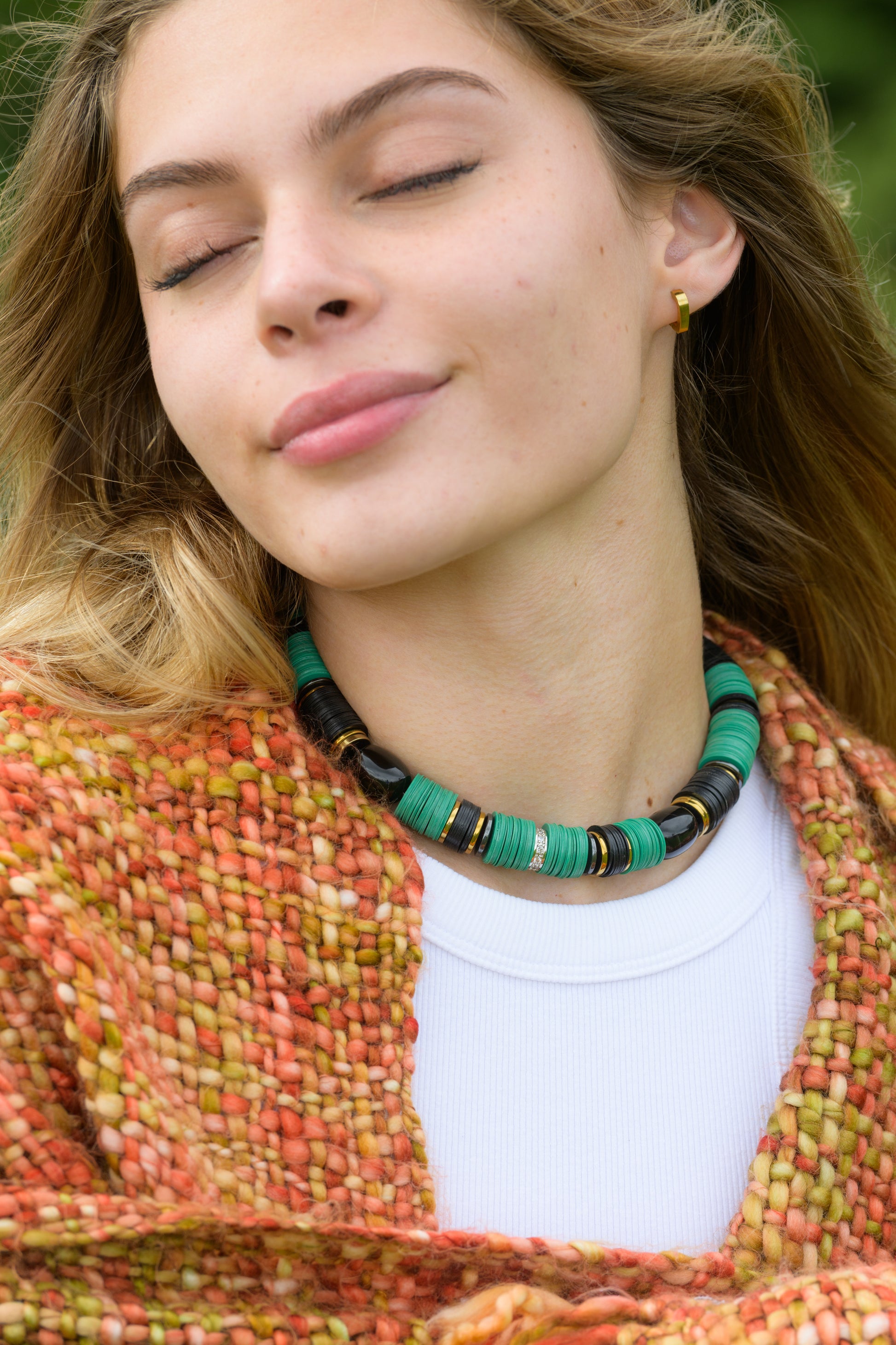 Black/Green 14mm African Bead Necklace w/ Black Onyx Beads, Micro Pave Cubic Zirconia and Golden Volcanic-Derived Hematite Rondelles and Adjustable Gold Plated Brass Cable Chain.