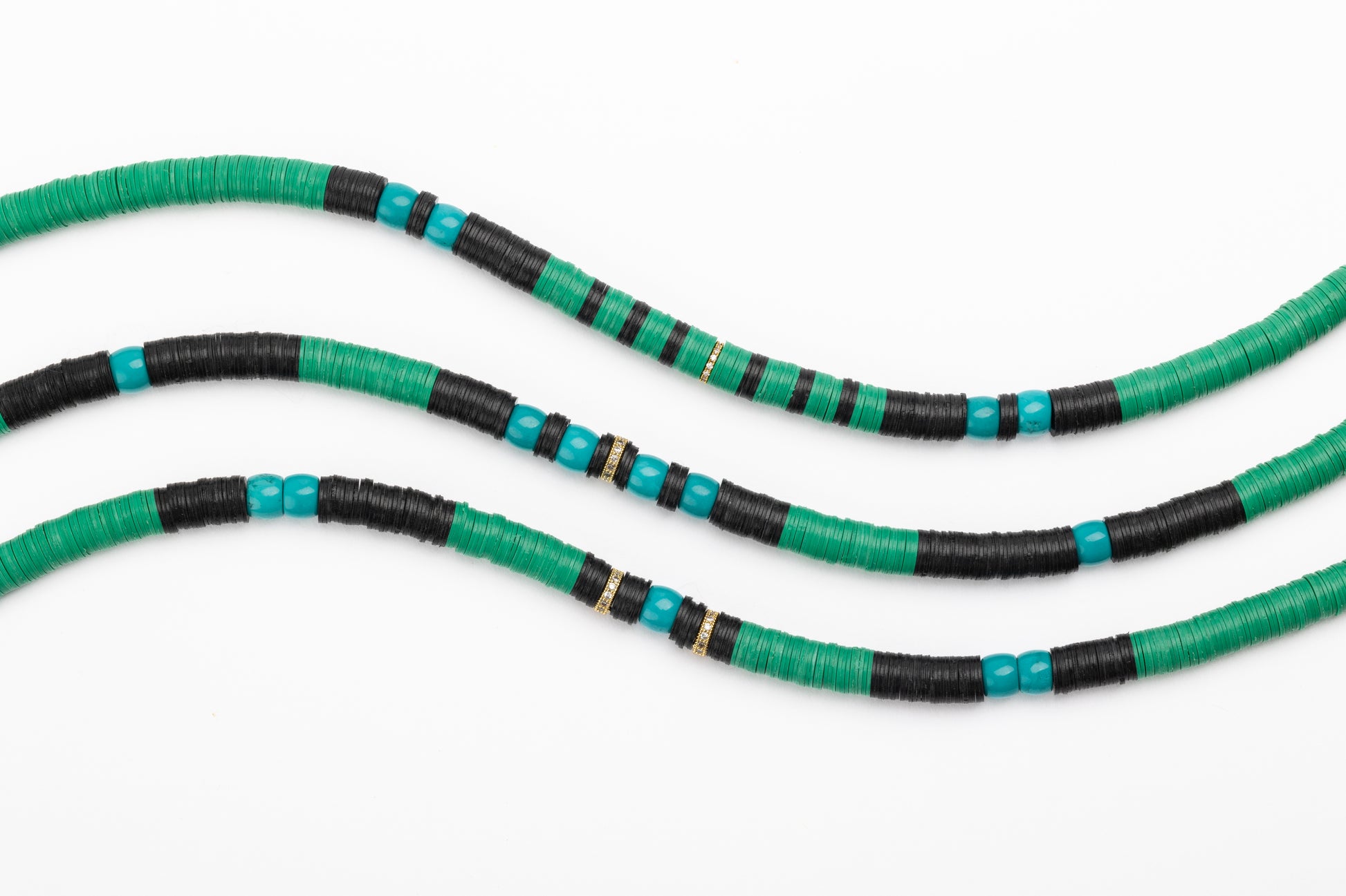 Green/Black 8mm African Bead Necklace with Turquoise Powder beads, Micro Pave Cubic Zirconia Rondelles and Adjustable Gold Plated Brass Cable Chain.