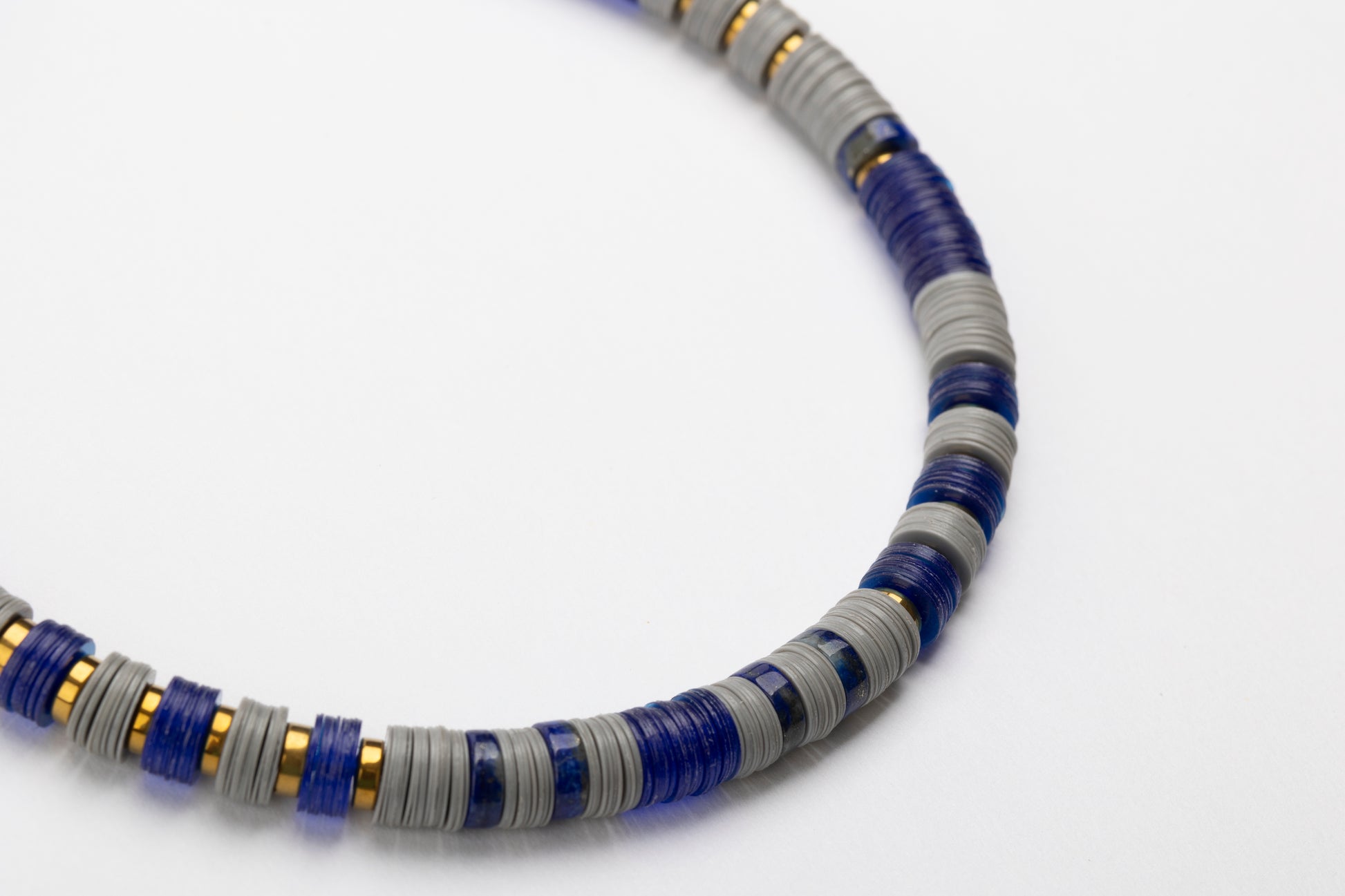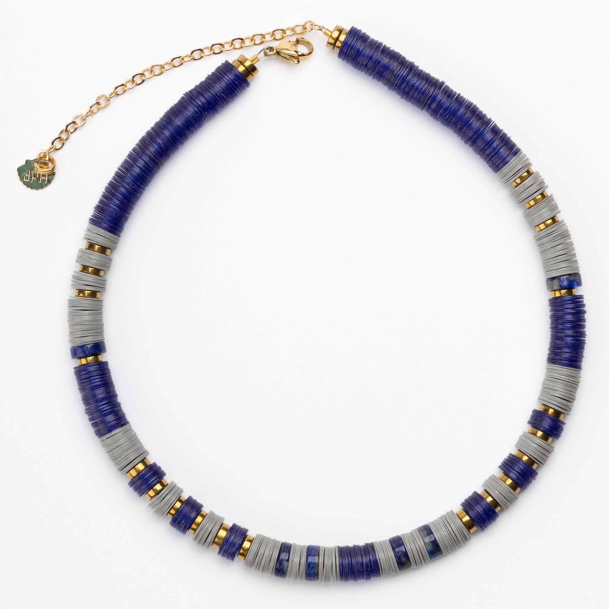 Blue/Grey 8mm African Bead Necklace with Golden Volcanic-Derived Hematite Rondelles and Adjustable Gold Plated Brass Cable Chain.