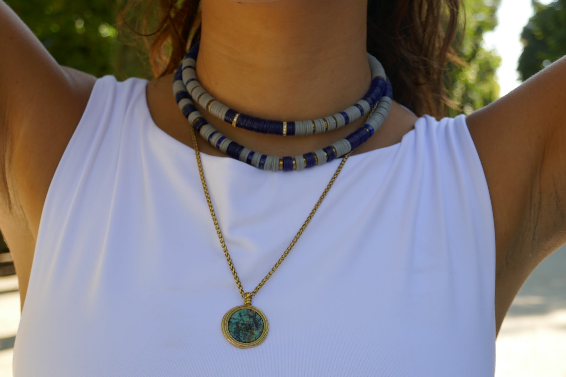Embrace the bold and vibrant spirit of India with Hijas de Puka's JAIPUR collection. Inspired by India's rich colors and bold styles, this collection features necklaces adorned with colorful Vinyl African beads. Each piece is a harmonious blend of lively Indian hues and elegant design, perfect for adding a touch of glamour and cultural flair to any outfit.
