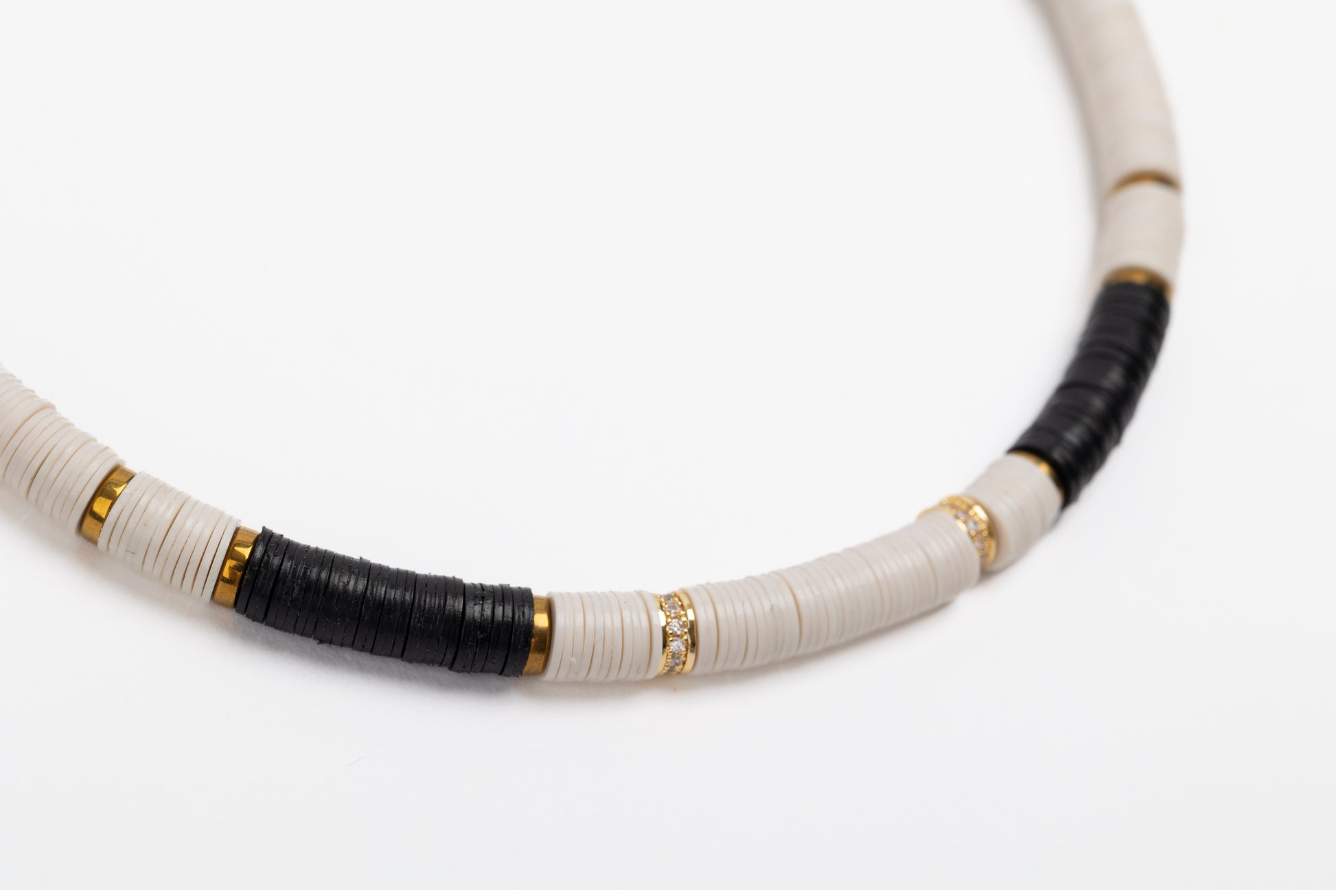 Black/Cream 6mm African Bead Necklace with Micro Pave Cubic Zirconia and Golden Volcanic-Derived Hematite Rondelles and Adjustable Gold Plated Brass Cable Chain.