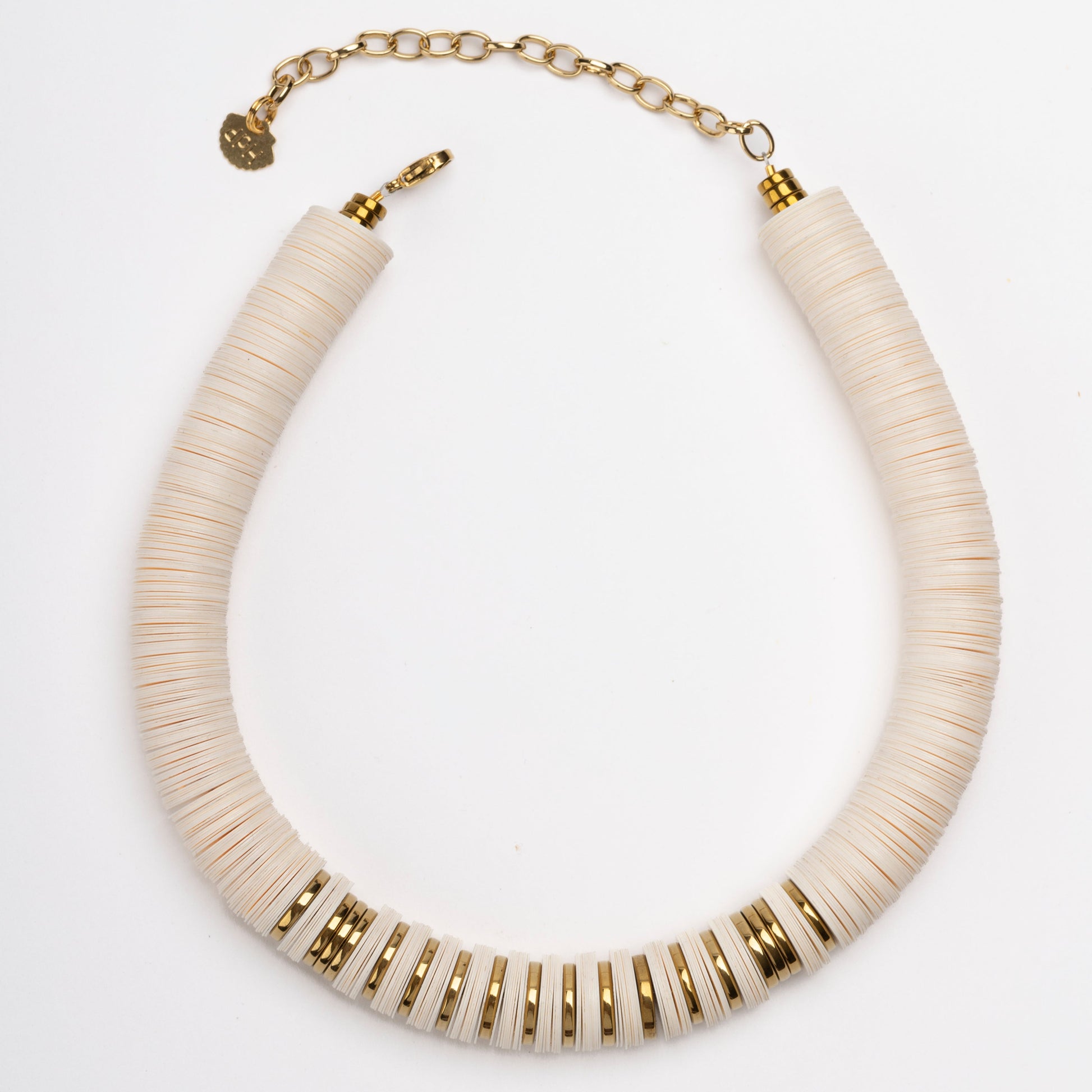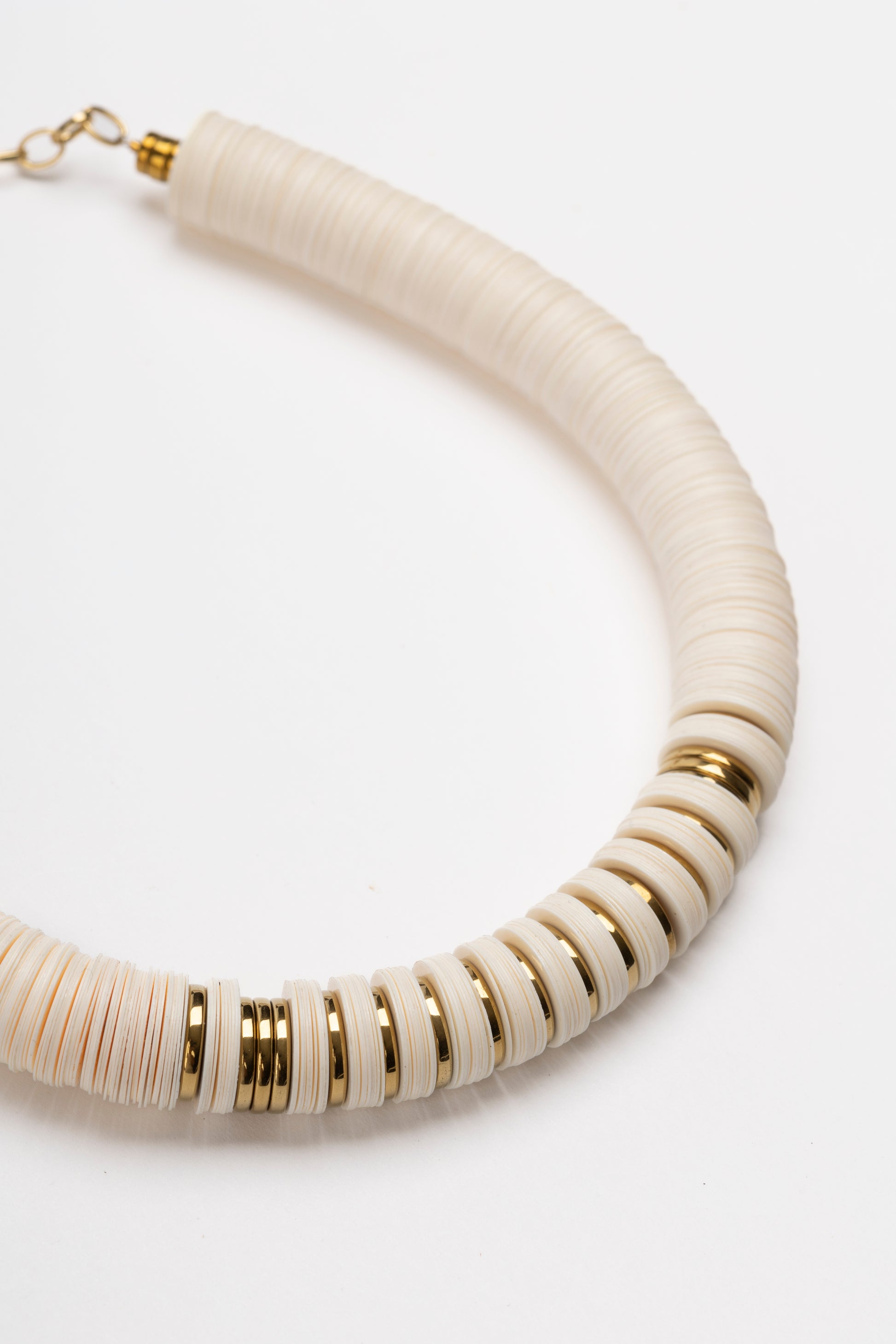 Cream 14mm African Bead Necklace with Golden Volcanic-Derived Hematite Rondelles and Adjustable Gold Plated Brass Cable Chain.