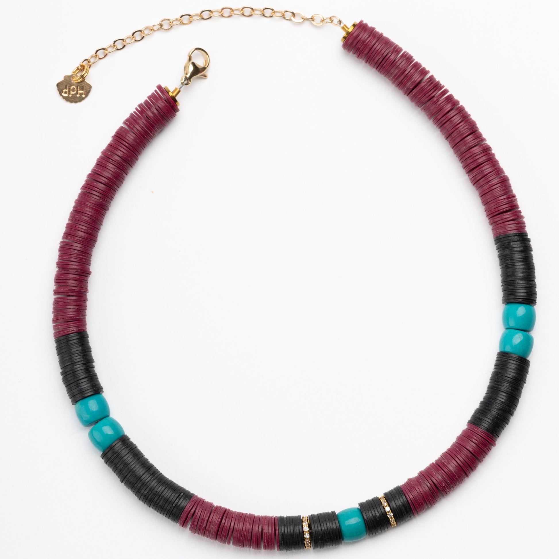Burgundy/Black 8mm African Bead Necklace with Turquoise Powder Beads, Micro Pave Cubic Zirconia Rondelles and Adjustable Gold Plated Brass Cable Chain.