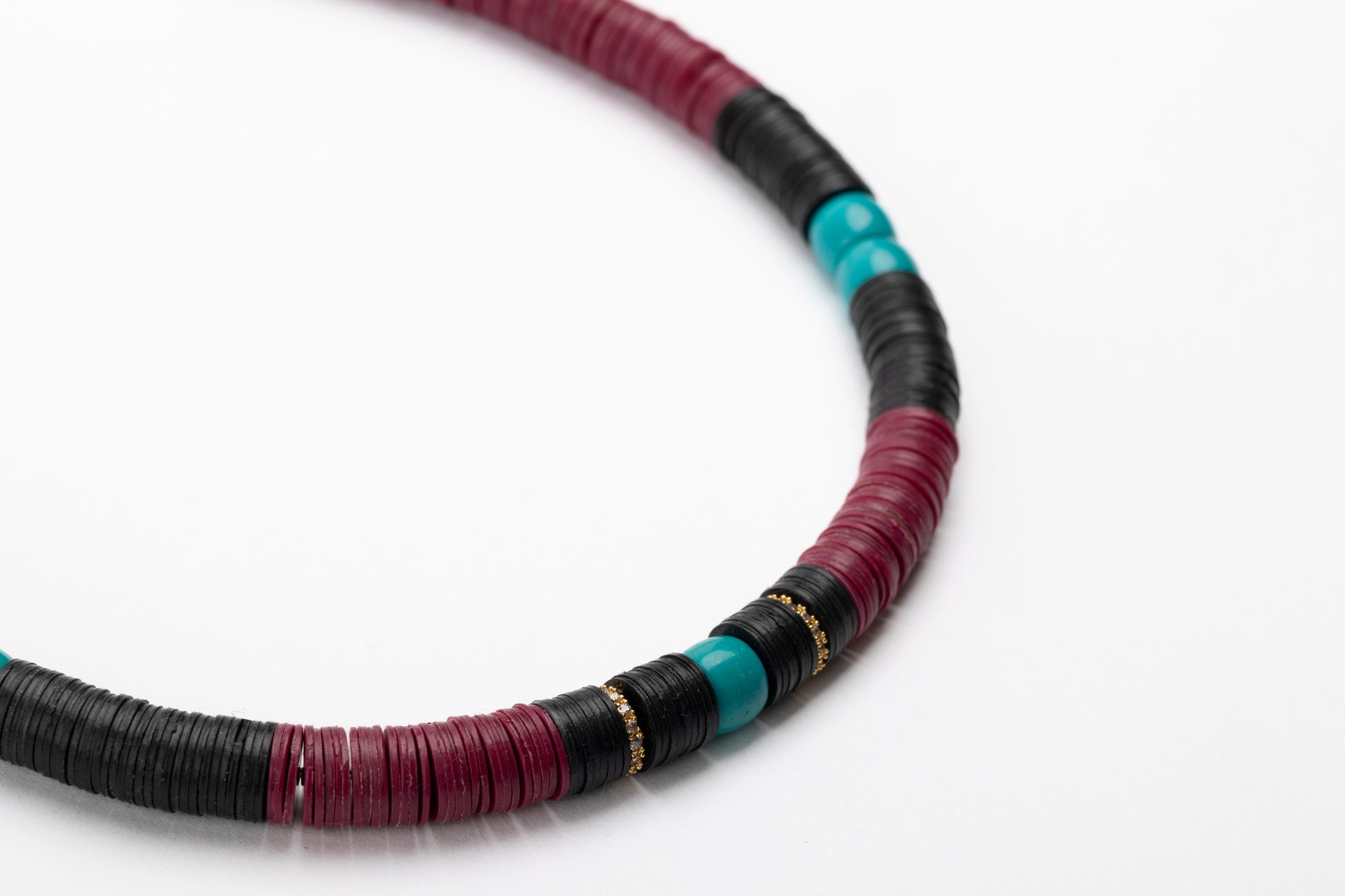 Embrace the bold and vibrant spirit of India with Hijas de Puka's JAIPUR collection. Inspired by India's rich colors and bold styles, this collection features necklaces adorned with colorful Vinyl African beads. Each piece is a harmonious blend of lively Indian hues and elegant design, perfect for adding a touch of glamour and cultural flair to any outfit.