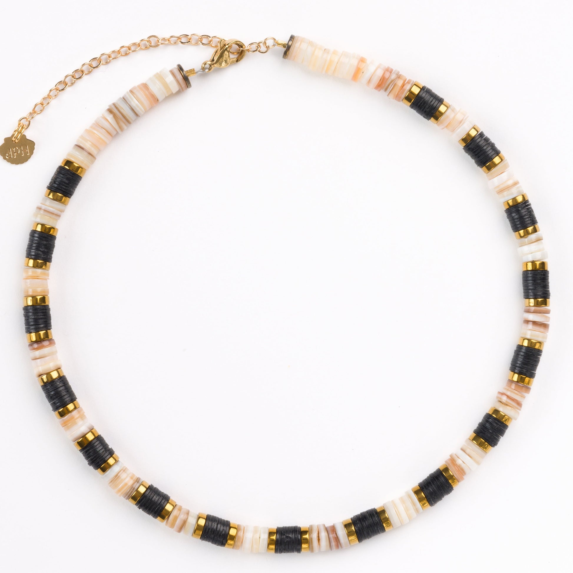 Cream Sea Shell Bead 6mm Necklace with Black African Beads, Golden Volcanic-Derived Hematite Rondelles and Adjustable Gold Plated Brass Cable Chain.