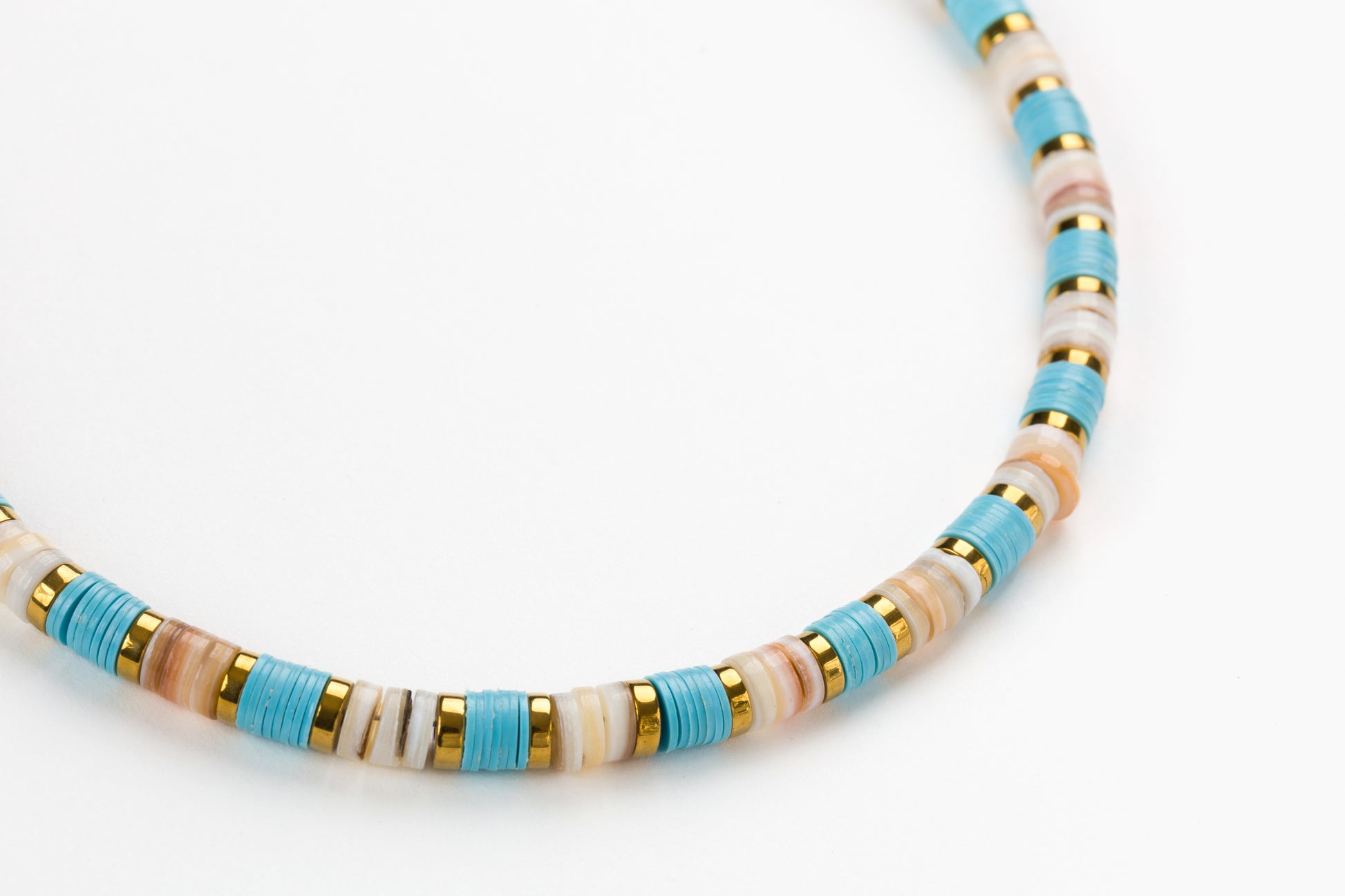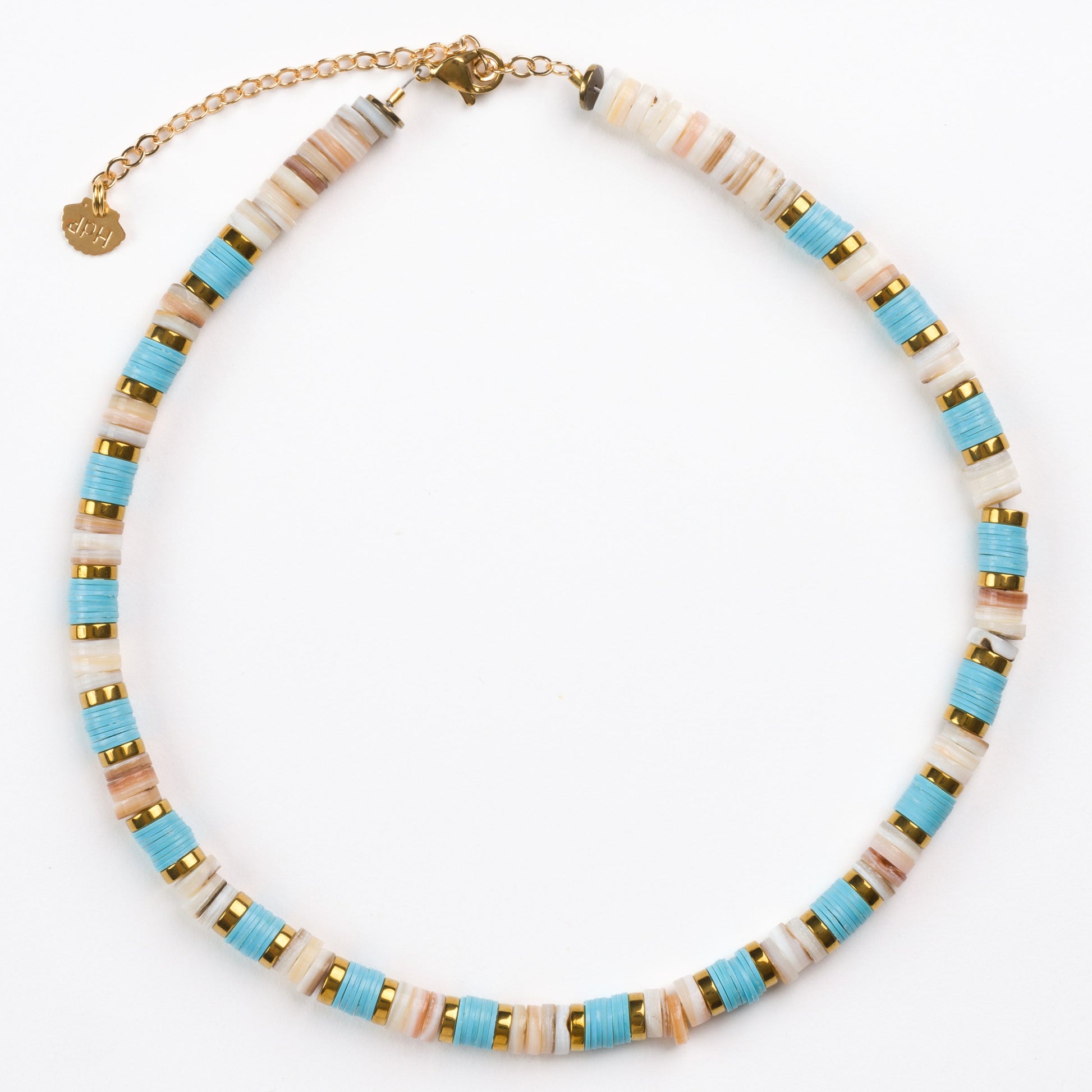 Cream Sea Shell Bead 6mm Necklace with Ligth Blue African Beads, Golden Volcanic-Derived Hematite Rondelles and Adjustable Gold Plated Brass Cable Chain.