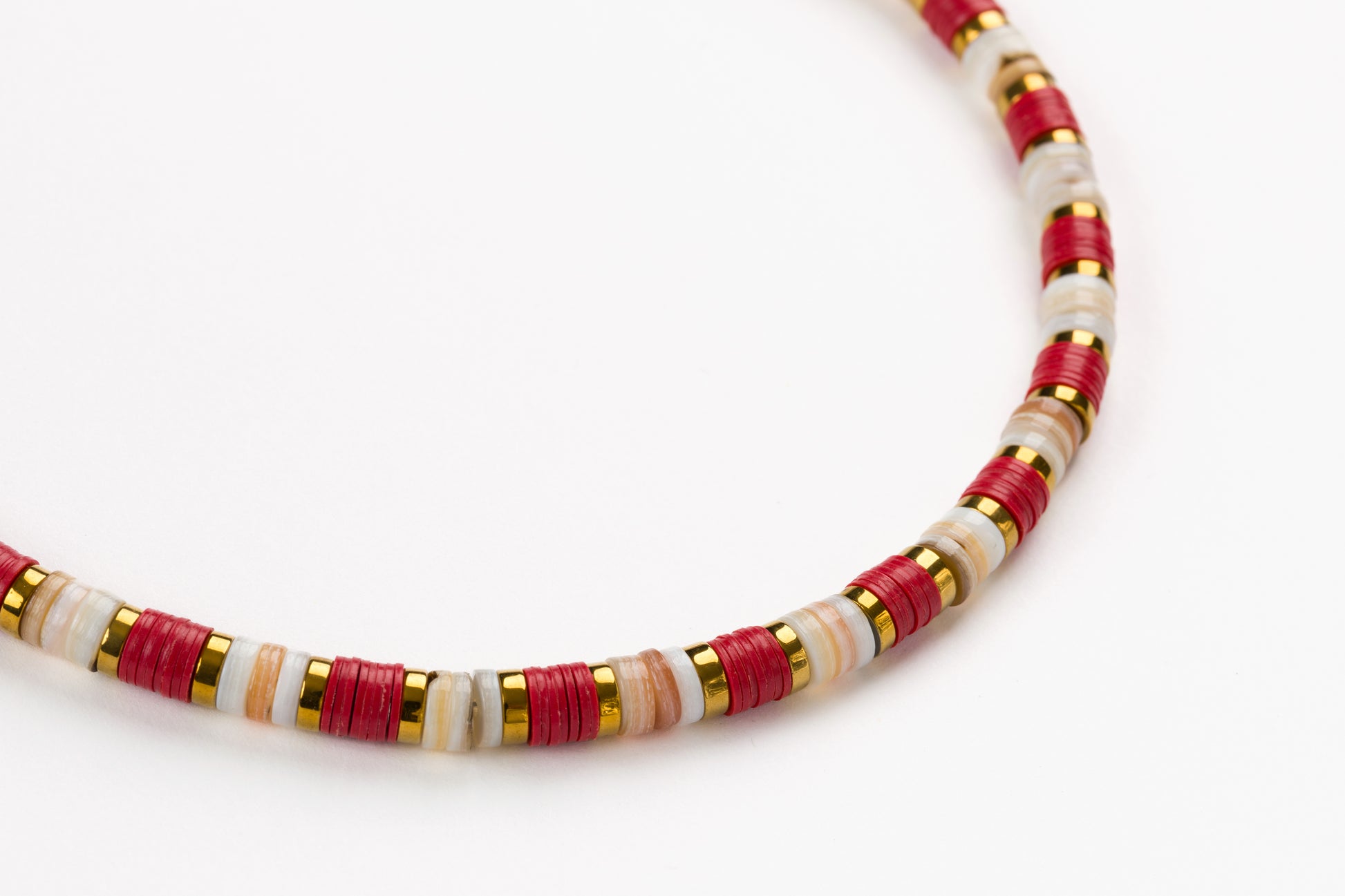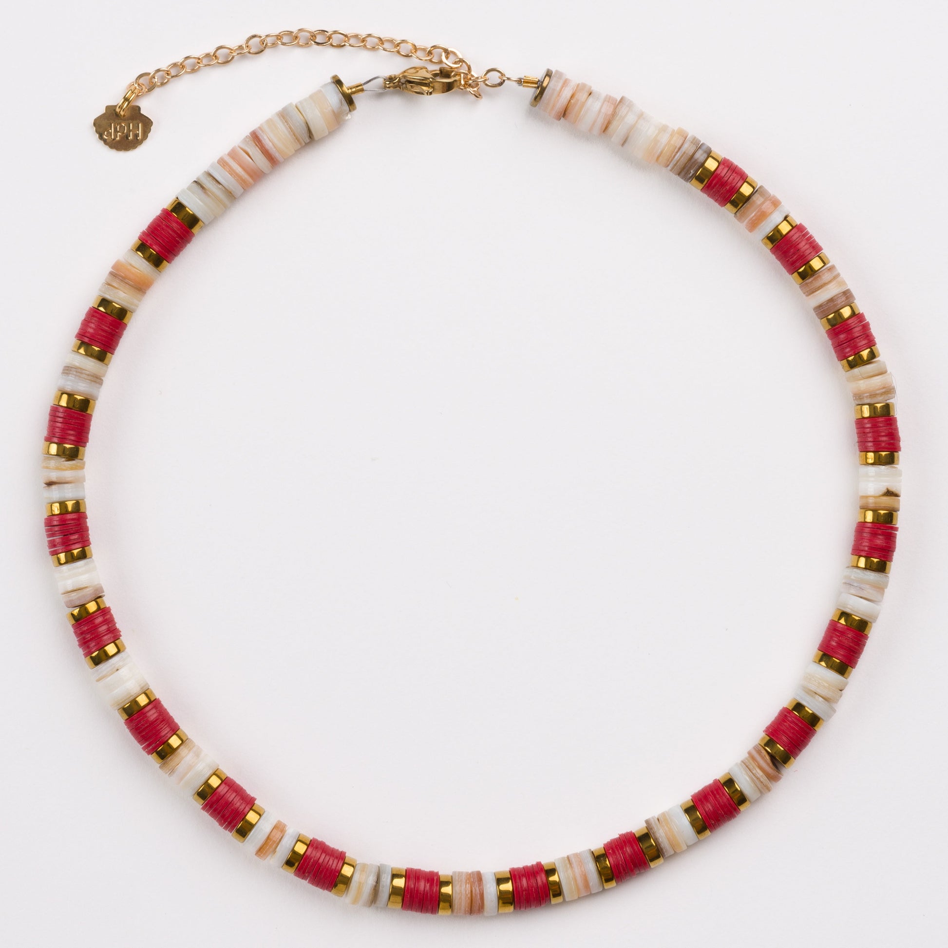 Cream Sea Shell Bead 6mm Necklace with Red African Beads, Golden Volcanic-Derived Hematite Rondelles and Adjustable Gold Plated Brass Cable Chain.