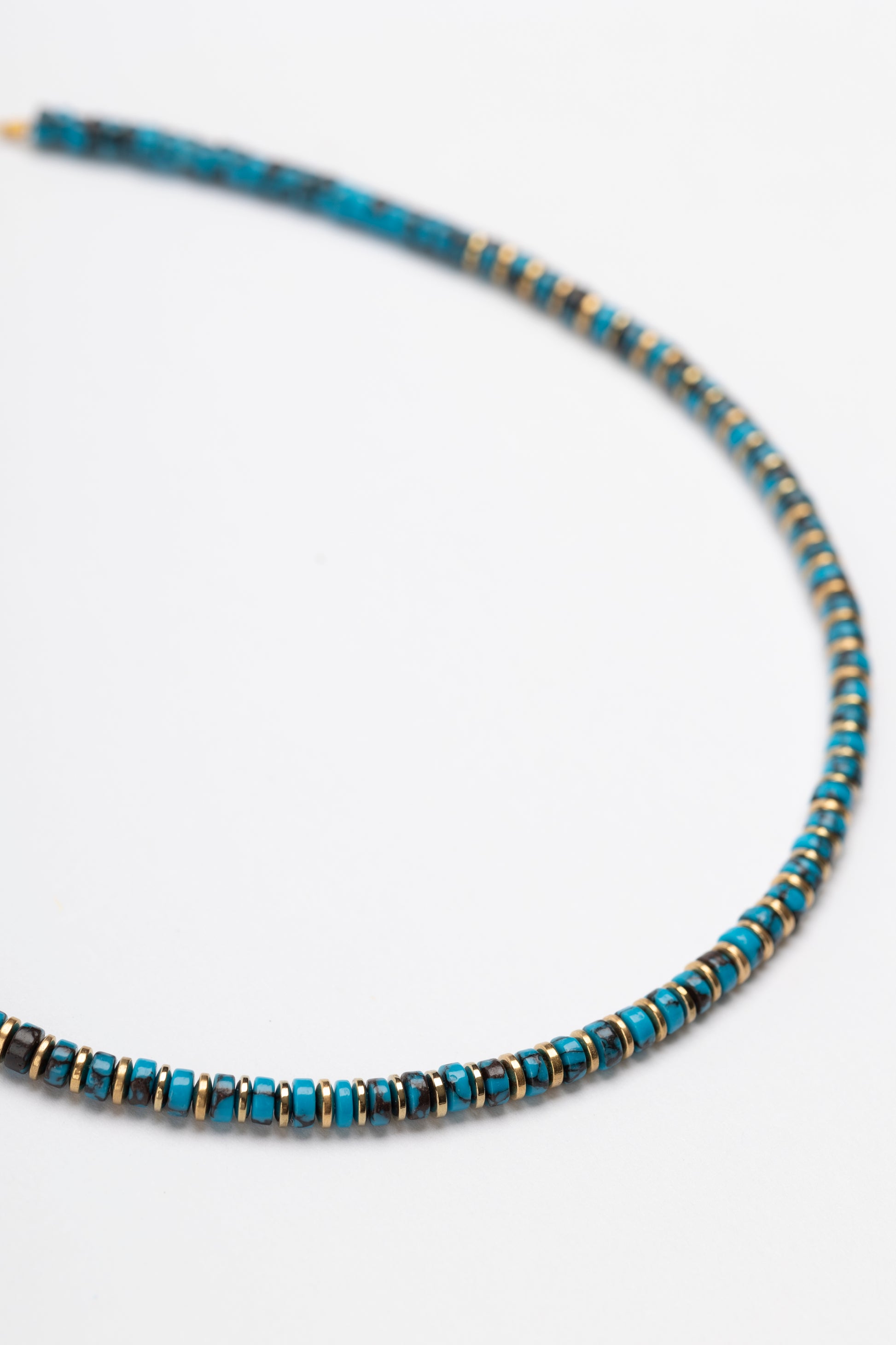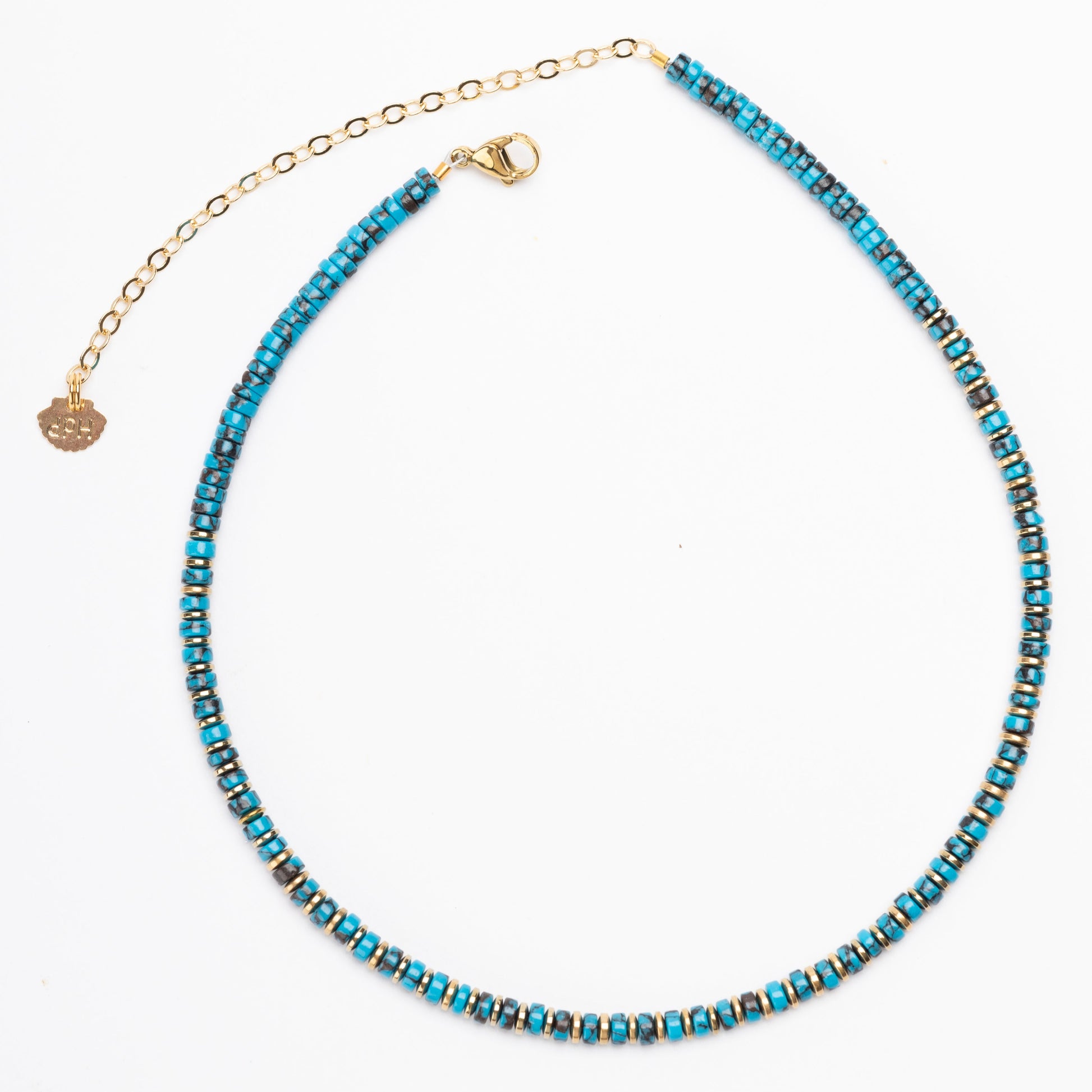 Turquoise Powder Bead Necklace with Golden Volcanic-Derived Hematite Rondelles and Adjustable Gold Plated Brass Cable Chain.
